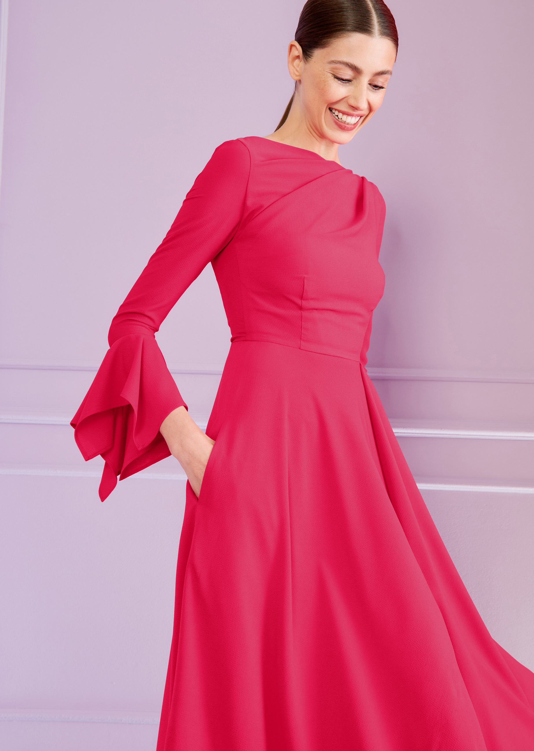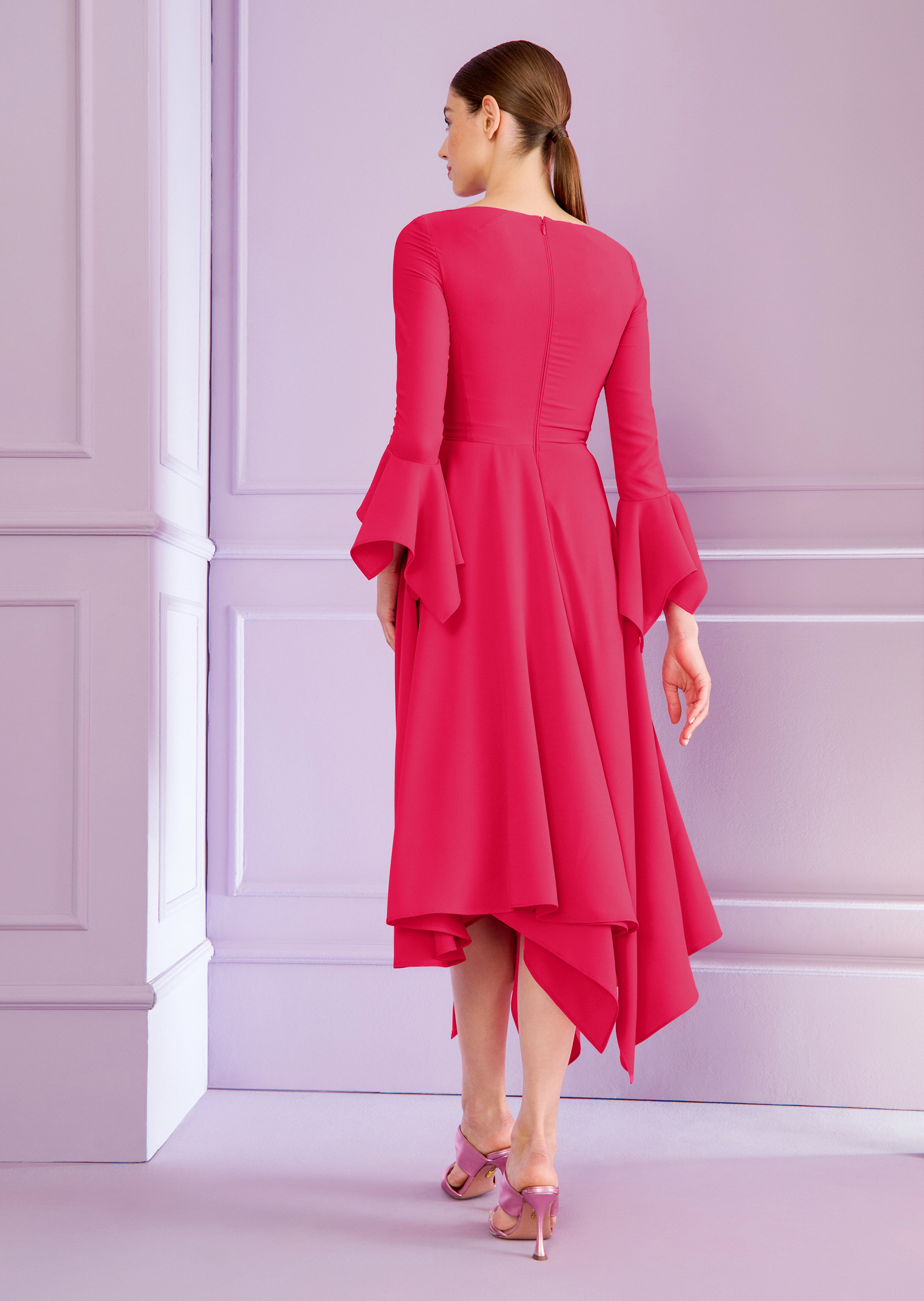 This midi dress combines lots of great features. It is casual yet elegant with a touch of high-end fashion. The upper section of this day dress is simple and elegant with a bateau neckline and soft draping. Wavy flounces on the mid-length sleeves guarantee an eye-catching look. The skirt section, in particular, makes a strong fashion statement. The asymmetric hem is playful yet high-end and extravagant. You can wear this midi dress for work during the daytime as well as for a glamorous evening event!