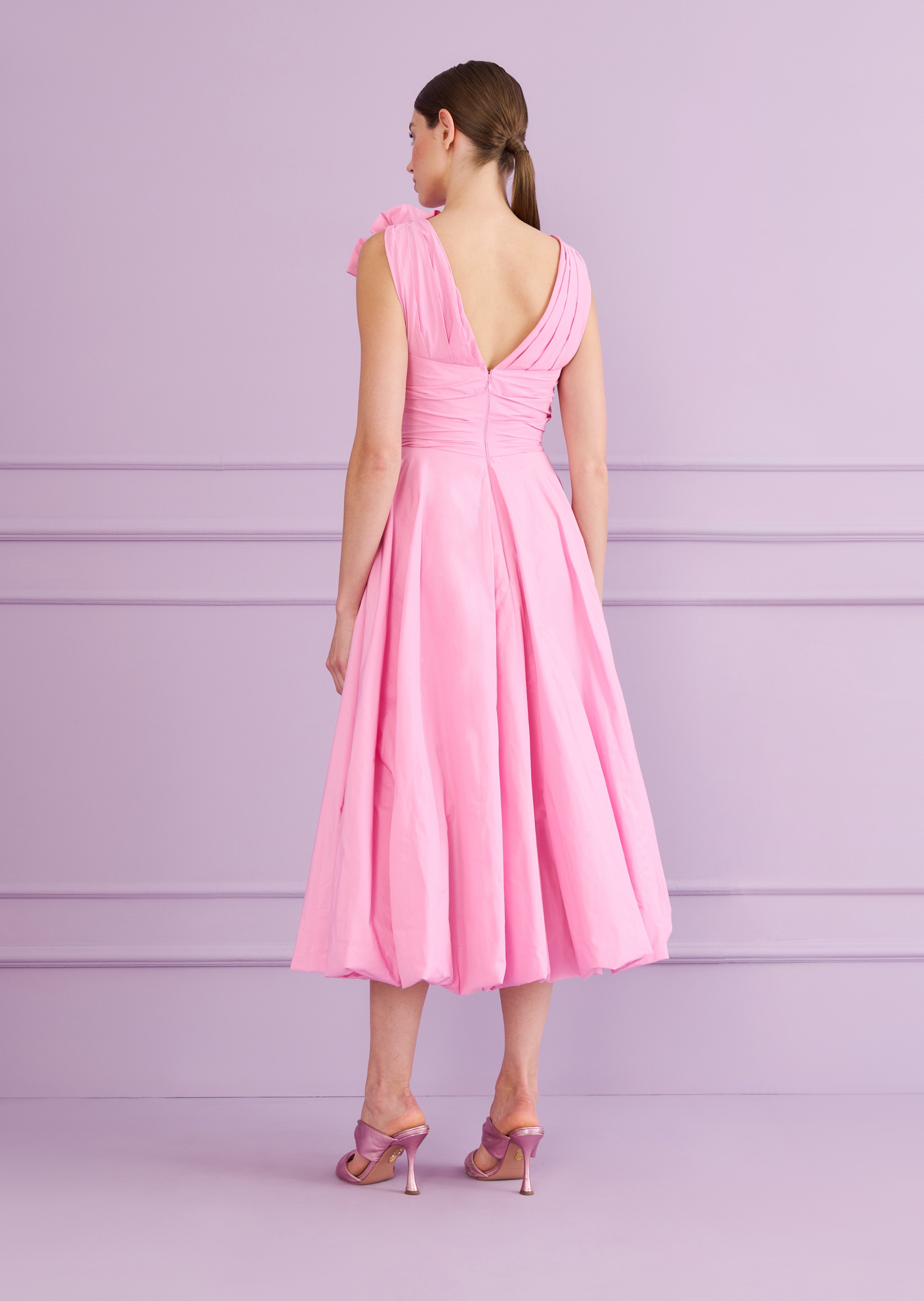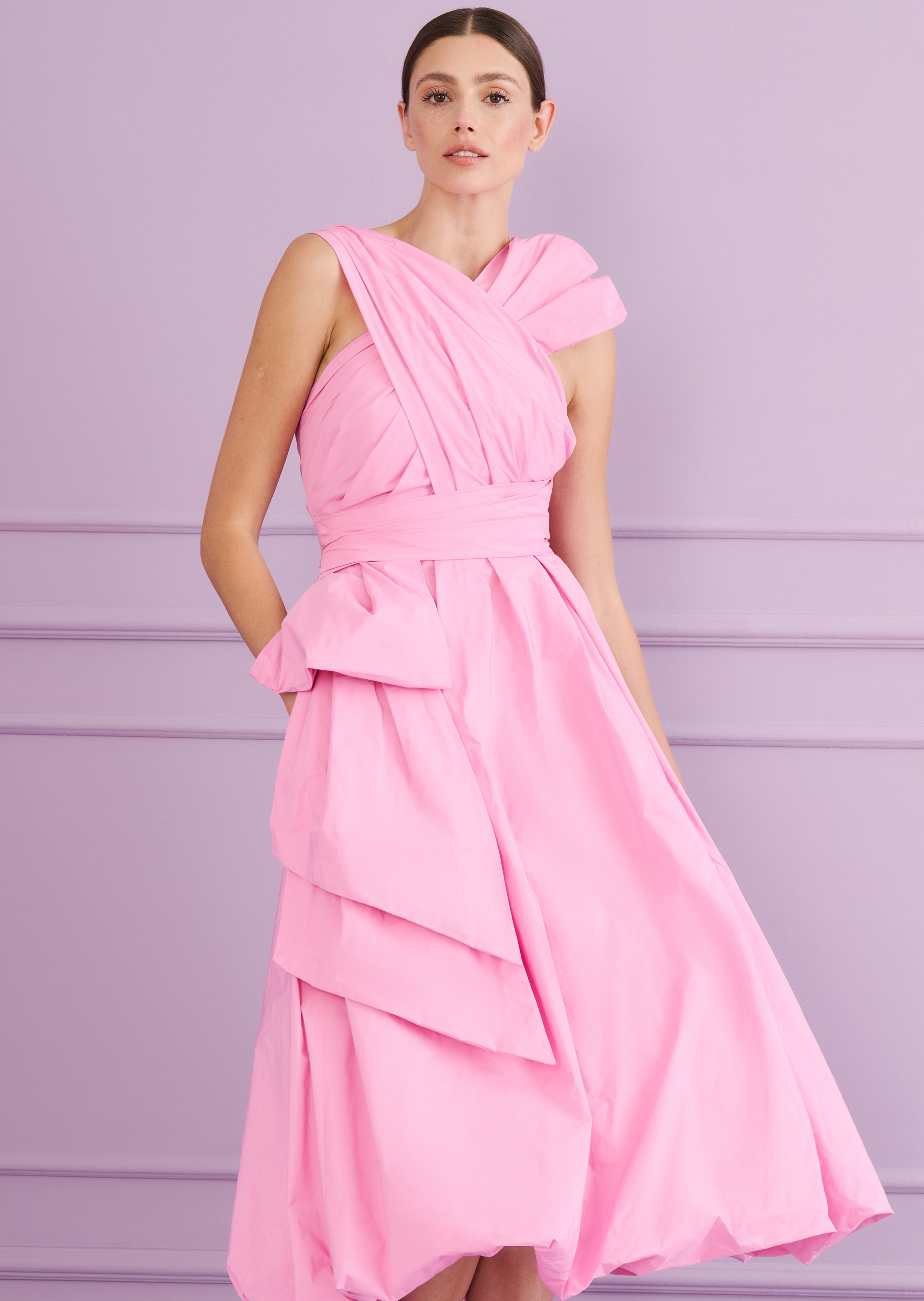 “Bowtiful Statenment”! An opulent bow is the focus of this exciting cocktail dress – and it’s certainly no accident! It features artistically constructed shapes and accentuates both the shoulder area and the slim waist. And the back of the dress is no less impressive! The tapered design gives the back a deeper, seductive look without showing too much skin. The airy midi-length balloon skirt ensures freedom of movement and guarantees fun on the dance floor at your next ball. Made of lightweight Memory Taffetas, this modern dress is a real highlight – perfect for unforgettable moments.