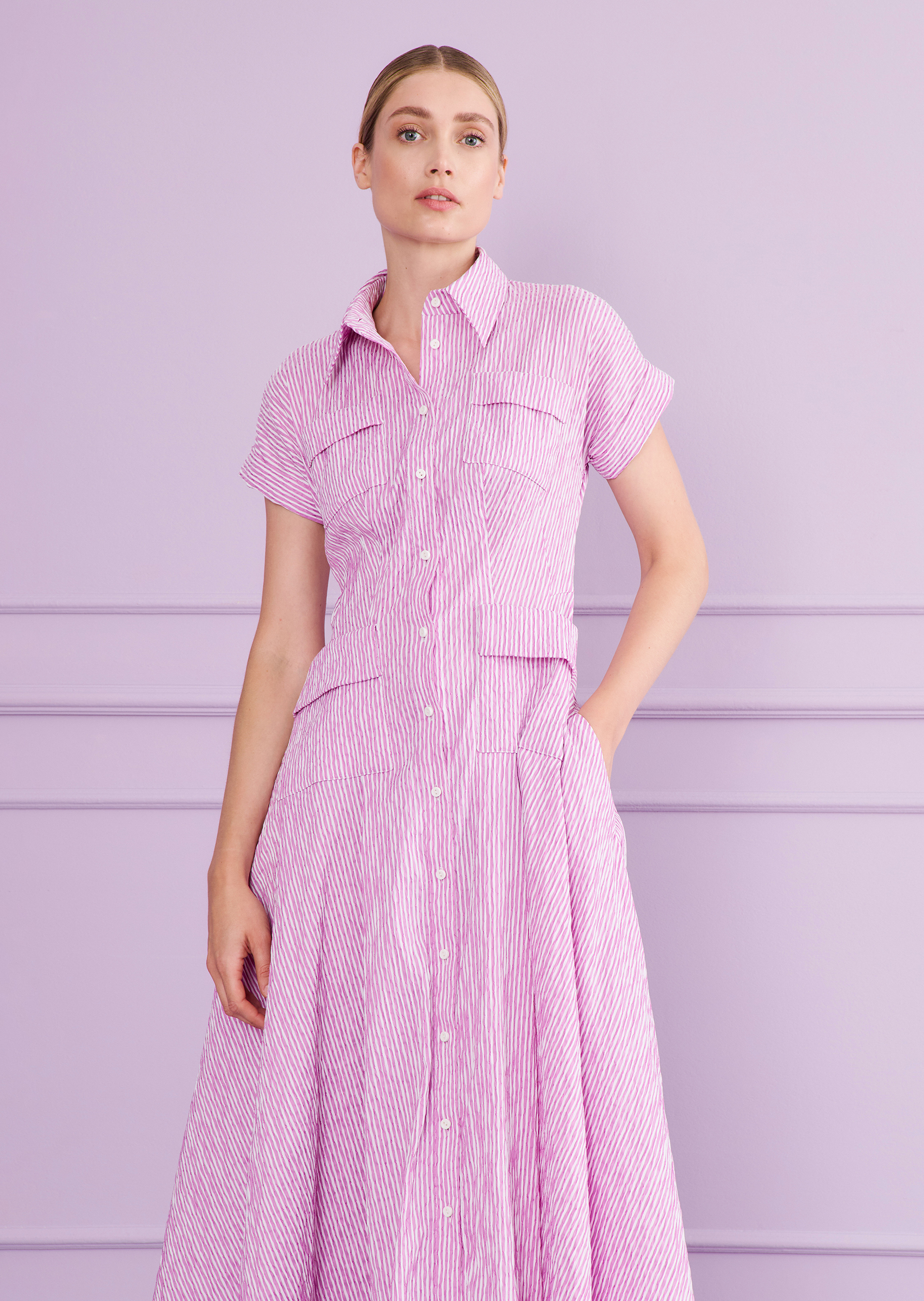 This midi dress in cotton piqué is made for high-performance style – thanks to thoughtful sporty details that give it a modern, laid-back twist. Dropped shoulders lend a relaxed feel, while the shirt collar and bold chest and side pockets emphasize the athletic character. The wide, midi-length skirt moves with feminine ease. With its full button placket, you can wear it buttoned up for a clean look or open at the neckline for a deeper décolleté – whatever the occasion calls for. We crafted this day dress from a soft, breathable seersucker that’s especially comfortable in warmer weather. Perfect for everyday wear and vacations!