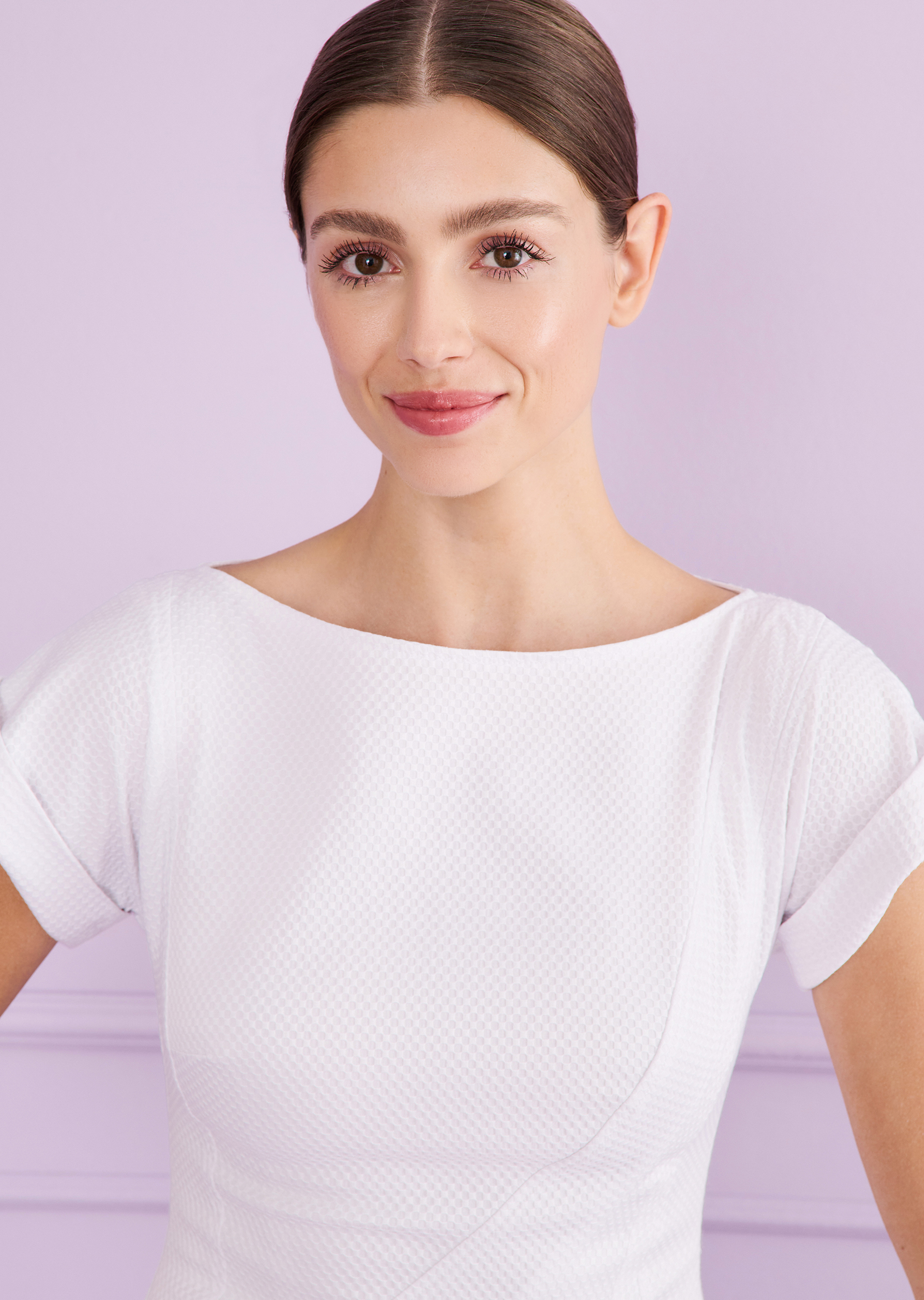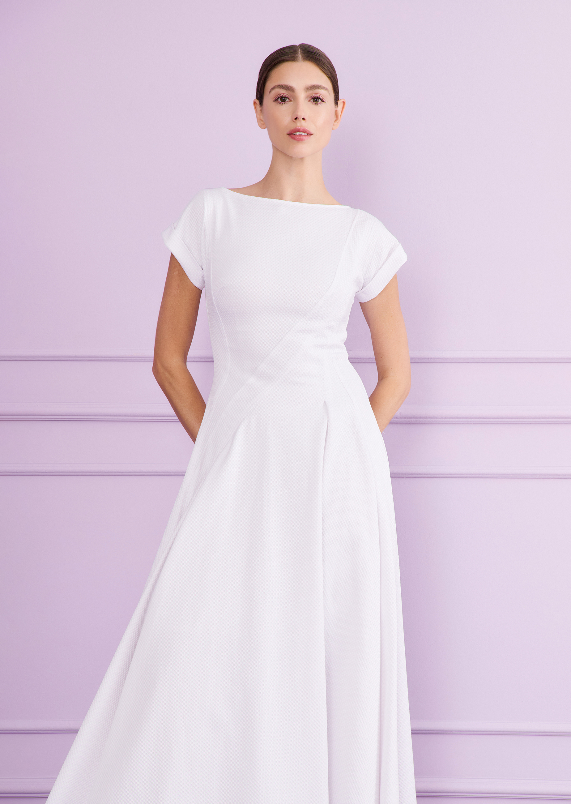 This midi dress drapes effortlessly along the body, combining comfort with understated style. Made from easy-care cotton piqué, it’s a truly versatile piece that transitions seamlessly throughout the day. A graceful bateau neckline and short, cut-on sleeves lend the dress a sporty elegance, while the cleverly constructed seams – almost like a puzzle – echo its soft, flowing silhouette. A timeless wardrobe staple, ready to be reimagined: wear it clean and minimal with a ponytail and sandals, or elevate the look with statement heels and bold jewelry.