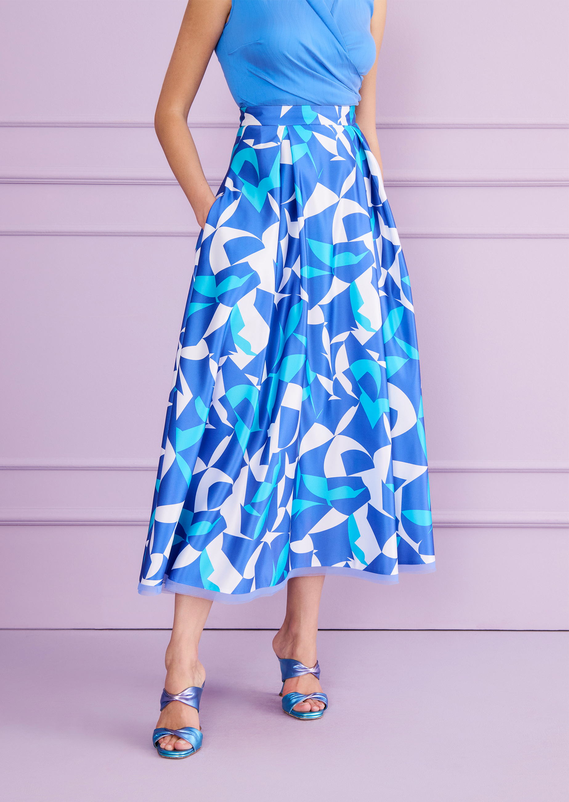 This versatile silhouette creates a “new look” every time. The wide midi skirt has a 50’s vibe. It’s super feminine, yet oh so modern. The fabric alone, a shiny duchesse with a modern patter, not just drapes wonderfully but also is incredibly eye-catching. And the number of styling possibilities! It’s cool paired with a sweater, cozy with a lightweight knit, casual with a loose-fitting T-shirt and statement heels, and channels Diane Keaton chic teamed with a men’s white shirt and pumps or ballerinas.