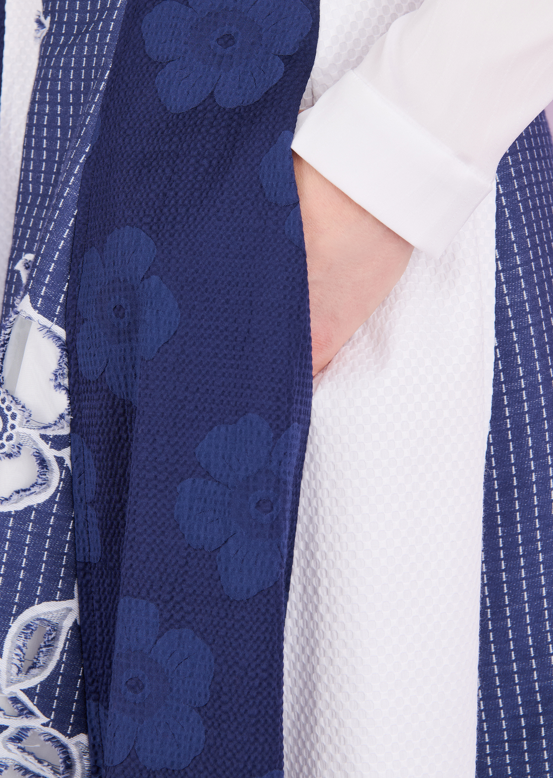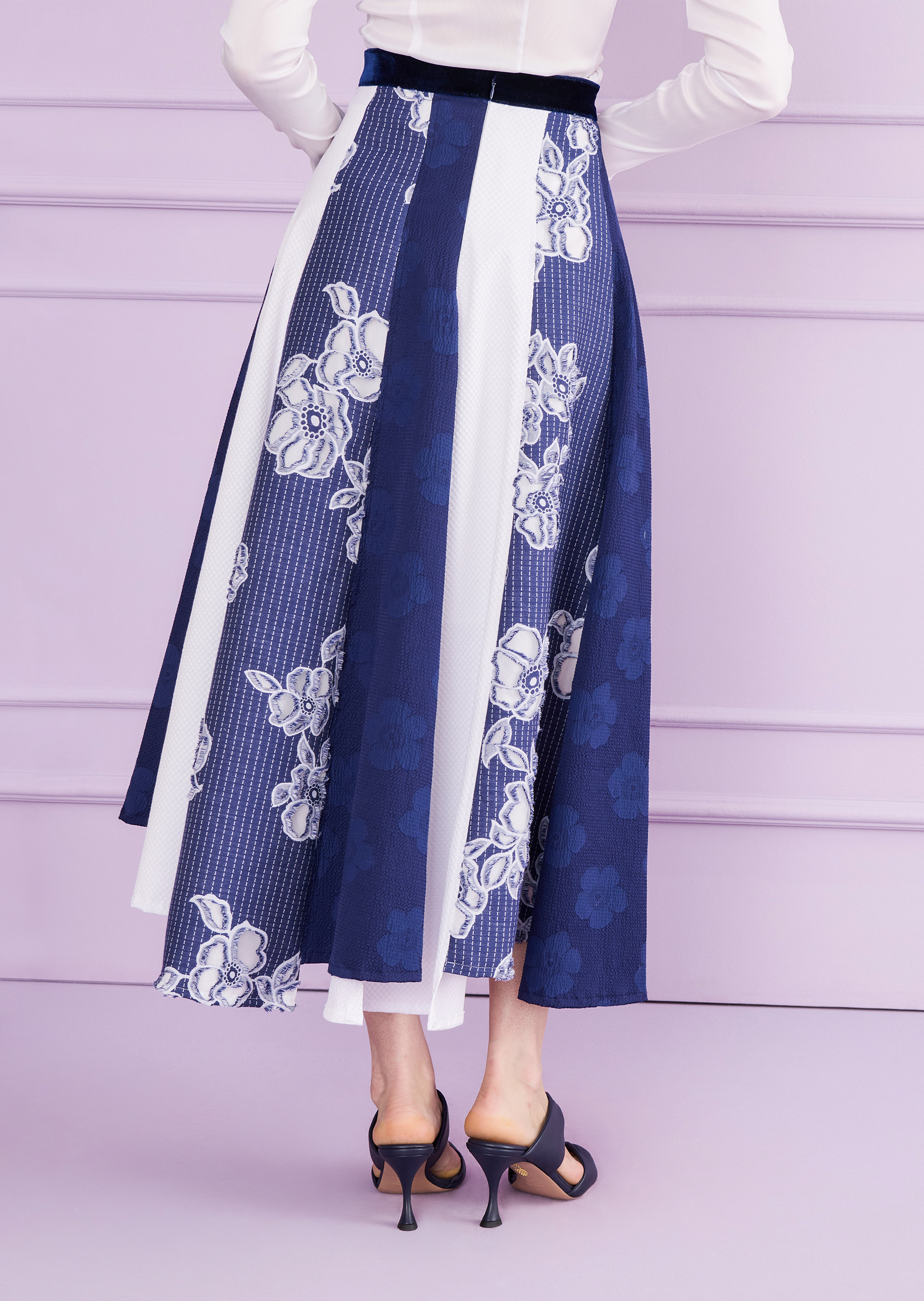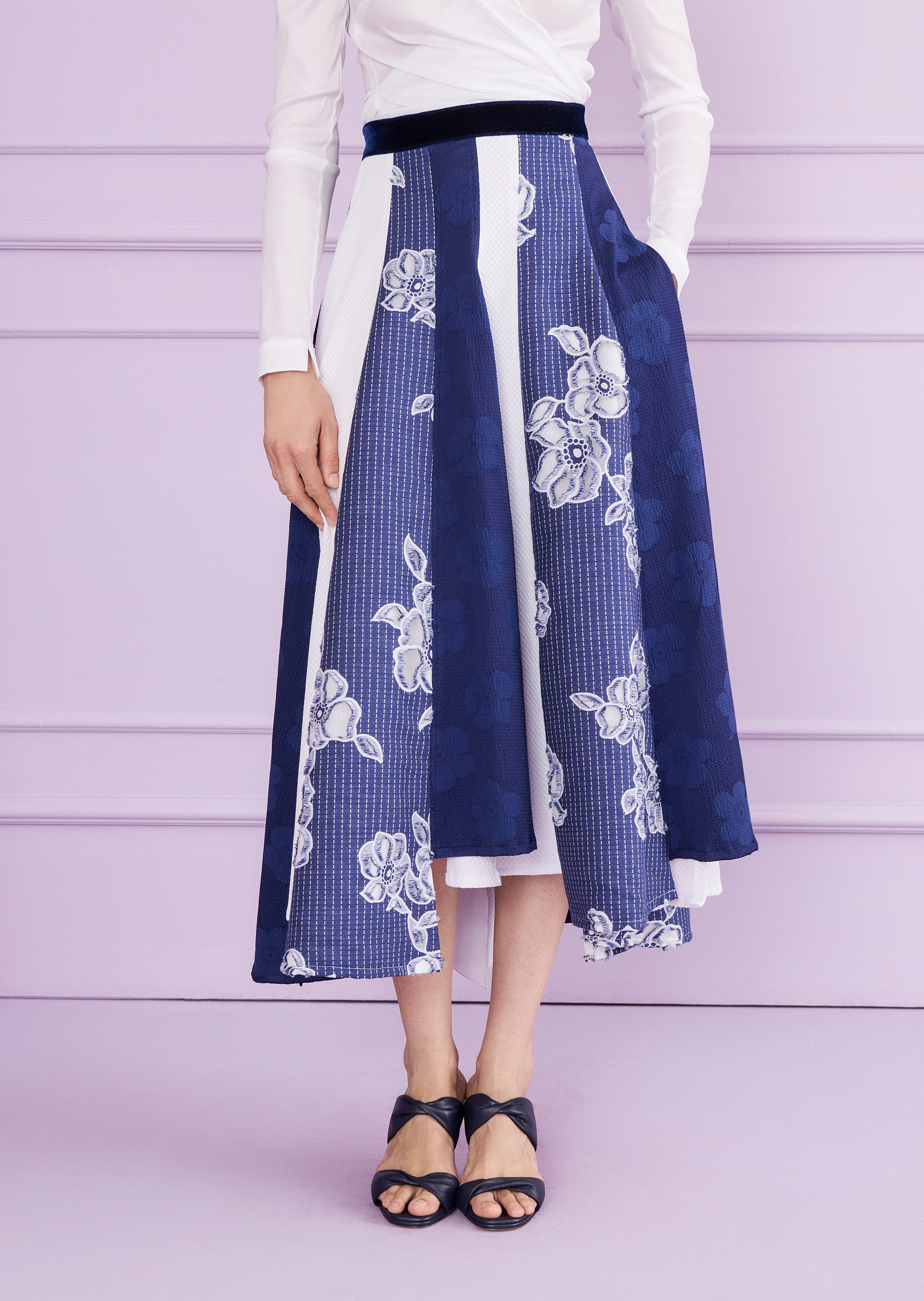 This midi skirt will set your style on the right track – quite literally, as it's made from carefully chosen fabric panels. Pieced together in varying lengths, it creates a striking, irregular hem that gives this statement skirt its unique flair. The bold mix of materials also stands out: three distinctive fabrics meet here – from casual cotton waffle piqué to refined daisy jacquard. Whether styled with a tee or light knit by day or paired with dressier pieces in the evening, this skirt is as versatile as it is eye-catching.