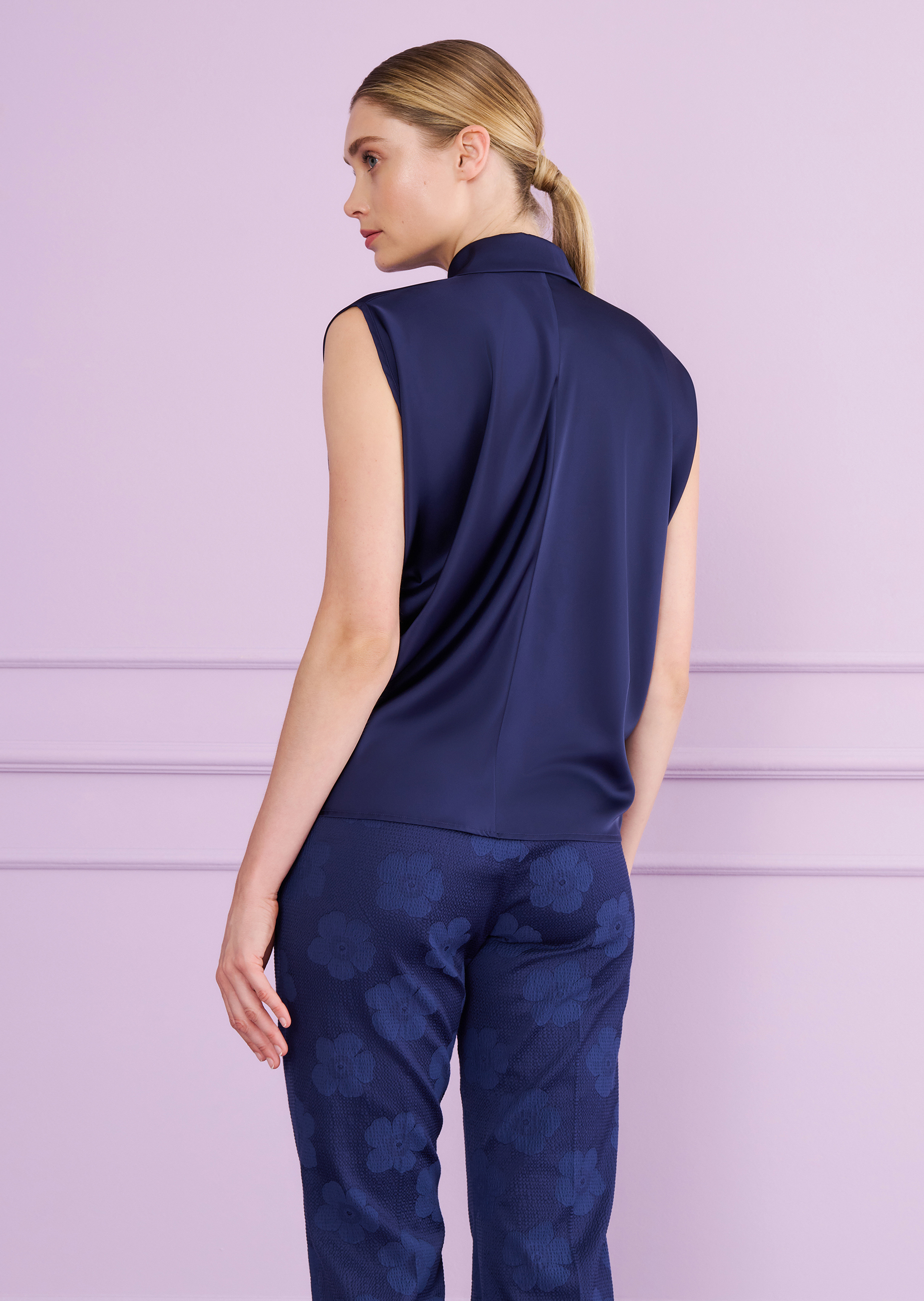 our sleeveless blouse will make an impact with its flowing voile satin fabric. you can wear this sleeveless top, featuring a button placket and classic collar, to the office or even with a midi skirt to the next gallery opening. the funnel cut is loose, so you can easily tuck this top into your pants or skirt. whether with jeans or more elegant fabrics, during the day or in the evening – styling this piece is easy, yet always looks artfully done.