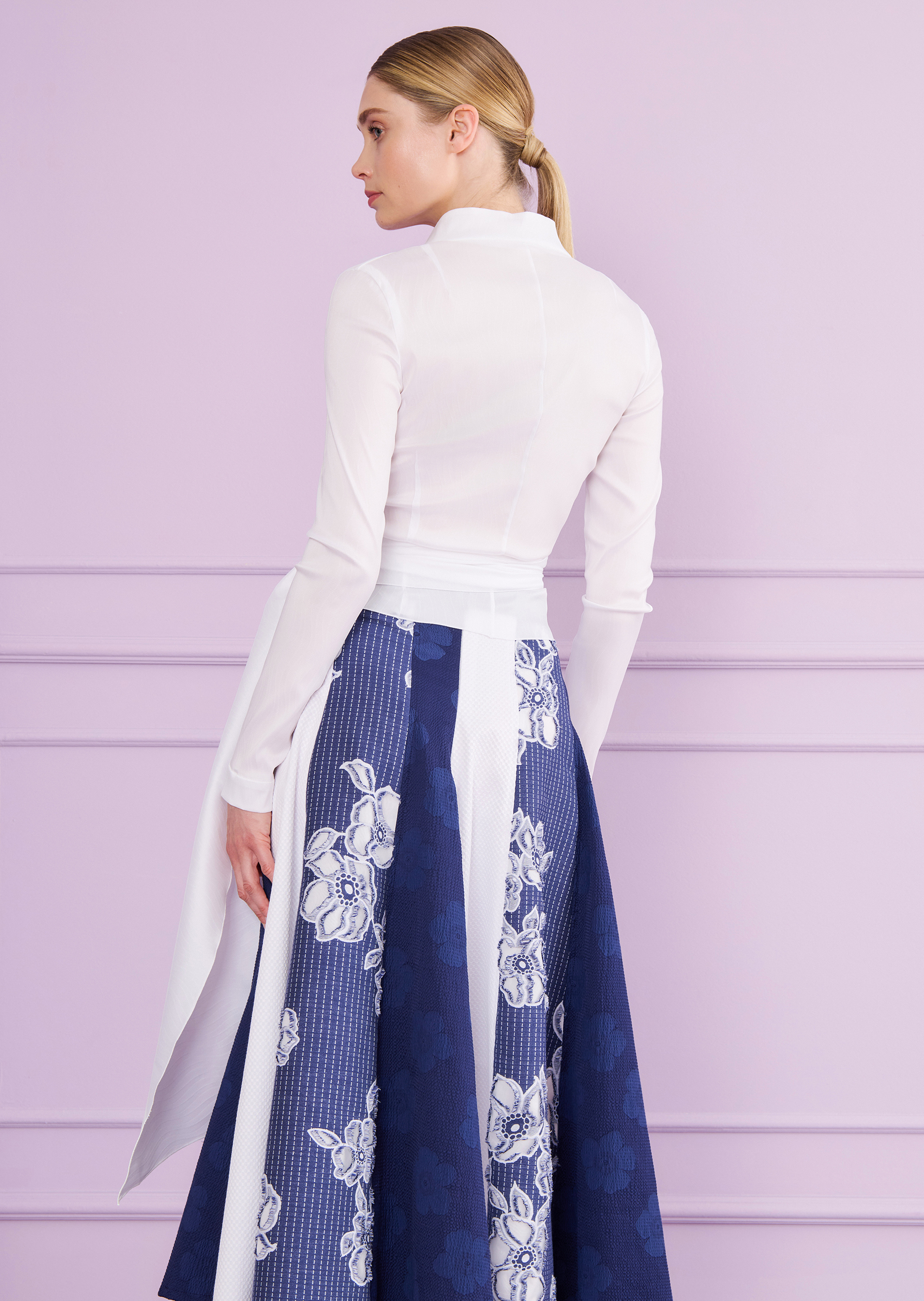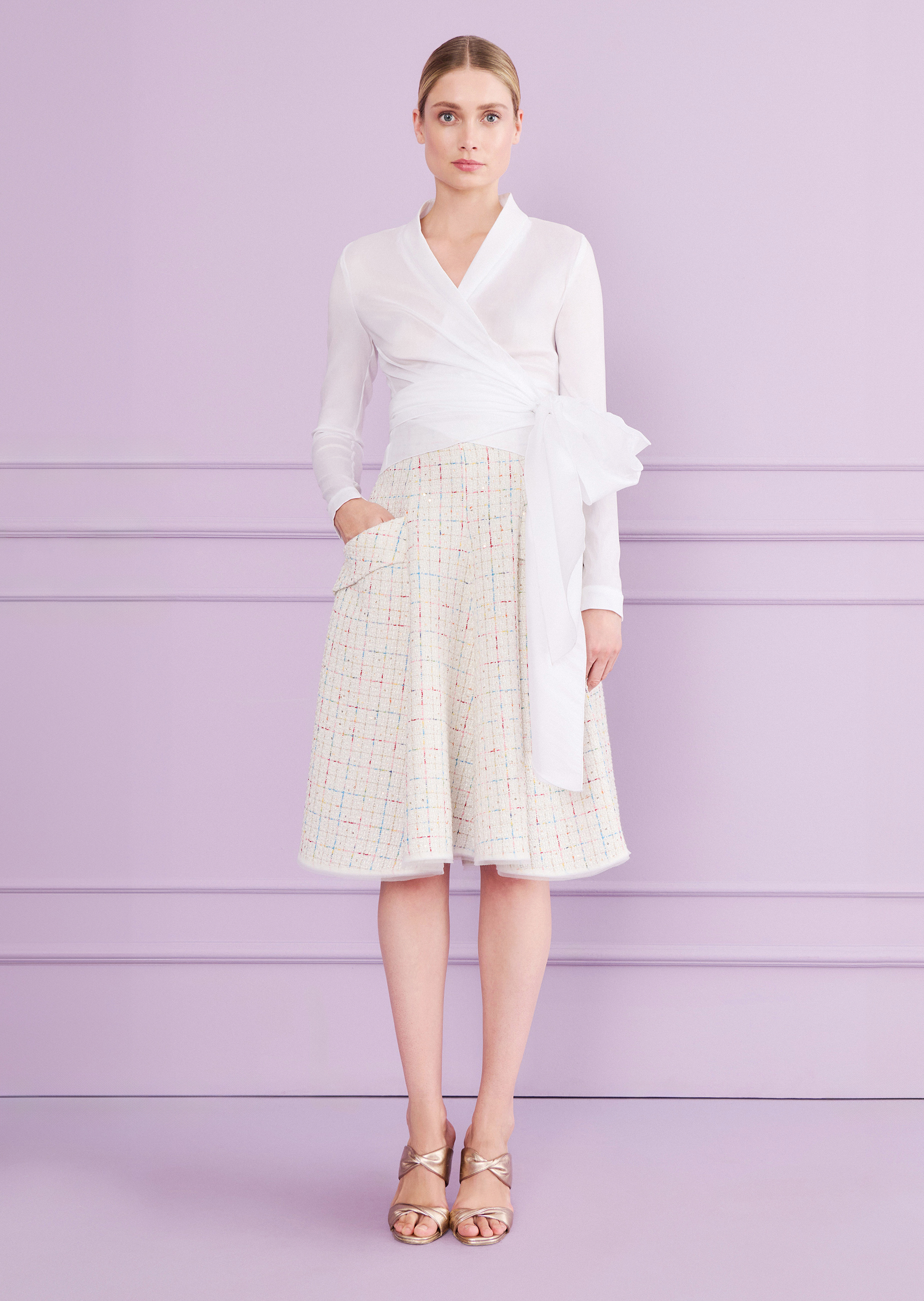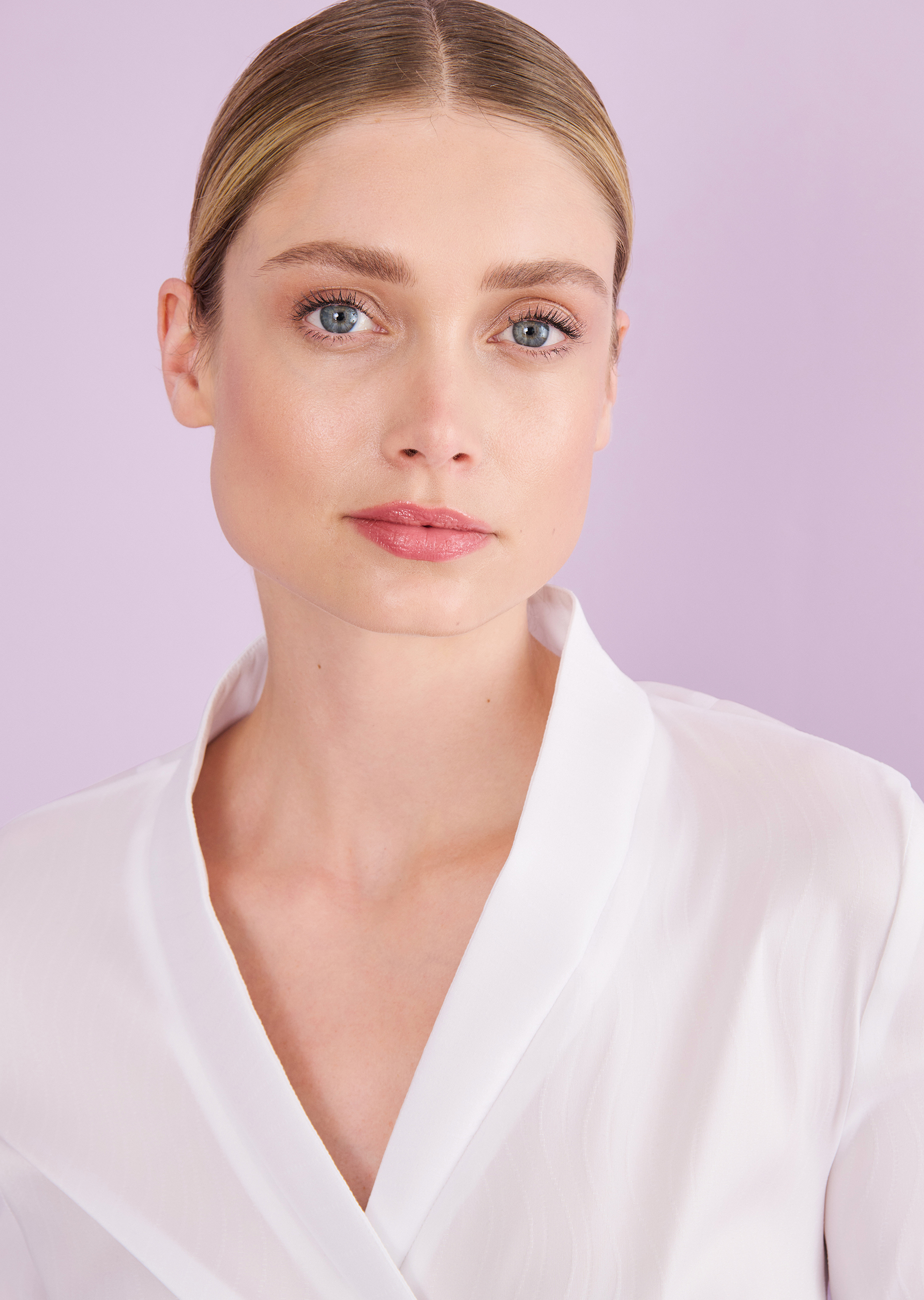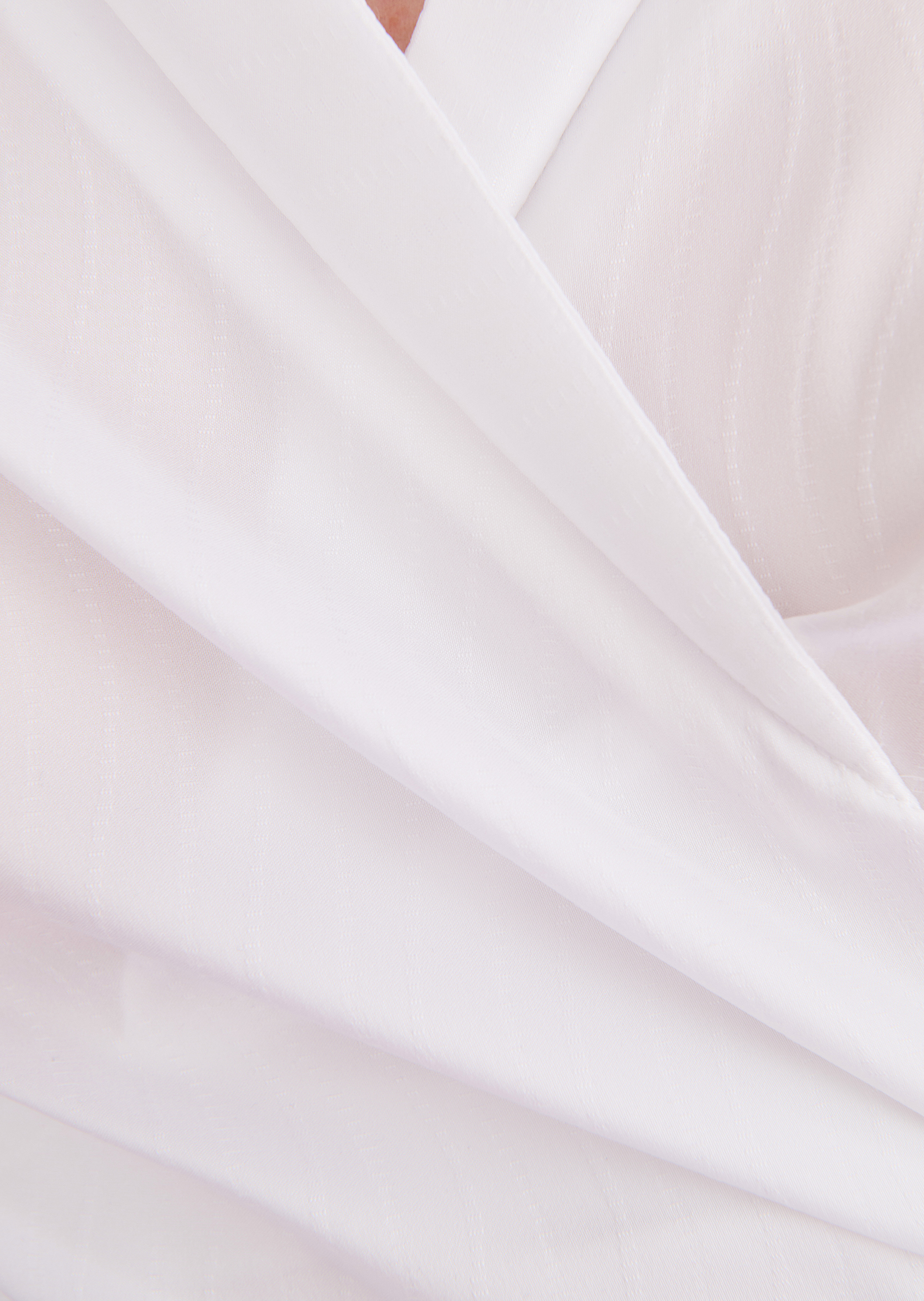 The simple wrap-over cut of this long-sleeved blouse looks flattering on absolutely any figure. Laced tightly at the waist, its gathers give every woman an hourglass figure. We designed this top in a beautiful, pleasantly lightweight stretch taffeta fabric. As your new favorite piece, you can easily style it with a casual pair of jeans for everyday wear or with a chic skirt for an evening out.
