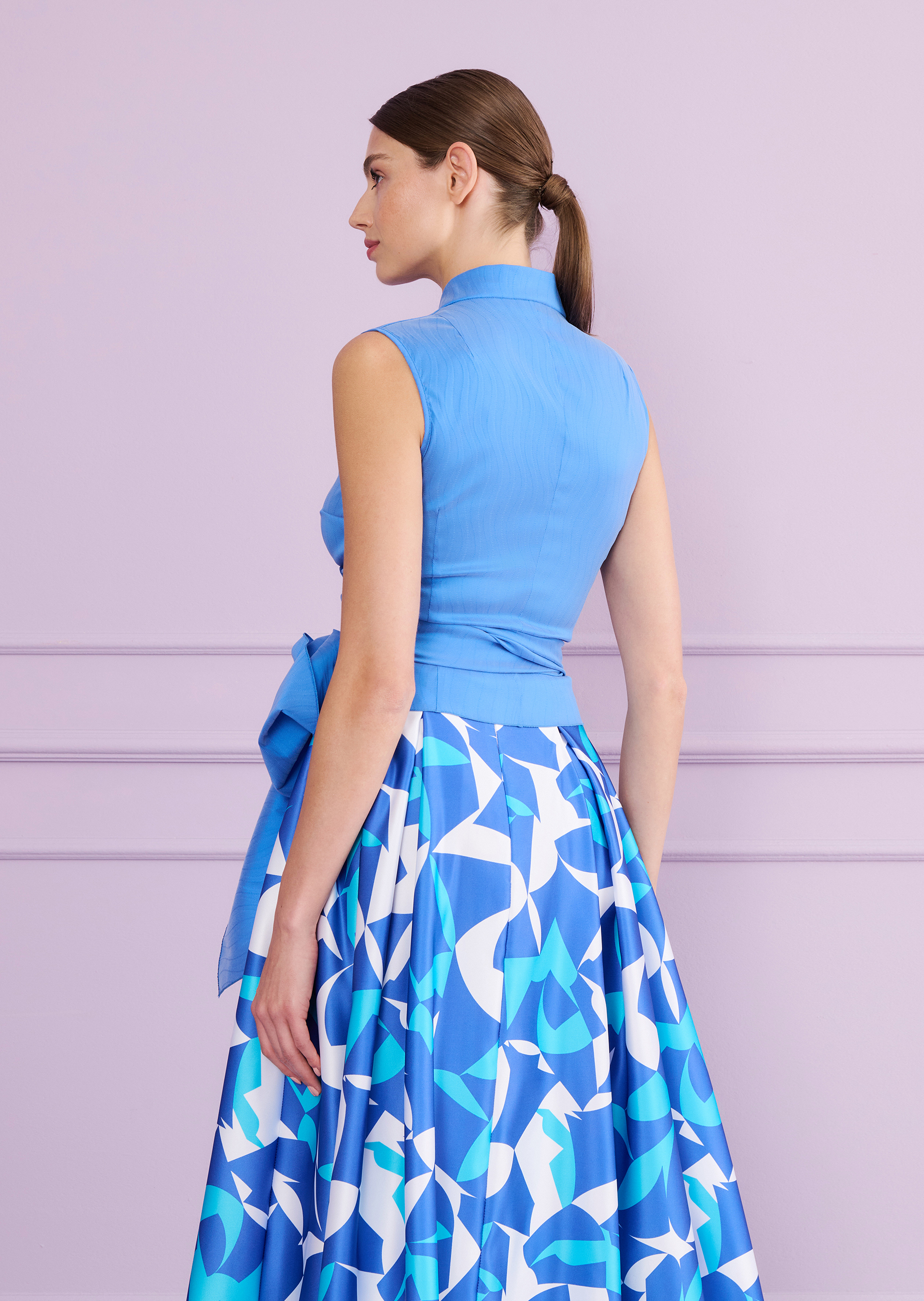 With a fabric that is manufactured exclusively for Talbot Runhof in a family business in Como, the Italian city of silk, this sleeveless wrapover blouse with a bow detail made of silk stretch taffeta is light as a feather and flatters every figure. Laced tightly at the waist, its gathers conjure up an hourglass figure for every woman. It works with a simple pair of jeans for everyday wear as well as a chic skirt in the evening.