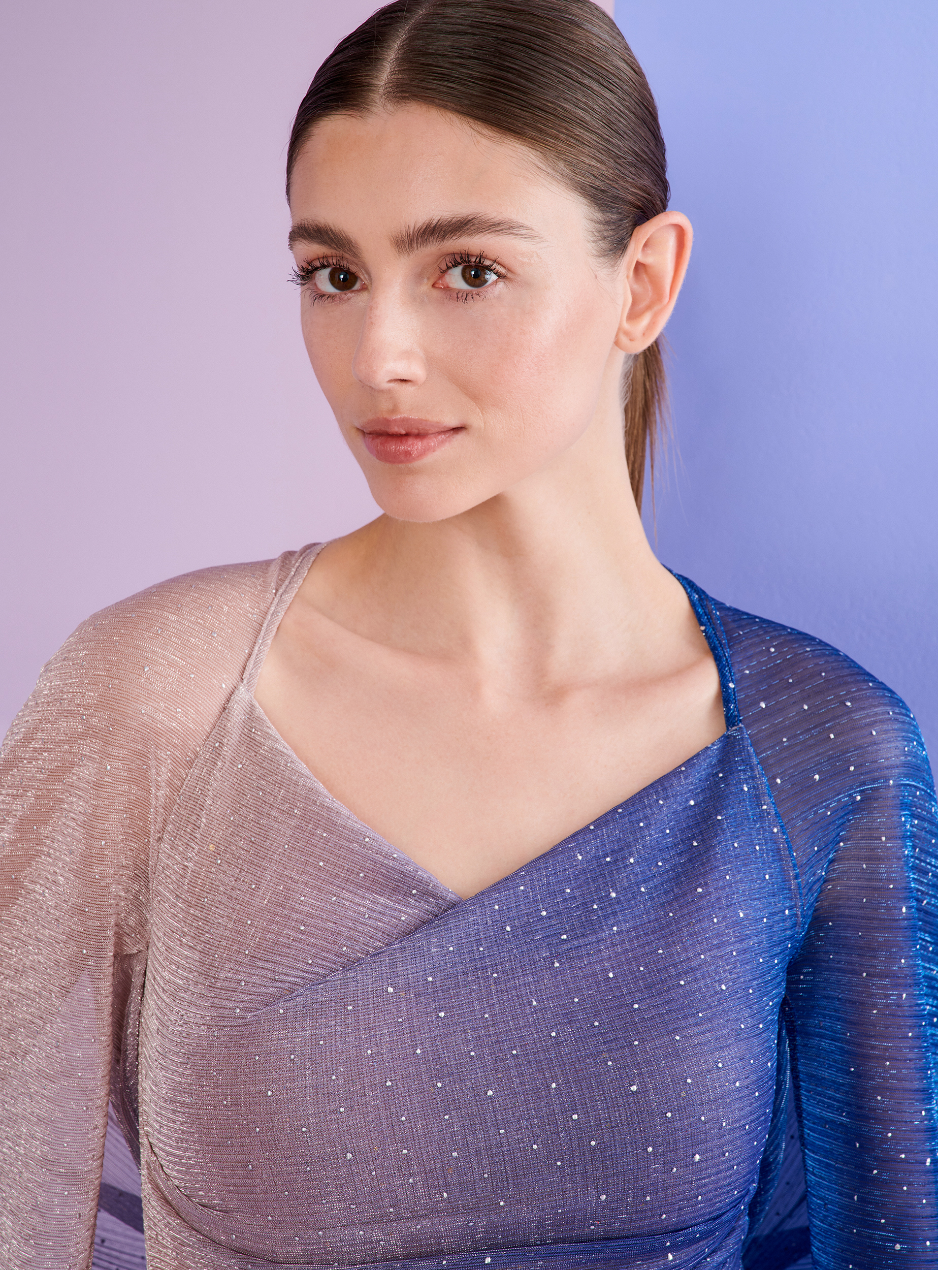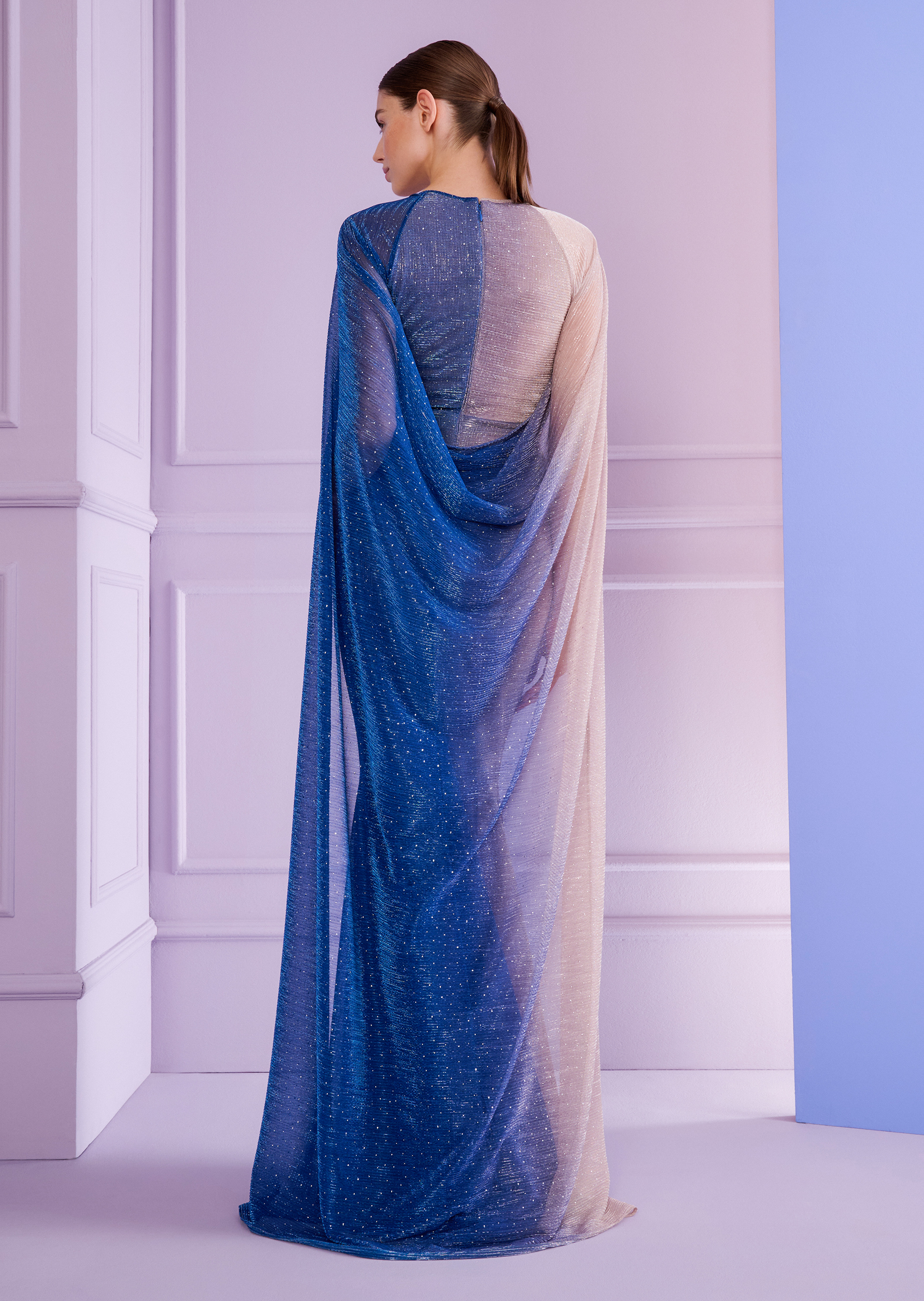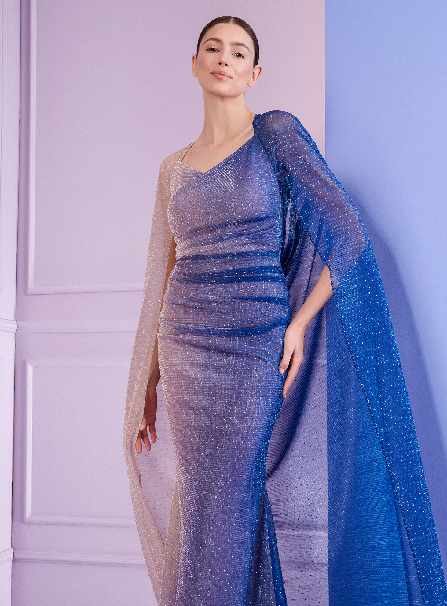 It’s time to celebrate! After all, if you’ve got a big, festive gala coming up, it’s the perfect occasion to go all out with your look. This evening gown is designed to help you do just that, with ease. Although the fabric, a flowing voile degradé, is already pretty elegant simple, the details of the cut provide plenty of glamor. From the sexy, draped silhouette that hugs your curves perfectly, to the subtle, beautiful neckline, to, most importantly, the artfully draped cape that eliminates the need for sleeves and stoles. Simply style it with a sparkling necklace and you’ll be the star of every red carpet in the world!