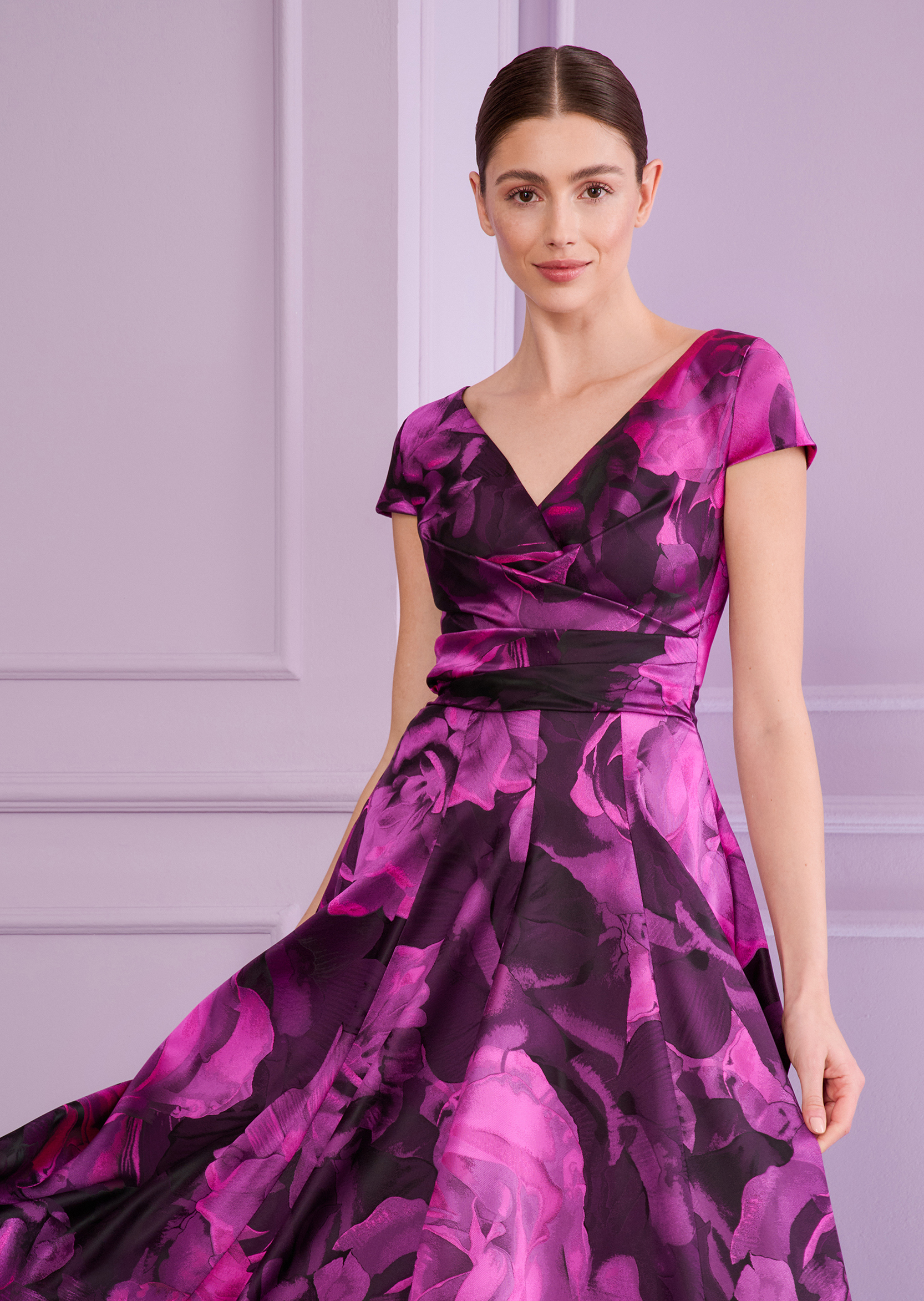 Femme “faltale”! Hier haben wir einen wunderschön femininen, sexy Ausschnitt gefaltet. Die aufwendige Drapage hat es hier aber auch wirklich in sich. Und so verfehlt dieses mondäne Abendkleid seine Wirkung nicht. Elegant und super schick weiß es auch mit einer schmalen Taille und einem schwingenden weiten Rock zu überzeugen. Gerade dieser fließt in diesem luxuriösen Jacquard besonders schön. Ein Kleid, mit dem Sie überall Eindruck machen, ob beim Captain's Dinner auf der Kreuzfahrt, der Red Carpet Gala, oder der Premiere in Bayreuth, Salzburg & Co.