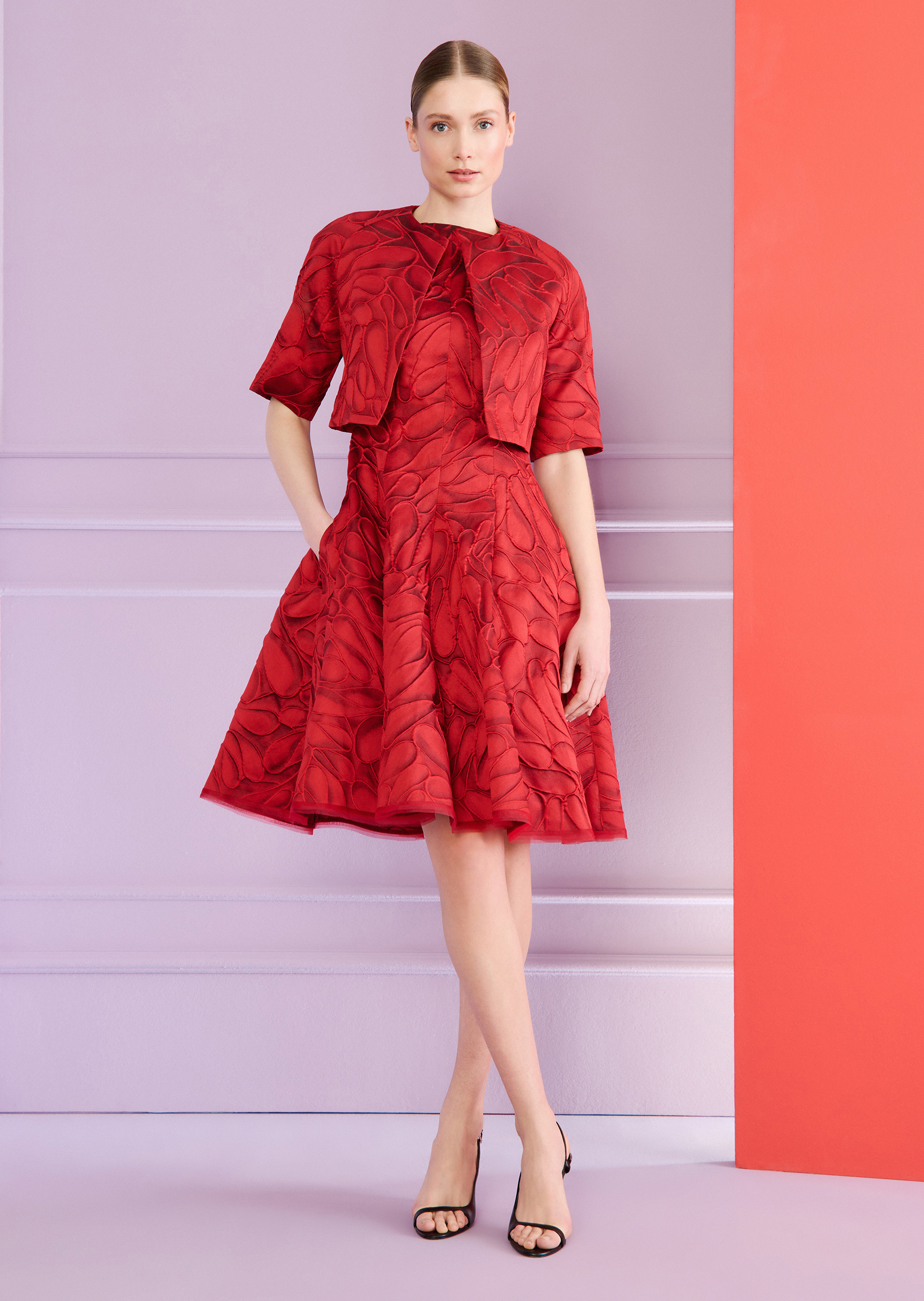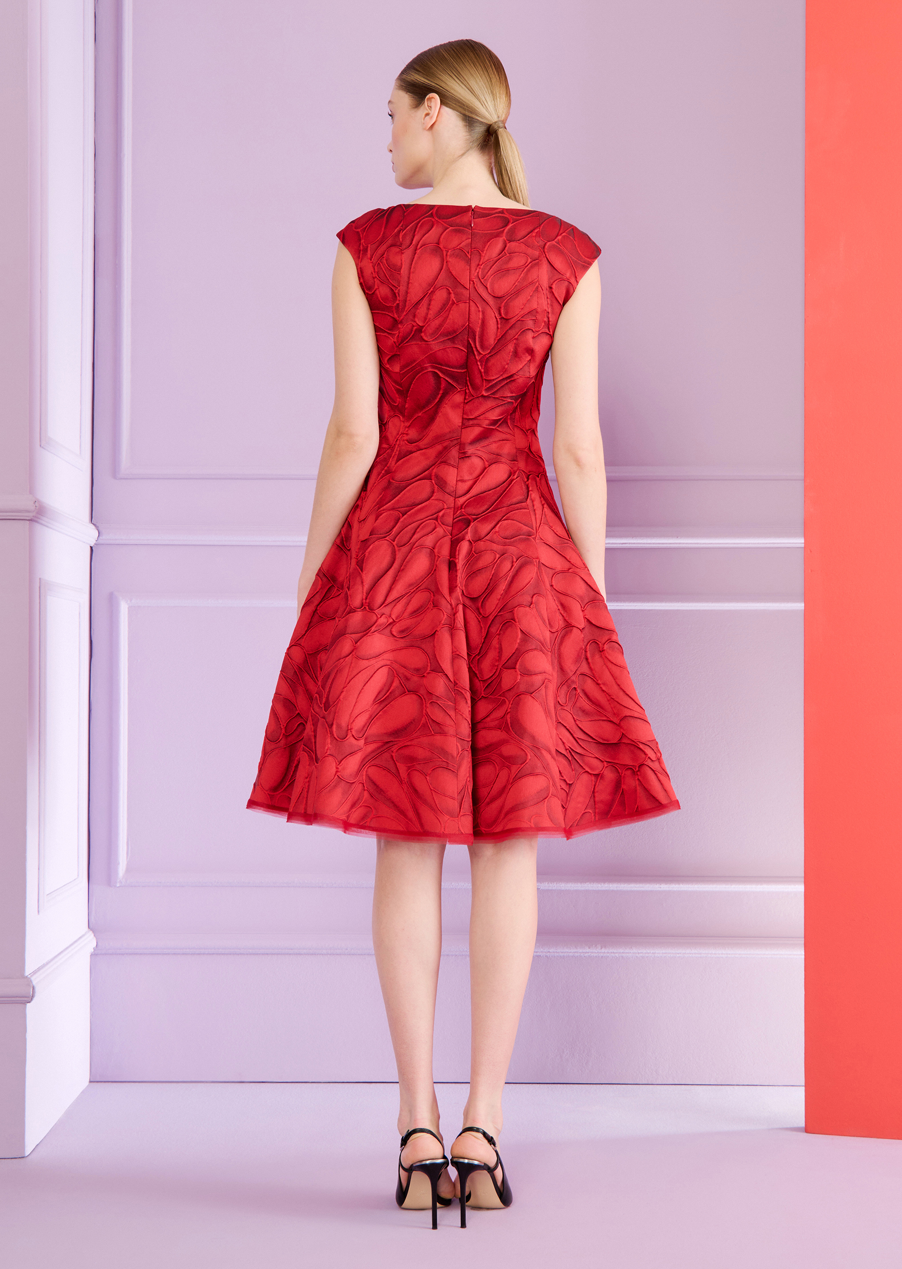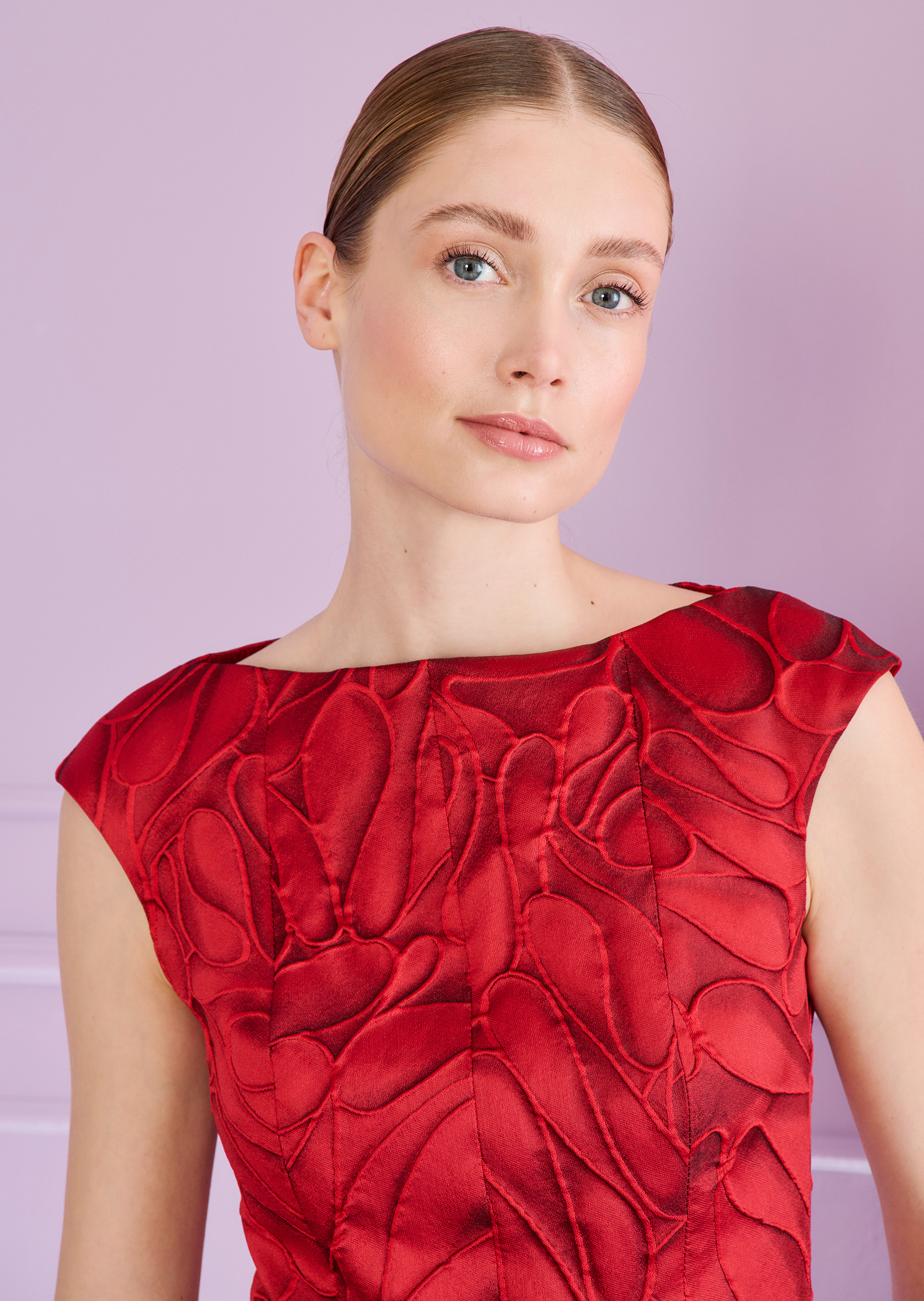Bereit für einen glamourösen Auftritt? Mit diesem Cocktailkleid sagen Sie nicht nur "Hallo", sondern "Here I am!" Die Fit & Flare-Silhouette sorgt für eine traumhafte Taille, während der knielange Rock schwungvoll mit Ihnen durch den Abend tanzt – perfekt für alle, die gerne ein bisschen Extra-Dramatik ins Spiel bringen. Der hochgeschlossene U-Boot-Ausschnitt verleiht Ihnen die Eleganz einer Diva, während der dezente Capsleeve Ihre Schultern perfekt in Szene setzt. Der rote Jacquard-Stoff schreit dezent „Luxus“, ohne dabei zu übertreiben – also genau wie Sie! Ob auf einer Party, einem Event oder einfach nur, um Ihren Kleiderschrank neidisch zu machen, dieses Kleid ist immer die richtige Wahl.