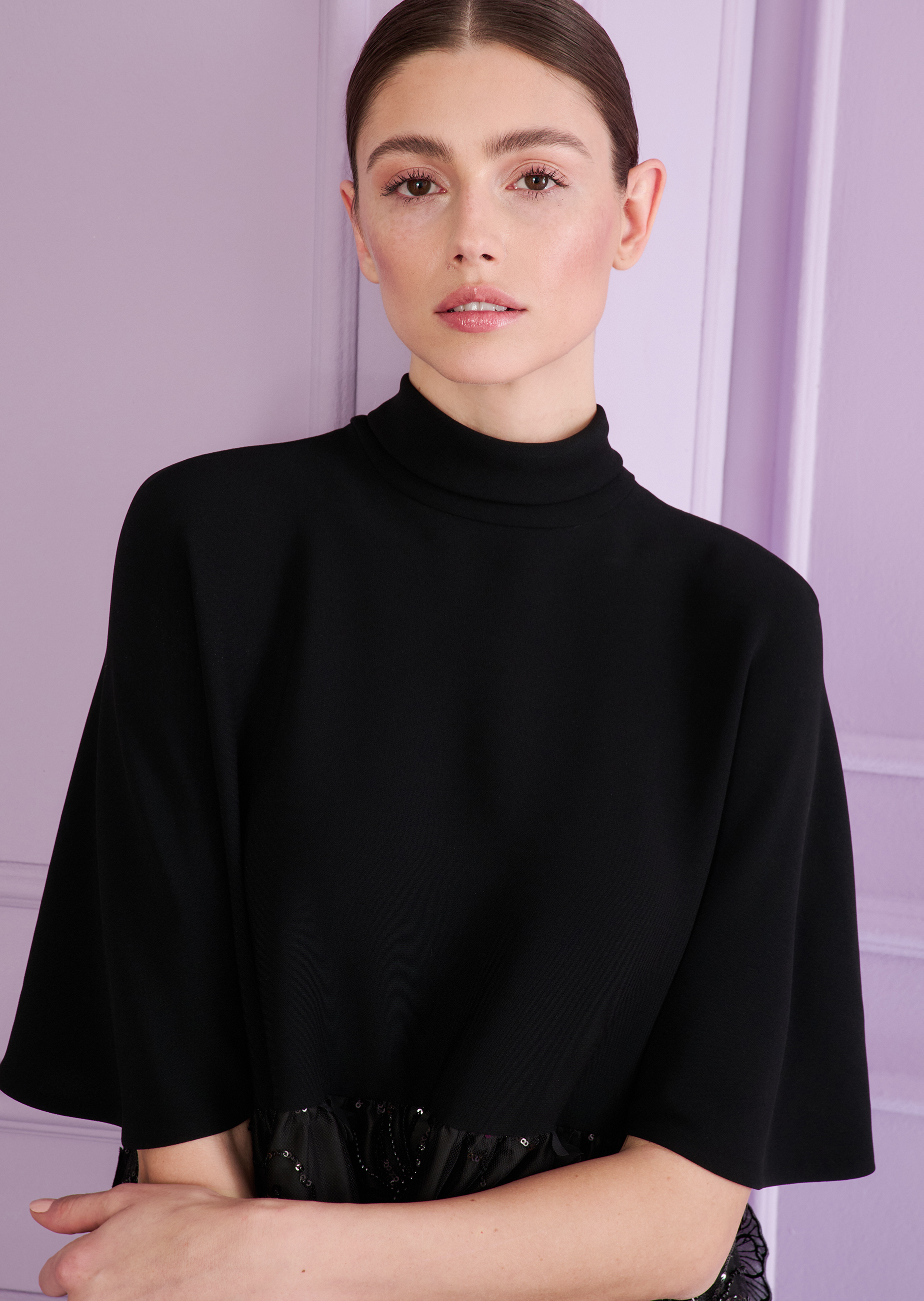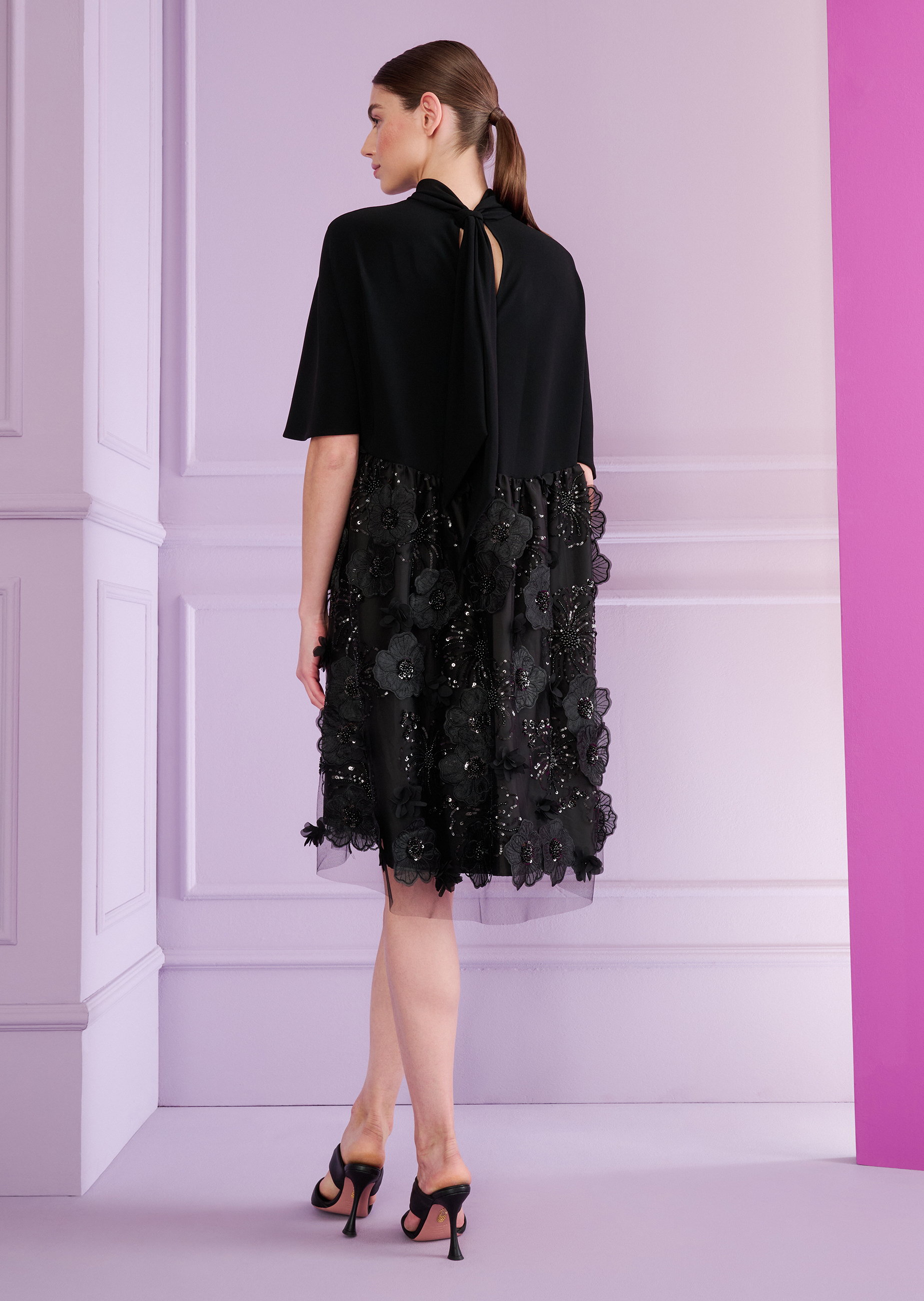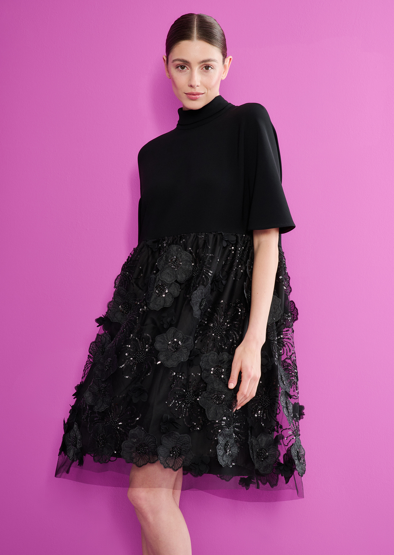 Dieses Loose Fit Cocktailkleid mit Stehkragen und Schluppe wird Ihnen einen Abend voller Leichtigkeit bescheren, schon allein durch die beiden Materialien, die wir hier miteinander kombiniert haben. Das Oberteil wurde aus einem unkomplizierten Cady gefertigt, der Rock aus einem floral bestickten Tüll, der nicht nur leicht, sondern auch sehr elegant wirkt. Der Designspaß kommt hier aber natürlich auch durch den außergewöhnlichen Schnitt ins Spiel. Das Schnittteil im Oberkörper wird so kunstvoll konstruiert, dass sich ein kurzer Ärmel ergibt. Viel Weite sorgt für Luftigkeit und Modernität. Super mit Sandaletten, aber auch toll mit flachen Ballerinas.