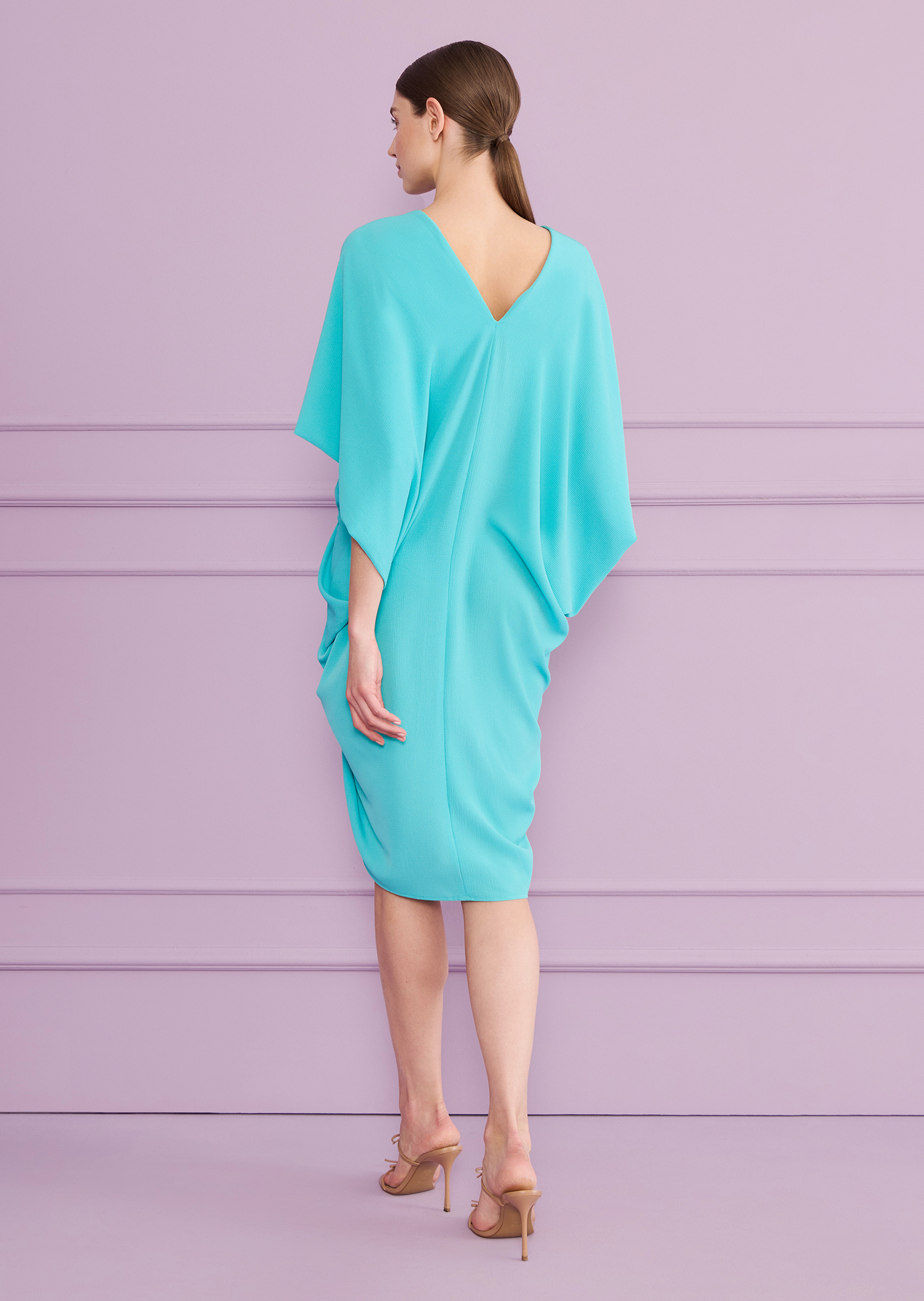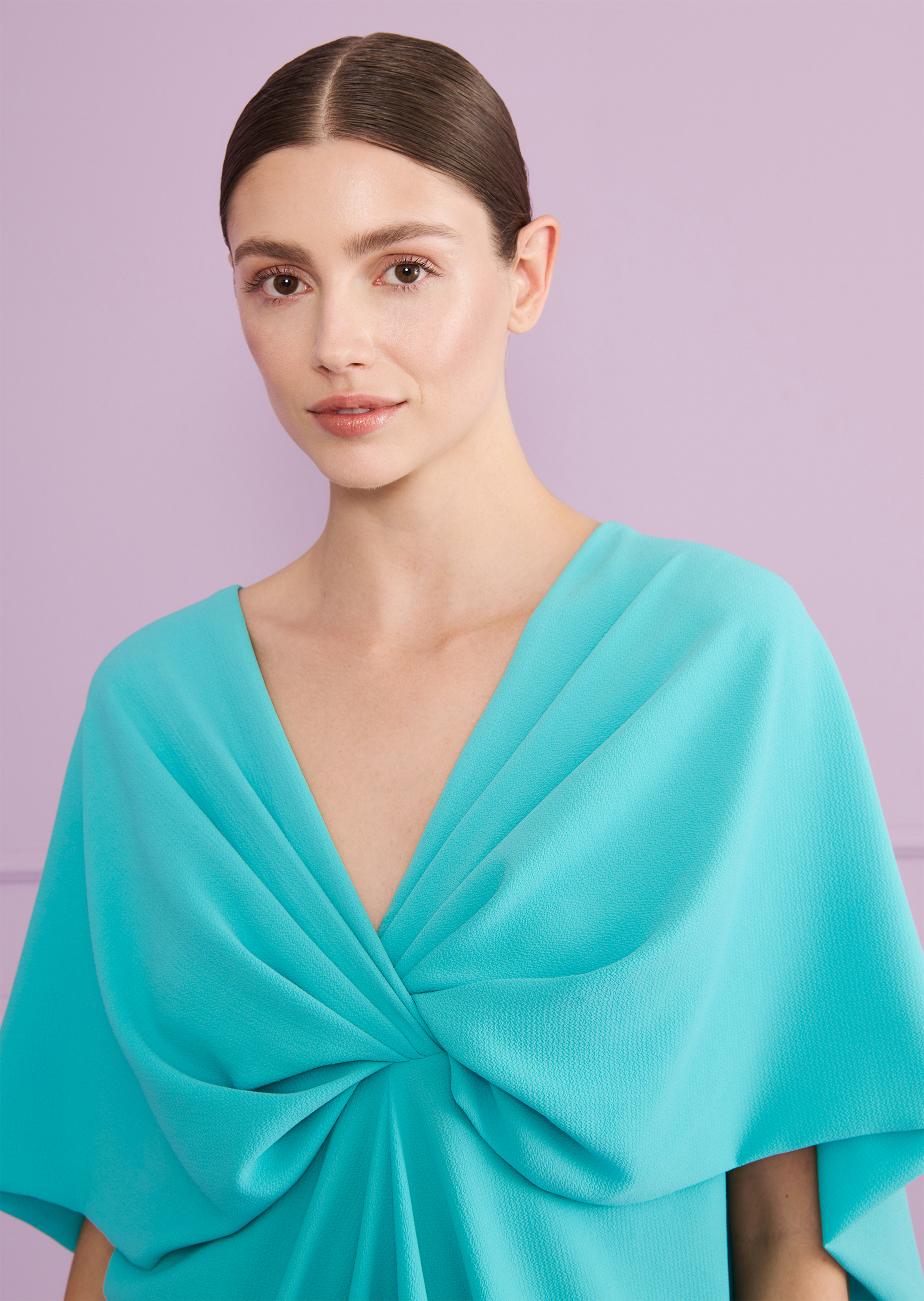 Mit diesem Kleid zieht Avantgarde-Mode in Ihren Kleiderschrank ein. Aber keine Sorge – dieses außergewöhnliche Kleid ist dennoch ein echter Alltagsliebling. Die Extravaganz zeigt sich hier vor allem im Schnitt: Mit viel Talbot Runhof Magie wurde hier wieder drapiert, verdreht und verknotet. Aus nur zwei Schnittteilen entsteht ein elegantes O-Shape-Dress mit V-Ausschnitt, Cape-Ärmeln und einem raffinierten Knotendetail im Brustbereich. Gefertigt aus komfortablem Stretch Crespina, überzeugt dieses Loose-Fit-Kleid sowohl im lässigen Alltagslook mit flachen Schuhen und markanter Uhr als auch am Abend – mondän und subtil sexy – mit Sandaletten und passender Clutch.