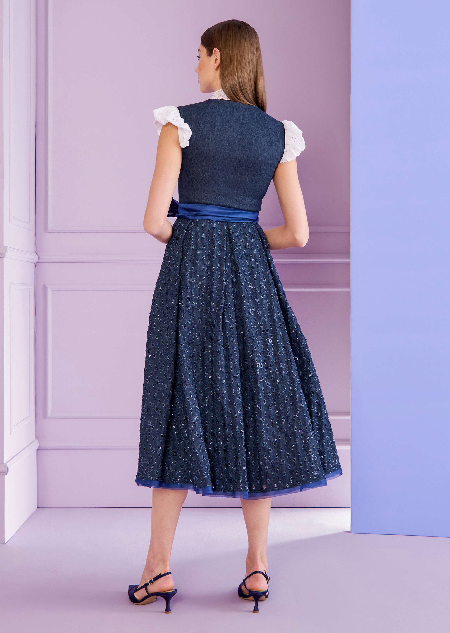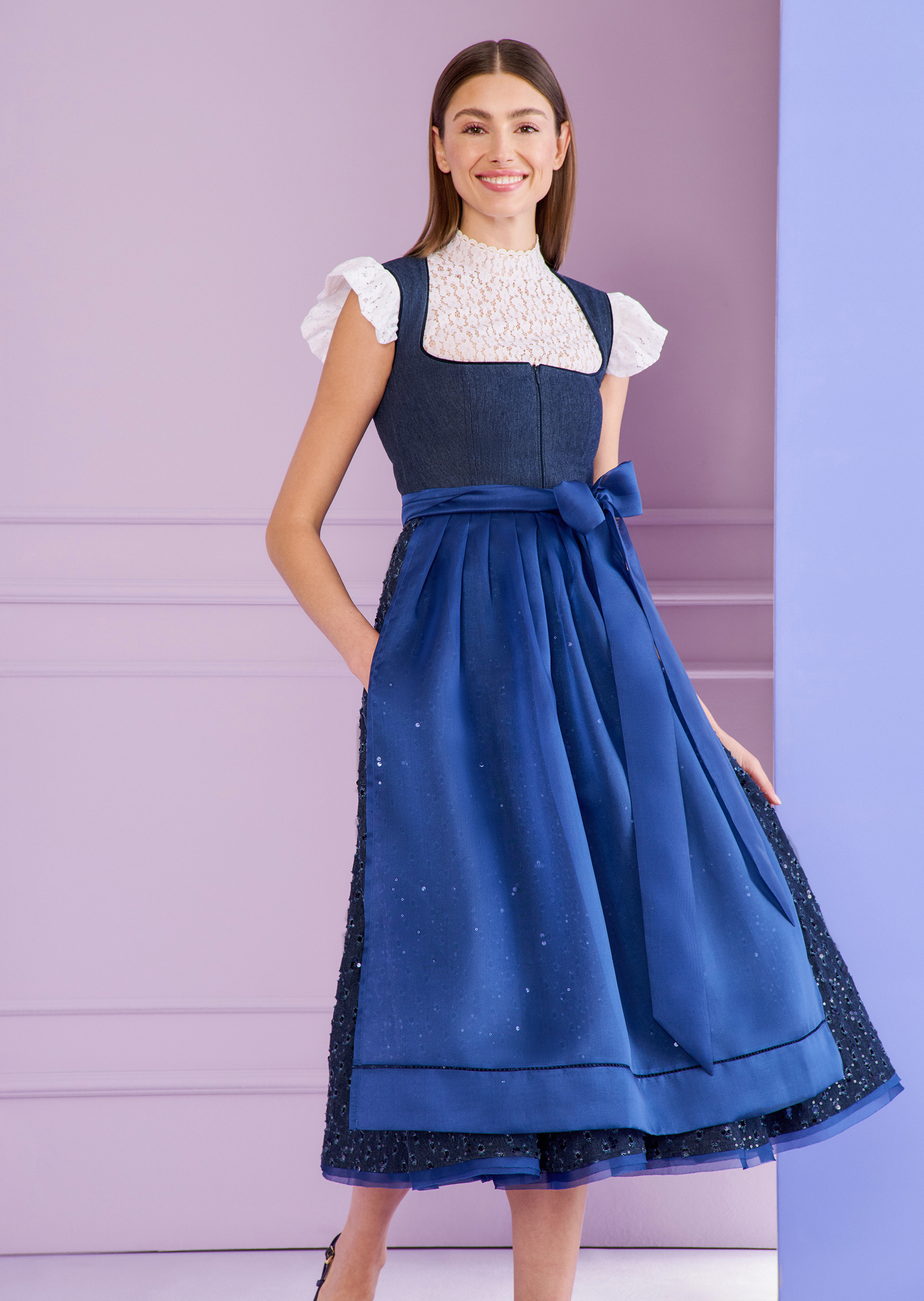 Das Dirndl von Talbot Runhof verleiht Ihrem Wiesn-Look einen modernen, coolen Charme. Der traditionelle Schnitt bleibt klassisch und feminin, doch durch das außergewöhnliche Material im Rock wird das Design neu gedacht. Gerippter Denim mit einem Muster, das an traditionelle Lochstickerei erinnert, vereint Tradition und Moderne auf lässige Weise. Ein wenig Funkeln darf auch hier nicht fehlen: Der Denim ist mit feinen, denimblauen Pailletten bestickt, die dezente Akzente setzen und dem Look einen Hauch von Raffinesse verleihen. Die schlichte Schürze aus Organza sorgt für eine entspannte, aber elegante Abrundung. Dank des vorderseitigen Reißverschlusses ist das An- und Ausziehen besonders unkompliziert, während das Dekolleté durch den klassischen Schnitt stilvoll in Szene gesetzt wird. Die Midilänge macht das Dirndl zu einem vielseitigen Begleiter, der sowohl auf der Wiesn als auch bei anderen Anlässen mit Coolness und Klasse überzeugt.
