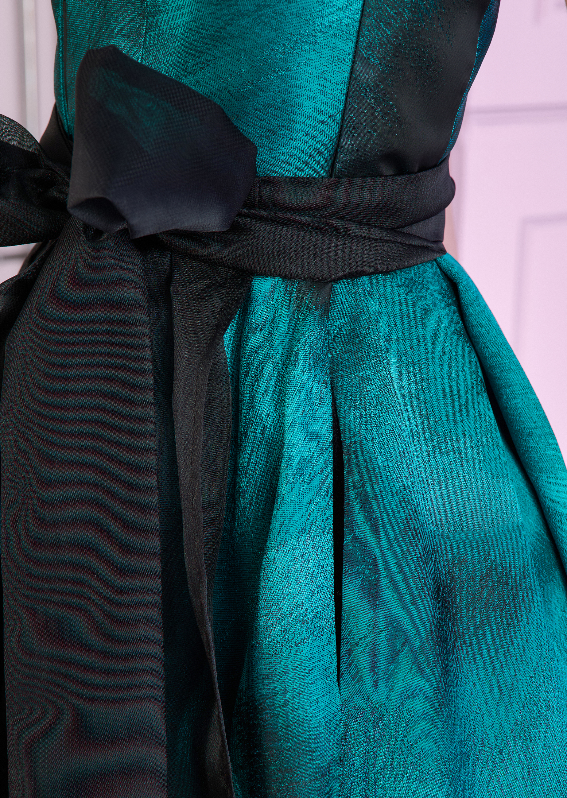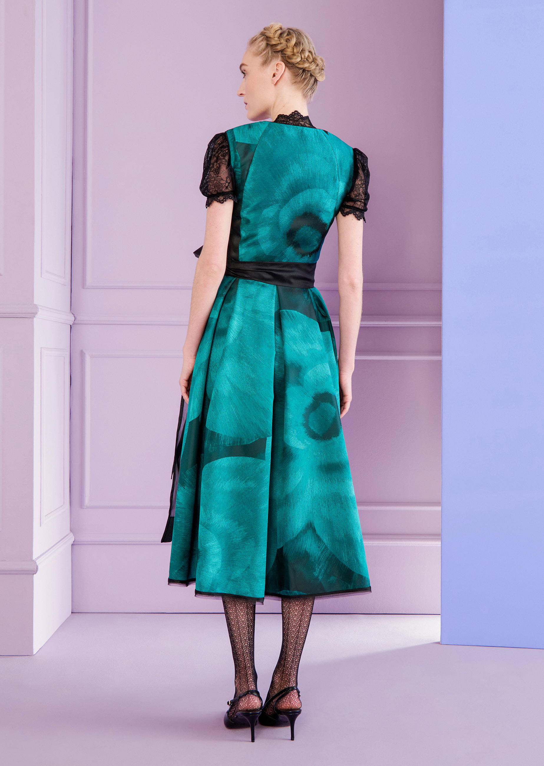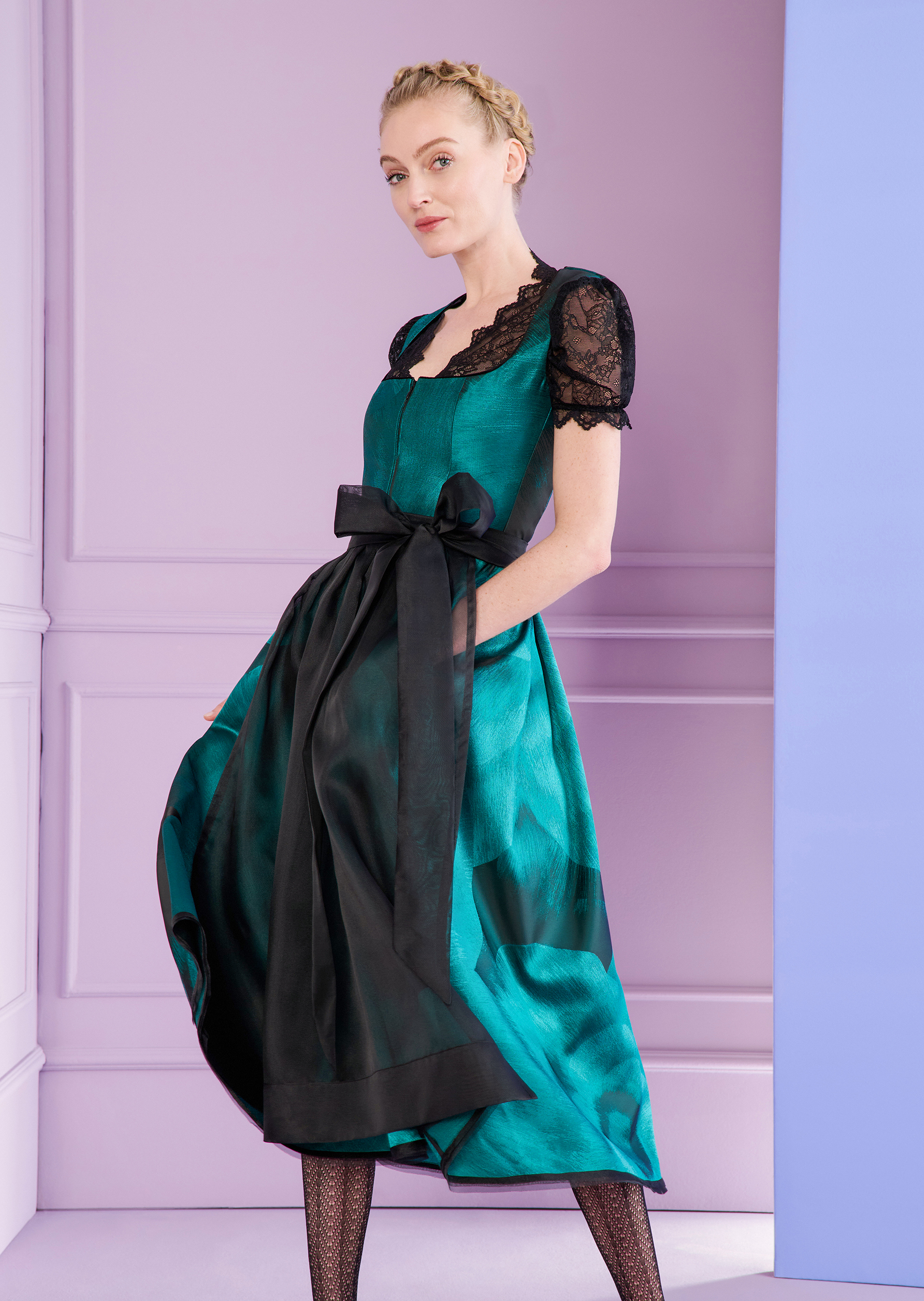 Das Dirndl von Talbot Runhof verleiht Ihrem Wiesn-Look eine unvergleichliche Note aus Glamour und Charme. Der traditionelle Schnitt bleibt respektvoll klassisch, wird jedoch durch die charakteristische Designästhetik des Hauses auf moderne und stilvolle Weise neu interpretiert. Ein Highlight ist der edle florale Jacquard, der mit seiner Leichtigkeit nicht nur zum Schunkeln, sondern auch zum Tanzen einlädt. Die zarte Organza-Schürze ergänzt das Ensemble perfekt und schafft eine harmonische Balance zwischen Tradition und zeitgemäßer Eleganz. Praktisch ist der vorderseitige Reißverschluss, der das An- und Ausziehen mühelos gestaltet. Das Dekolleté wird durch den klassischen Schnitt elegant in Szene gesetzt, während die feminine Midilänge eine zeitlose Silhouette zaubert – ideal für die Wiesn und andere festliche Anlässe.