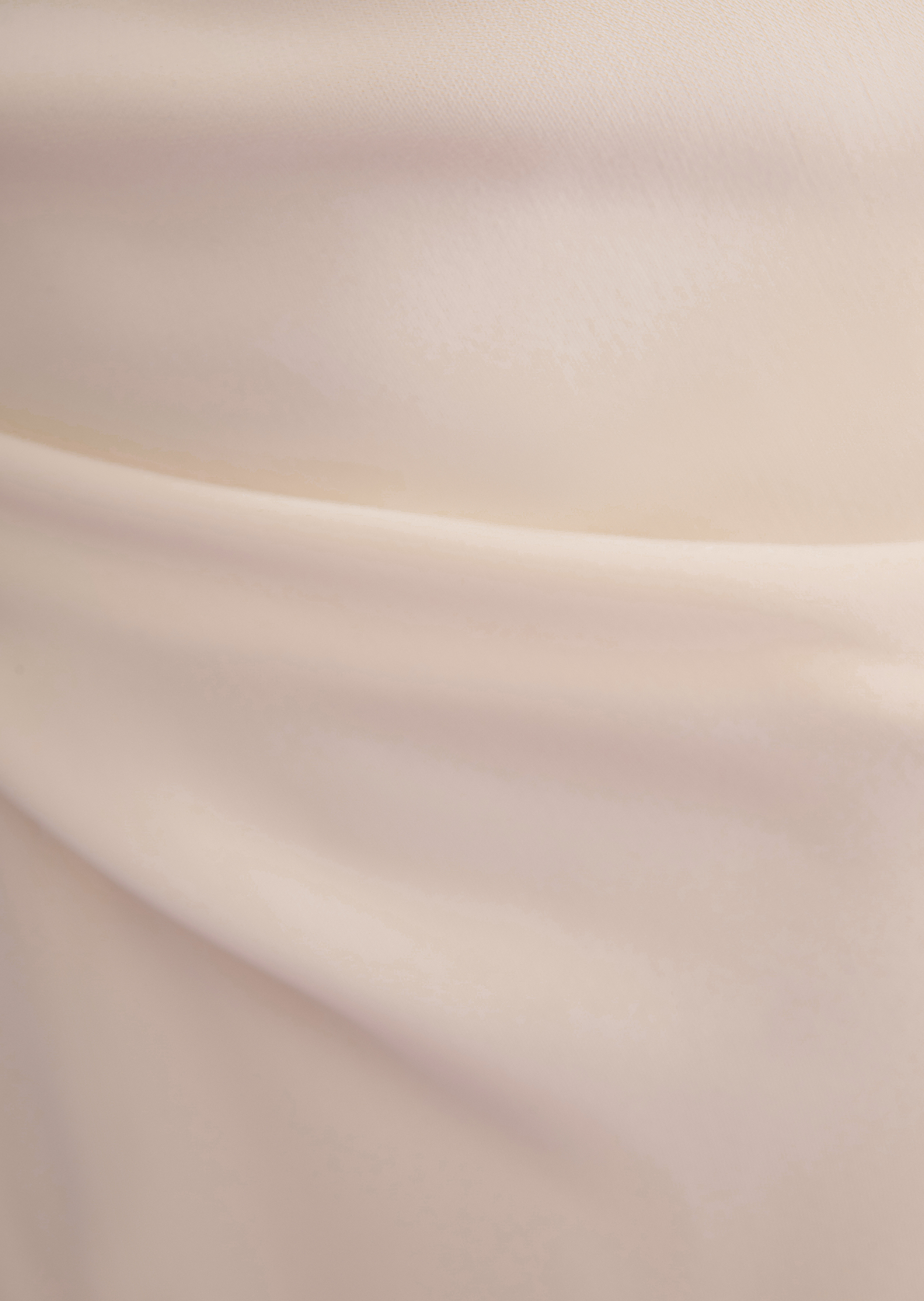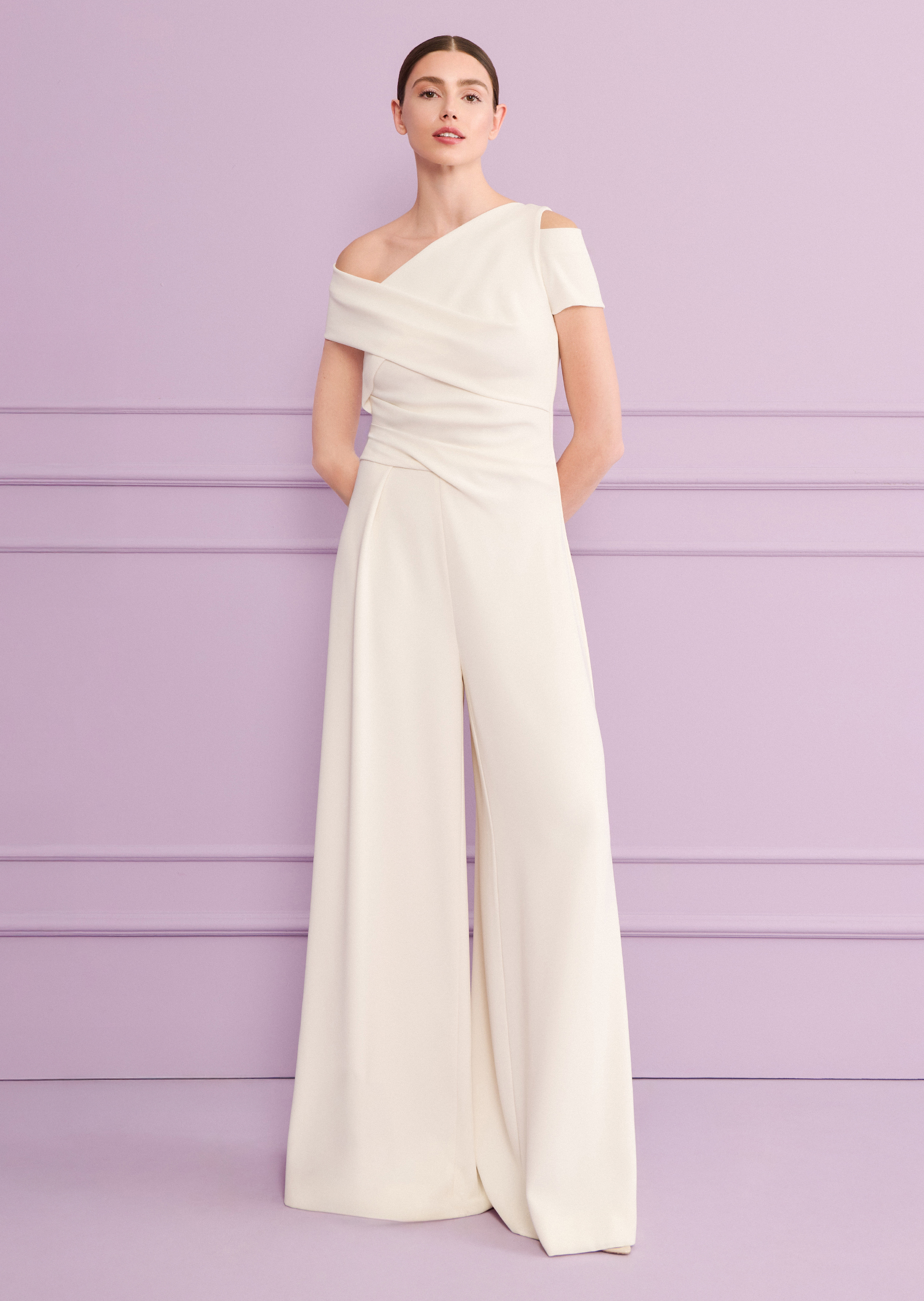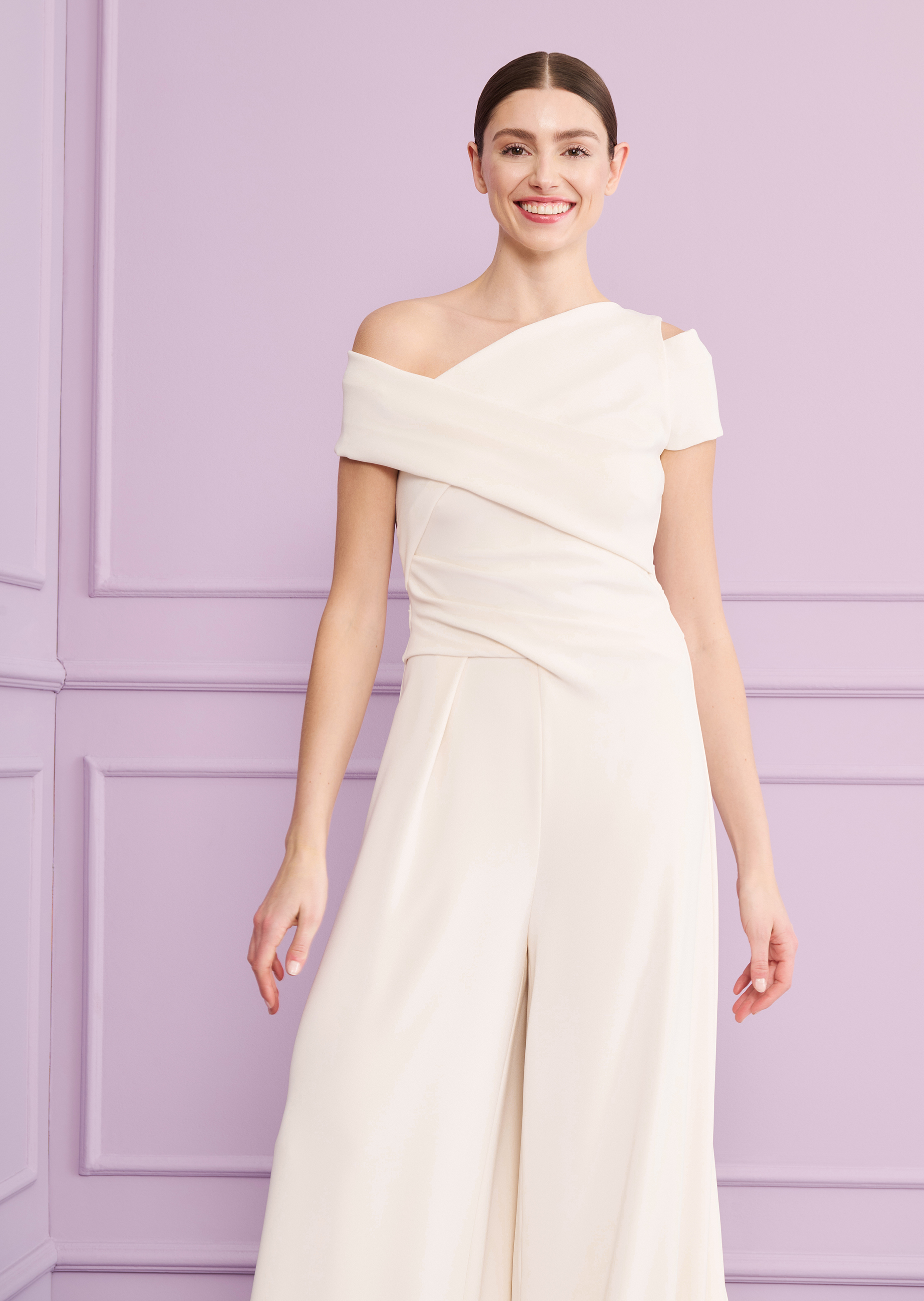 Unser Jumpsuit Risk7 steht ganz risikofrei für einen zeitgemäßen, frischen Look bei Ihrer Hochzeit. Die ausgeklügelten Drapierungen schummeln ihnen die perfekte Hochzeitsfigur, selbst wenn Sie doch noch das ein oder andere Problemzönchen mitbringen sollten. Das Material, ein weicher Triacetate Crêpe, fällt besonders schön. Und ganz nebenbei überrascht dieses Outfit auch noch mit seiner Wandelbarkeit. In der Kirche tragen Sie den Jumpsuit natürlich mit seiner langen Schleppe. Hinterher lässt sich diese ganz einfach abknöpfen. Die Knopfleiste verschwindet dann unter den Drapés. So können Sie entspannt und sorgenfrei Ihre Feier genießen und auf ihren Stilettos bis in die frühen Morgenstunden mit ihrem Gatten tanzen.