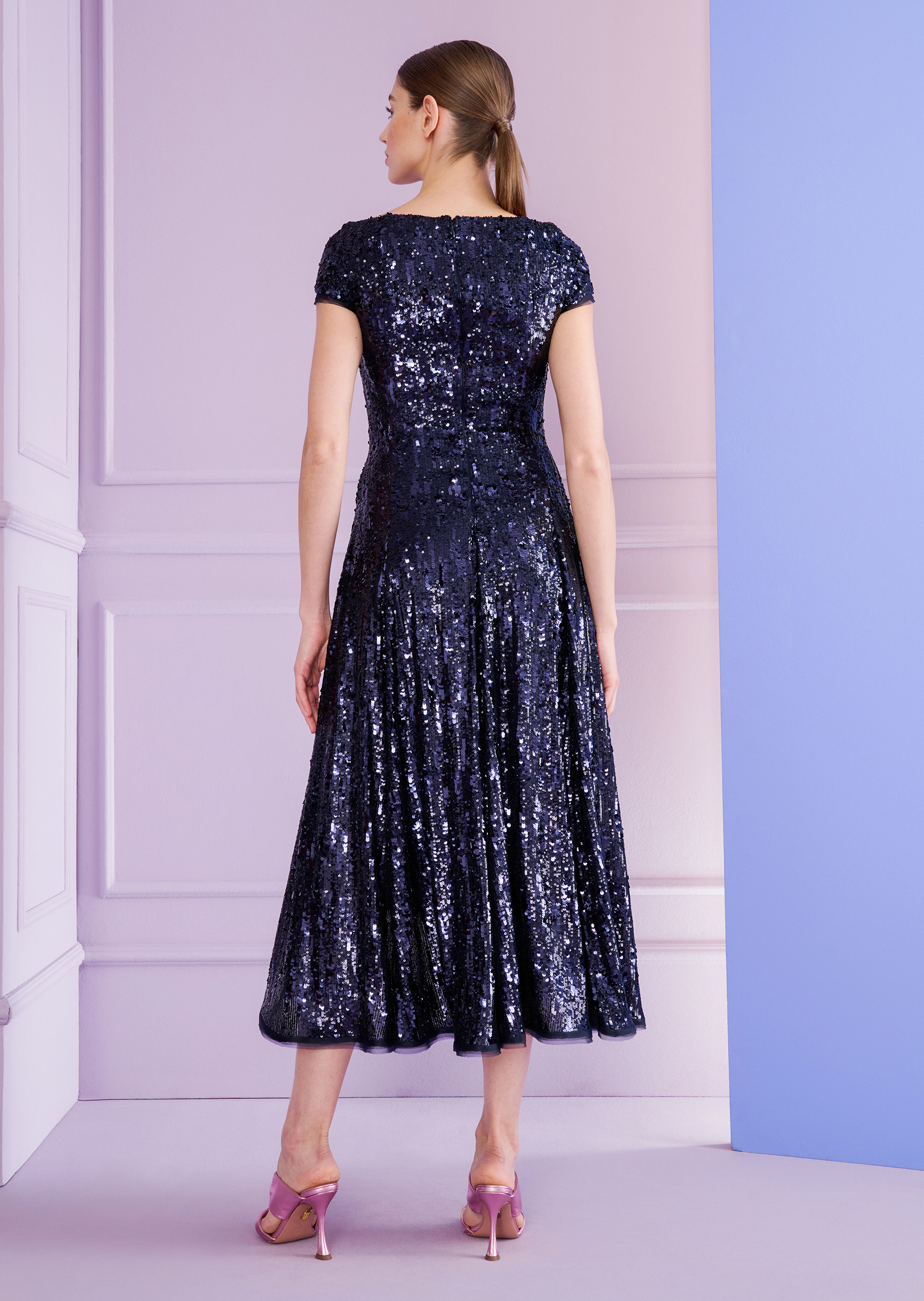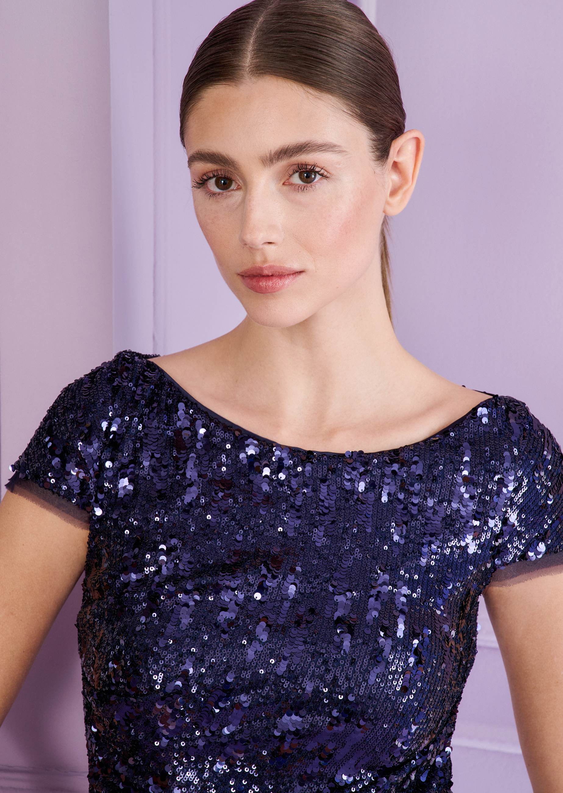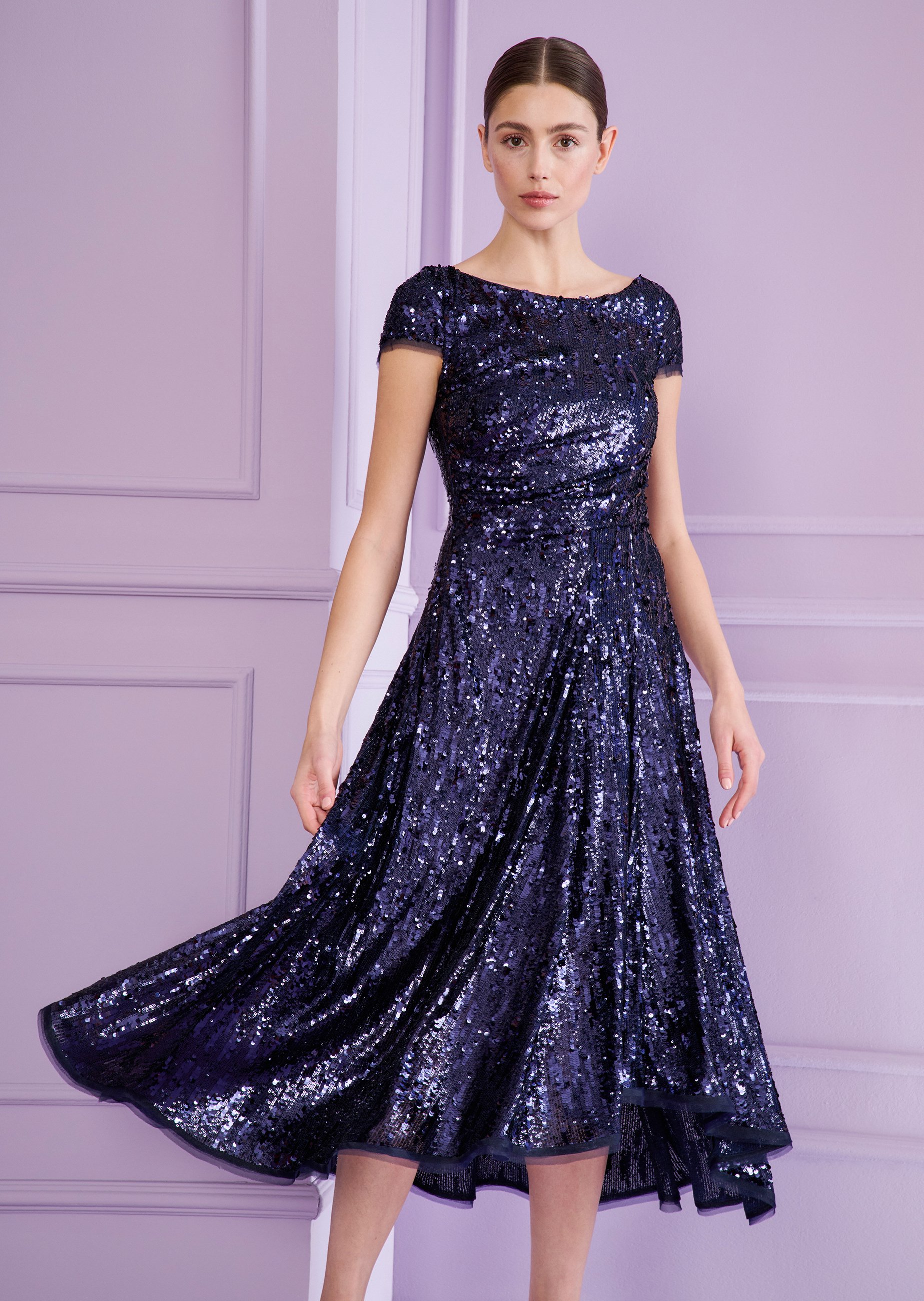 Bereit für einen großen Auftritt? In diesem funkelnden Cocktailkleid aus Sequin-Tüll werden Sie der Star jeder Party! Die Fit & Flare-Silhouette sorgt für die perfekte Mischung aus Eleganz und Bewegungsfreiheit – damit Sie sowohl stilvoll aussehen als auch die Tanzfläche rocken können. Eine dezente Drapierung in der Taille zaubert eine schmeichelhafte Figur, während die hochgeschlossene Neckline und die kurzen Ärmel dem Look eine moderne, minimalistische Note verleihen. Styling-Tipp: Kombinieren Sie dieses schimmernde Schmuckstück mit auffälligen Statement-Ohrringen und Metallic-Heels für maximalen Glam-Faktor. Oder greifen Sie zu klassischen schwarzen Sandaletten und einer eleganten Clutch, um das Kleid in den Mittelpunkt zu stellen. Egal wie, dieses Kleid wird Ihnen garantiert einen glänzenden Auftritt bescheren!