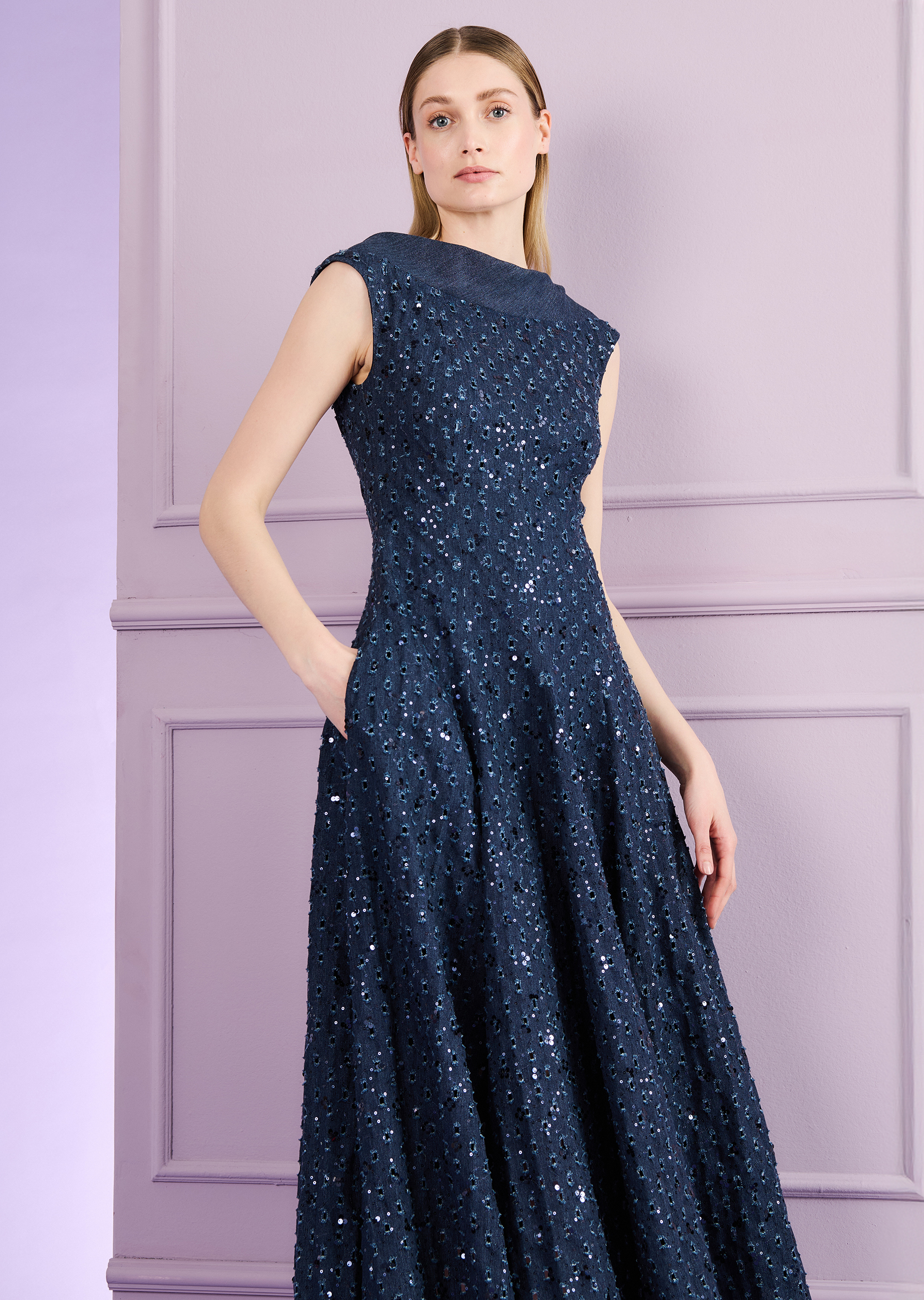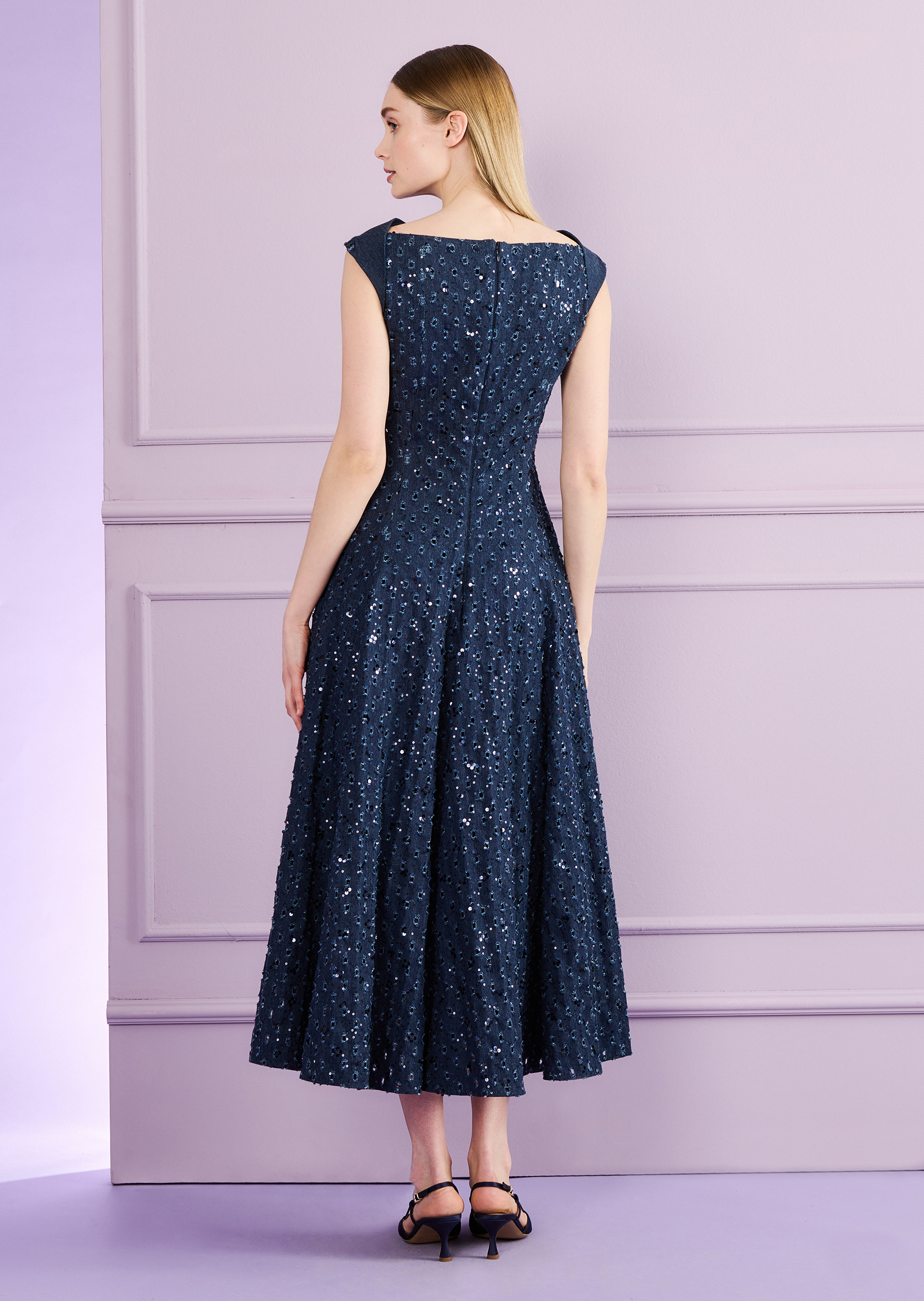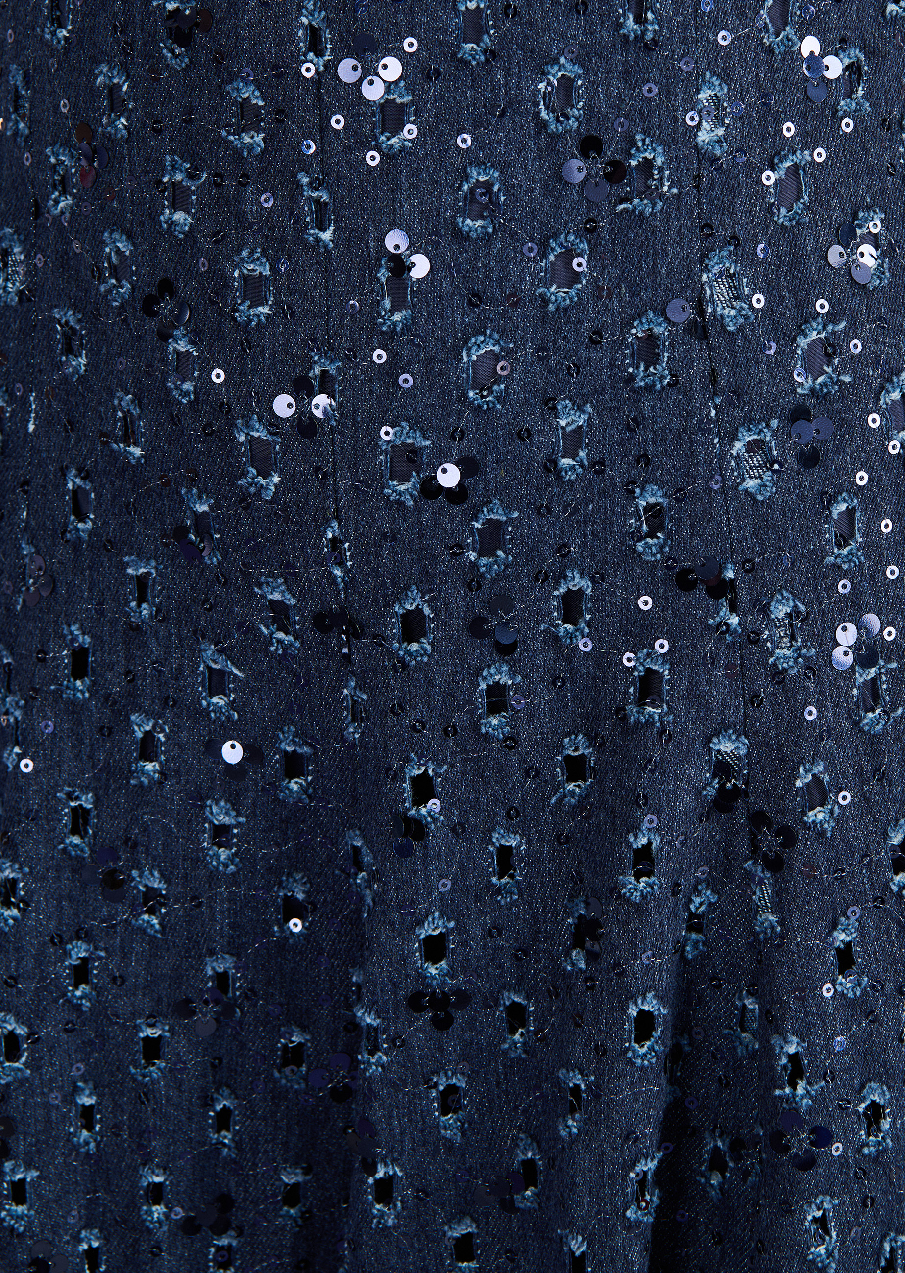 Zur Sommerhochzeit im Freien oder dem eleganten Geburtstags-Picknick im Park: Dieses Midikleid aus einem wunderschönen paillette denim lädt auf alle Fälle dazu ein, den Sommer zu feiern. Schon allein durch das fröhliche Glitzern! Nebenbei zaubert das in Bahnen geschneiderte Fit & Flare Kleid mit seitlichen Eingriffstaschen eine besonders schöne Taillen-Hüft-Partie, die dann in den einen weiten, schwingenden Rock aufspringt. Ideal, um vielleicht noch schnell einen Tanz unter freiem Himmel zu wagen. Ob mit flachen Sandalen oder Heels – der Sommer kann in jedem Fall kommen.