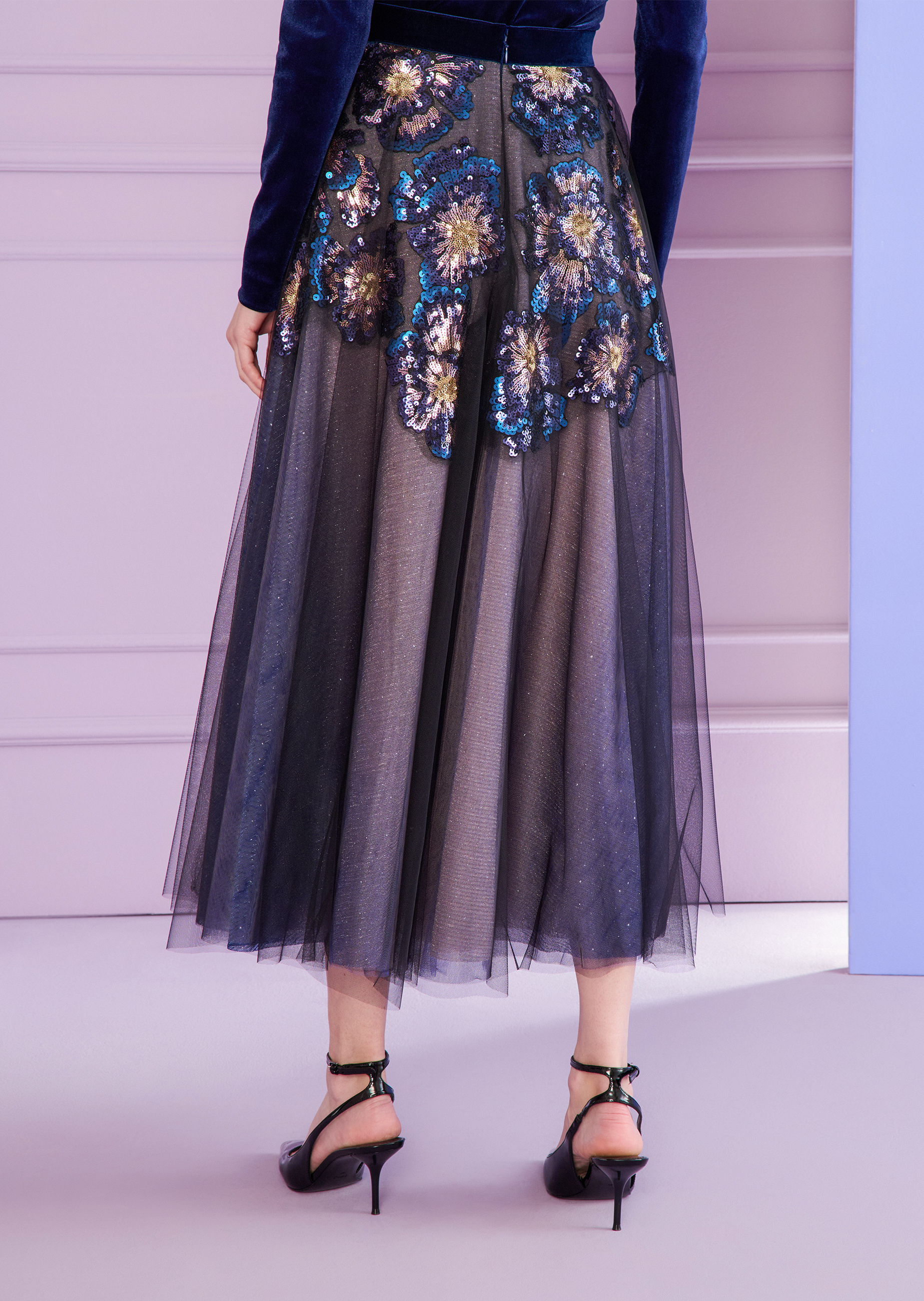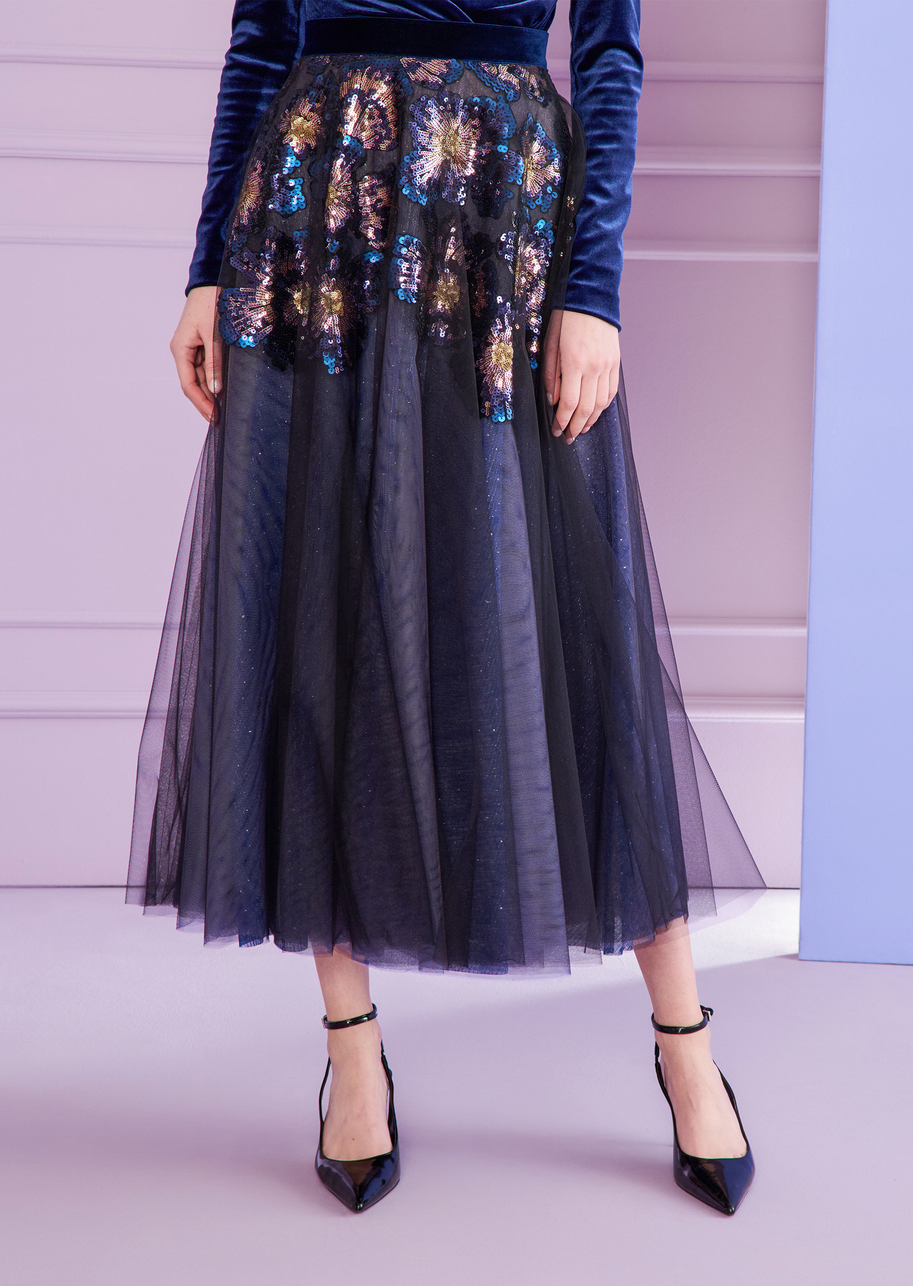 Wenn glitzernde Pailletten auf zarten Tüll treffen, ist der feenhafte Look perfekt. Bei unserem neuen Midirock darf natürlich auch ein Hauch von Extravaganz nicht fehlen: Die Paillettenblüten funkeln im oberen Teil direkt unterhalb des Saums und laufen dann in zarte Tülllagen aus, was diesem Look seine besondere Leichtigkeit verleiht. Märchenhaft schön – vor allem, wenn Sie dazu das passende Paillettentop stylen. So ist die nächste rauschende Nacht wirklich nur einen Flügelschlag entfernt.