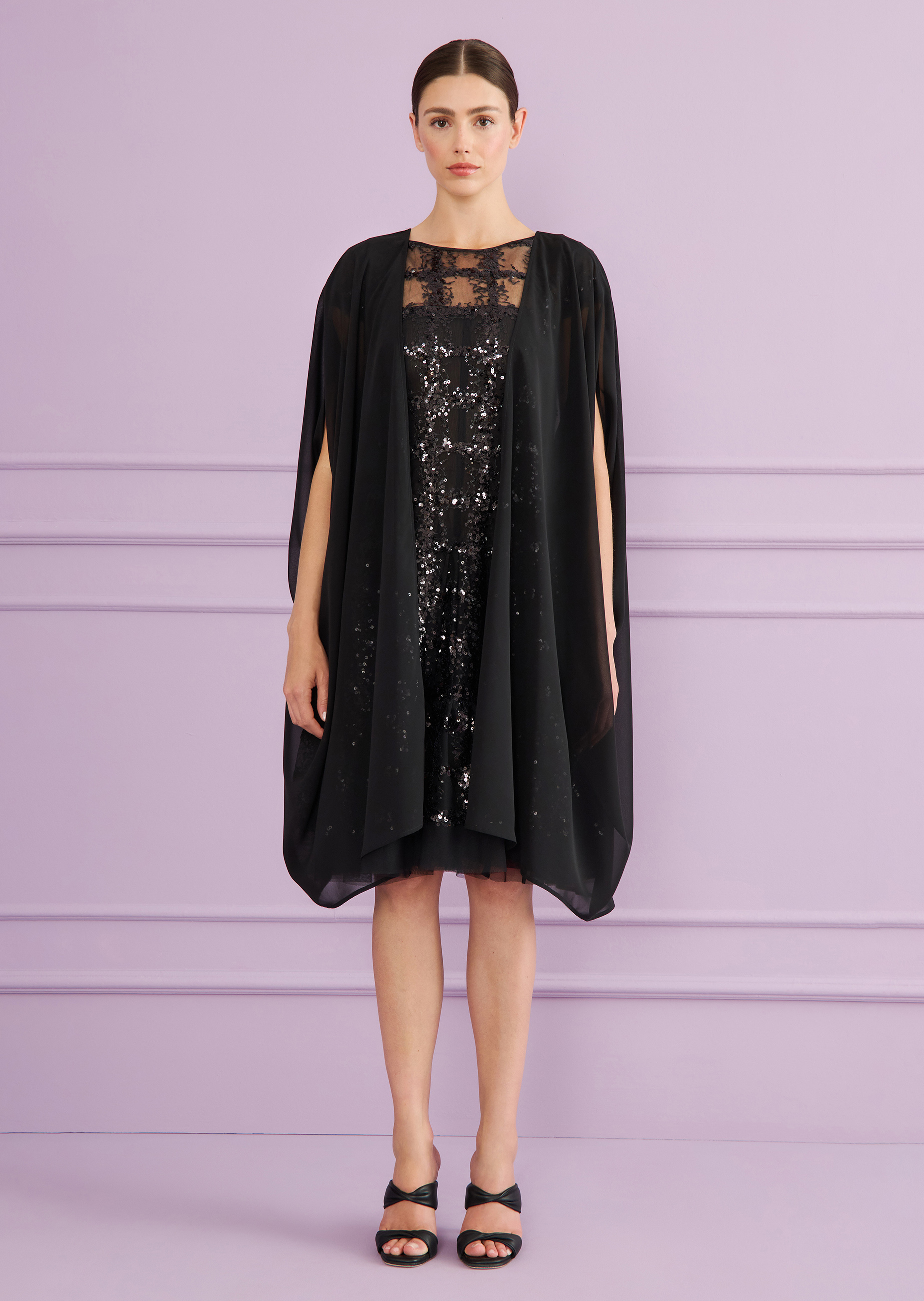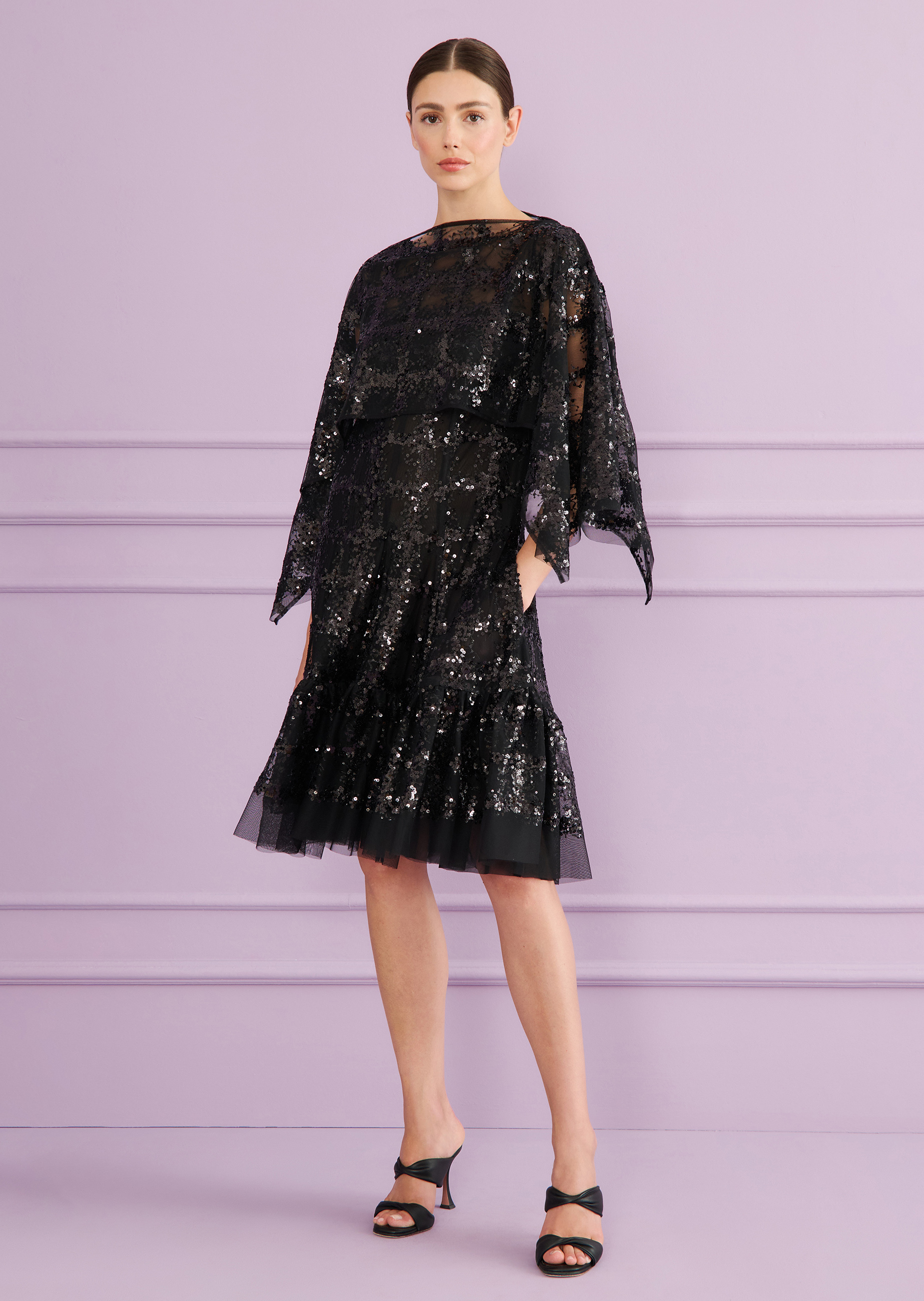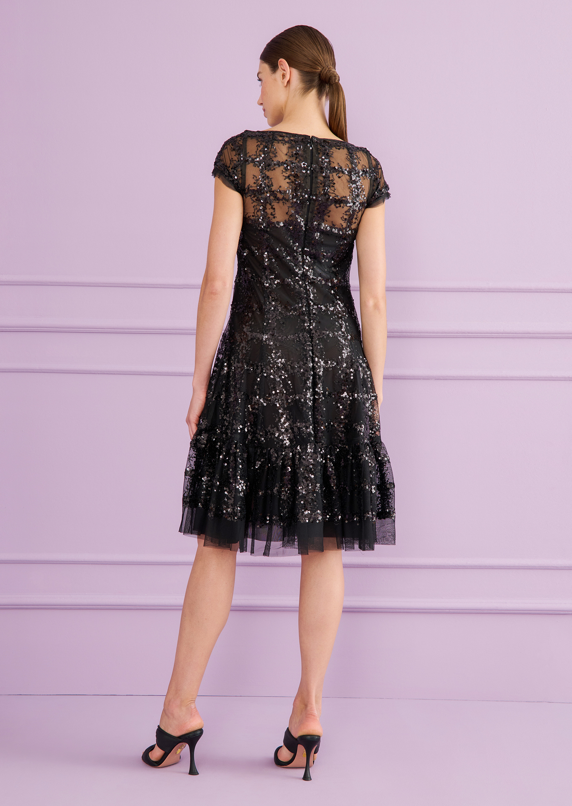 Schwungvoll geht es in diesem knielangen Cocktailkleid mit kurzen Ärmelchen und einem dezenten U-Boot-Ausschnitt zur nächsten Veranstaltung: Durch den entspannten Schnitt fühlen Sie sich in diesem Modell niemals eingeengt. Trotzdem wird hier die Silhouette sanft nachgezeichnet. Ein breiter Volant am Saum sorgt beim Tanzen für noch mehr Schwung. In dieser Variante, gefertigt aus einer aufregenden Paillettenstickerei, werden Sie ohnehin zum funkelnden Hingucker. Spätestens dann aber, wenn Sie darin ausgelassen die Tanzfläche erobern, wird kein Gast den Blick von Ihnen lassen können.