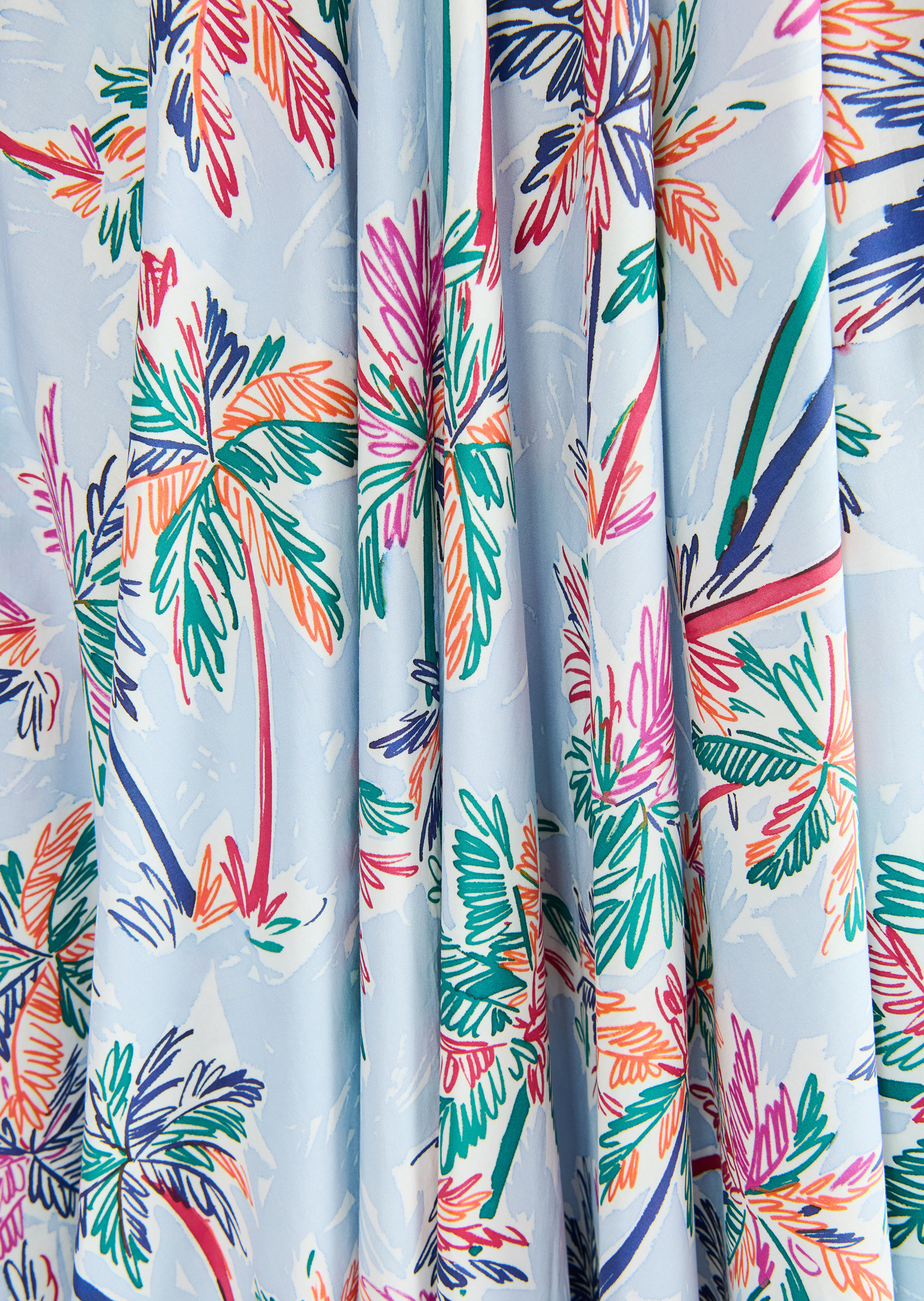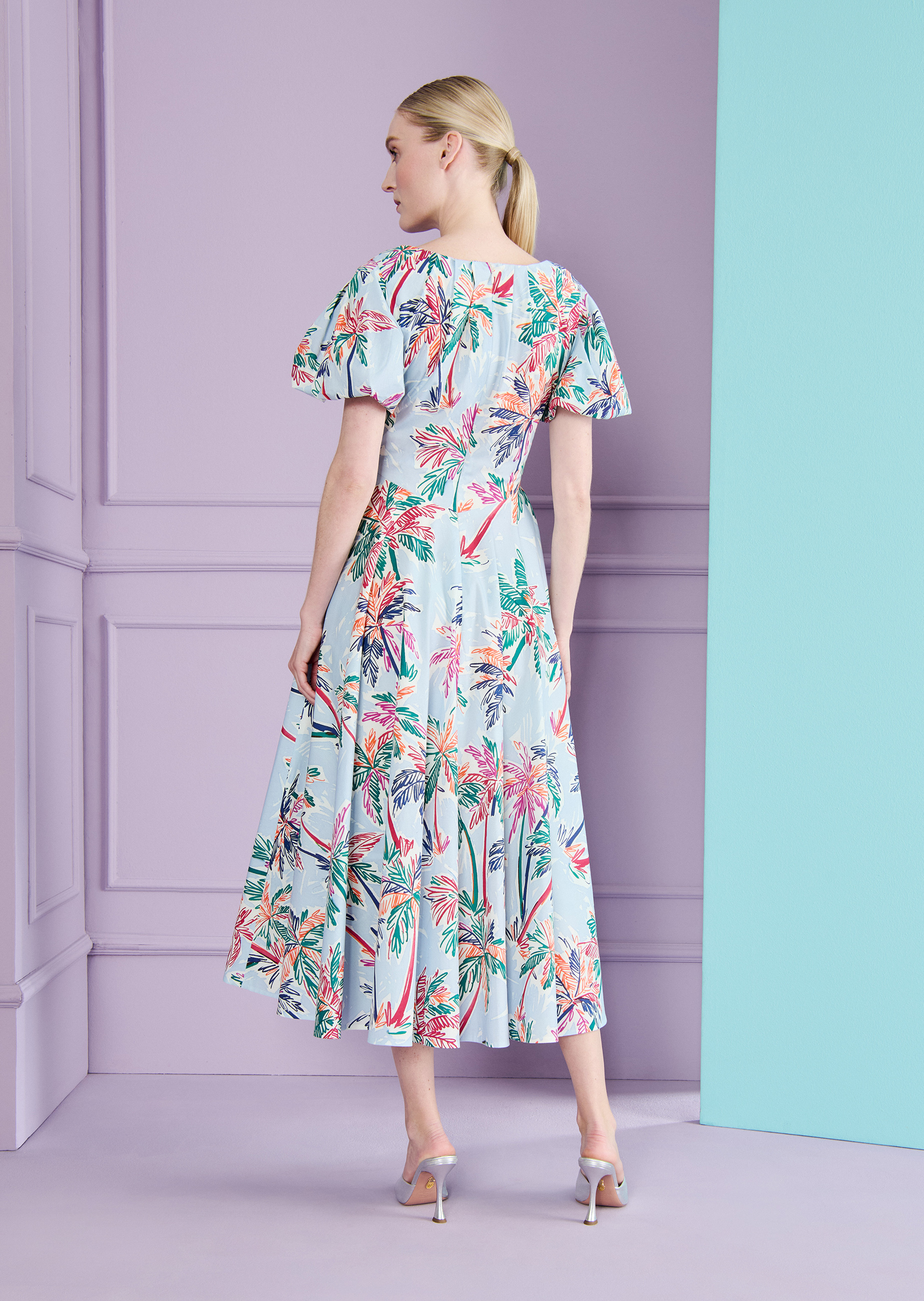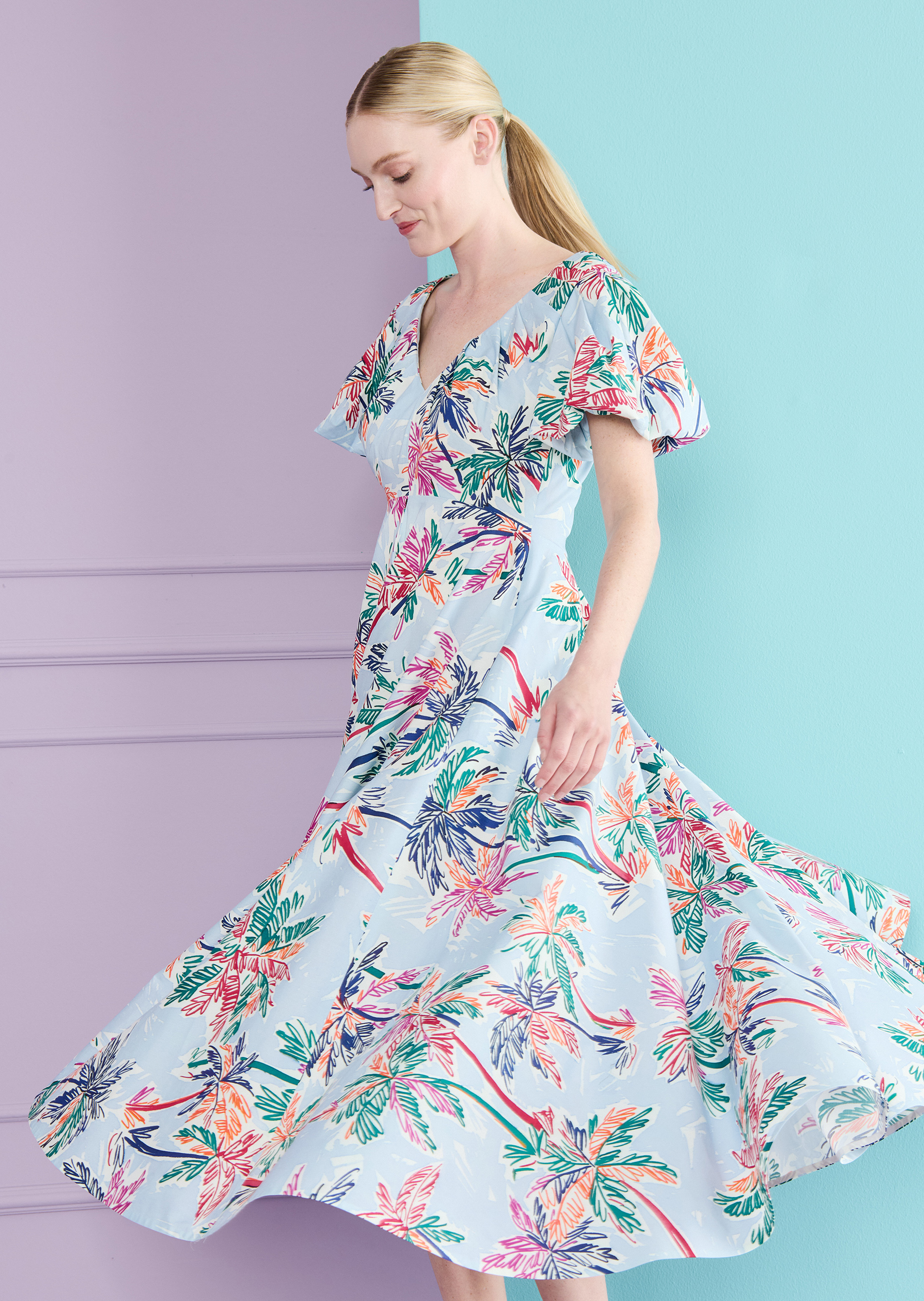 In diesem Midikleid erwartet Sie ein unkomplizierter Sommer – einfach anziehen und genieße! Gefertigt haben wir dieses Tageskleid aus einem leichten Palm Print Cotton Stretch mit exotischem Muster. Es überzeugt mit einem dezenten V-Ausschnitt, blusig weiten, kurzen Ärmeln und einer definierten Taille. Nach unten springt dieses Fit & Flare Kleid in einen weiten Rock auf. So zeigen Sie nicht nur ihre schönsten Sandalen, sondern tänzeln auch stolperfrei durch den Sommer – ob auf Gartenparties, Geburtstagen, Shoppingtouren oder Kunstevents.