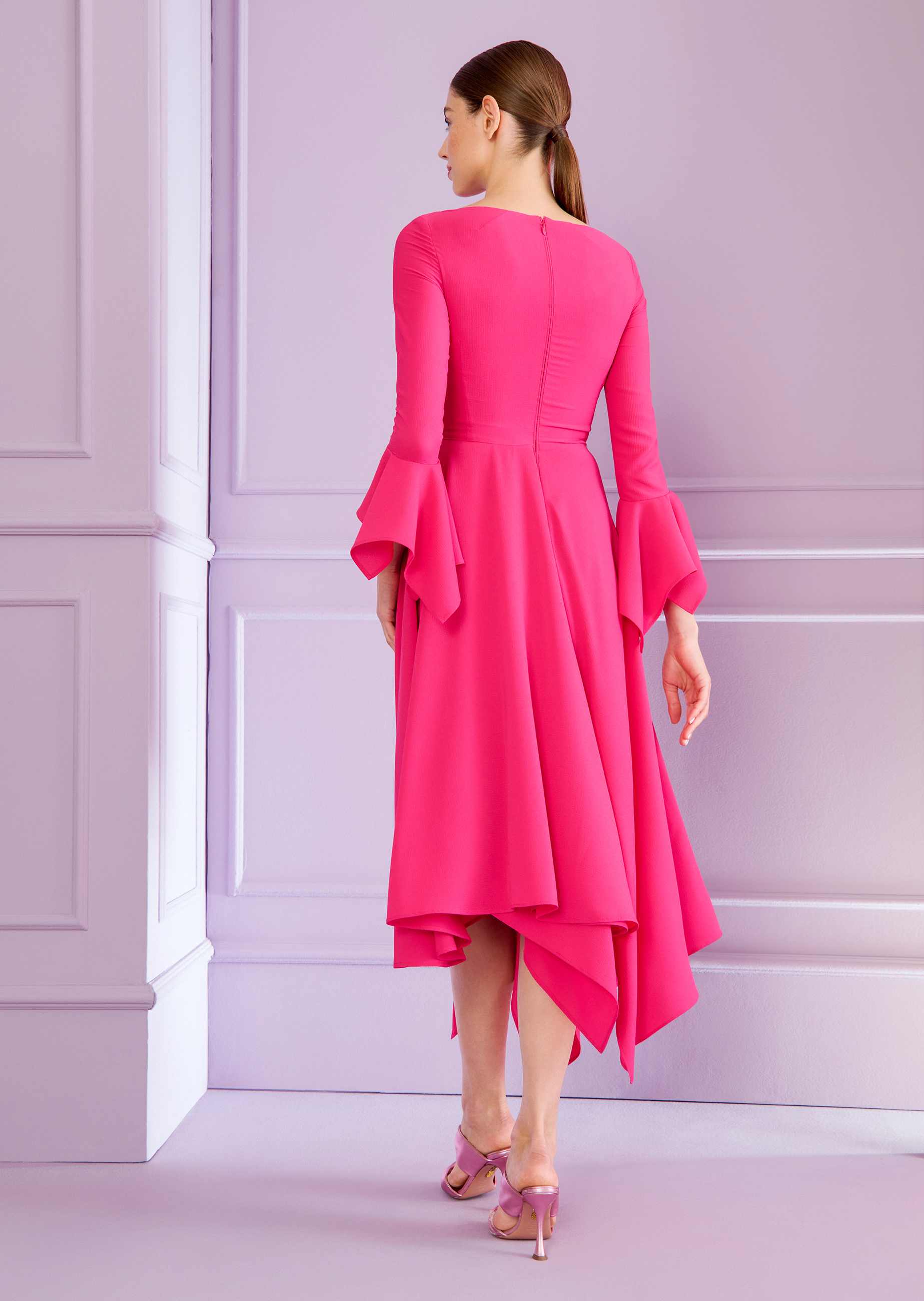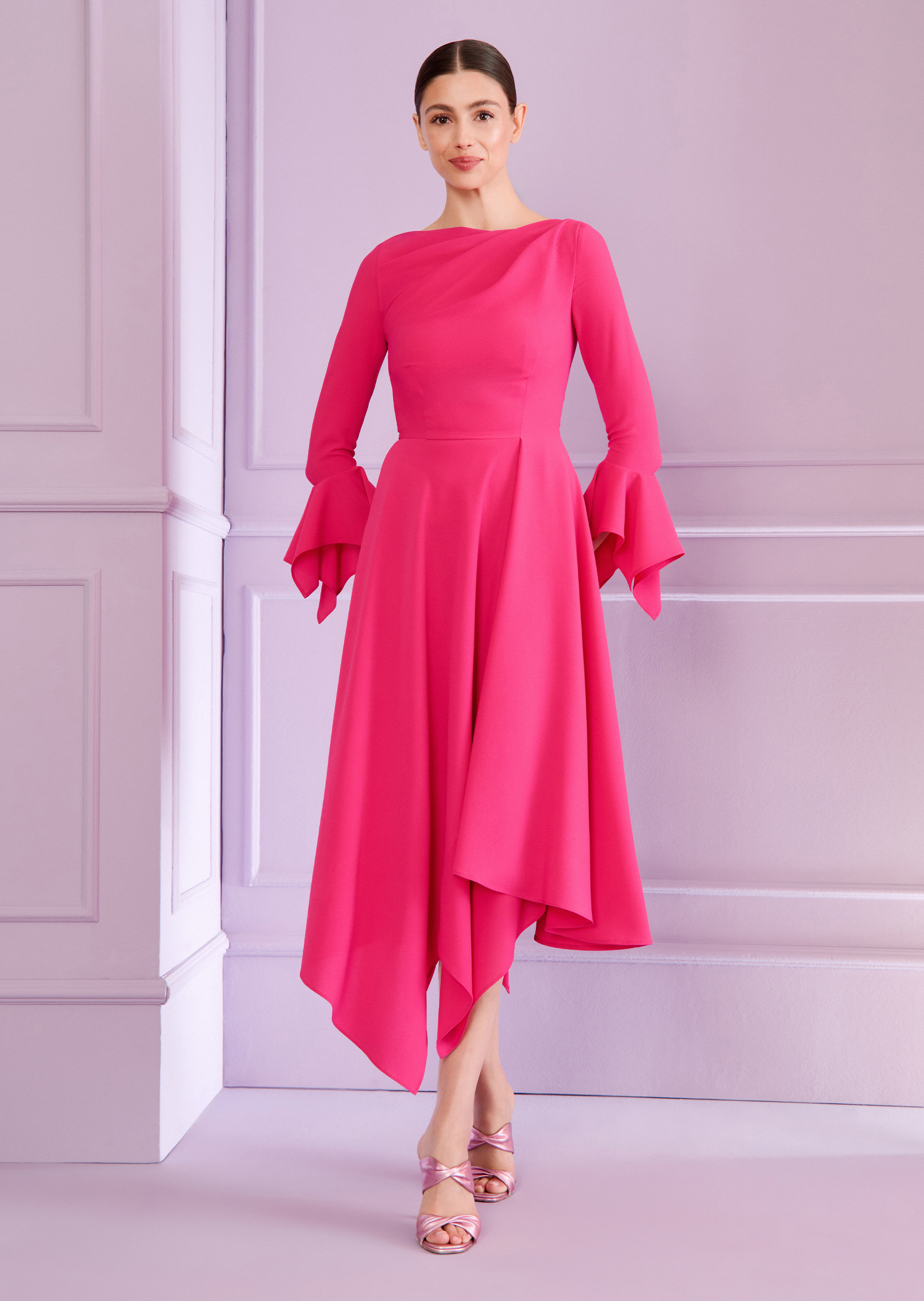 Lässigkeit, Eleganz und dazu ein Hauch Couture – dieses Midikleid vereint gleich mehrere tolle Eigenschaften. Im Oberteil ist dieses Tageskleid schlicht und eben elegant gehalten mit der U-Boot-Neckline und sanften Drapierungen. An den halblangen Ärmeln sorgen zipfelig geschnittene Volants für einen Hingucker. Vor allem durch den Rock setzen Sie aber überall ein starkes, modisches Statement. Der asymmetrische Saum wirkt hier nicht nur verspielt, sondern auch couturig und extravagant. Tagsüber tragen Sie dieses Midikleid in Job und Freizeit, glamouröser gestylt aber natürlich auch bei der Abendveranstaltung!