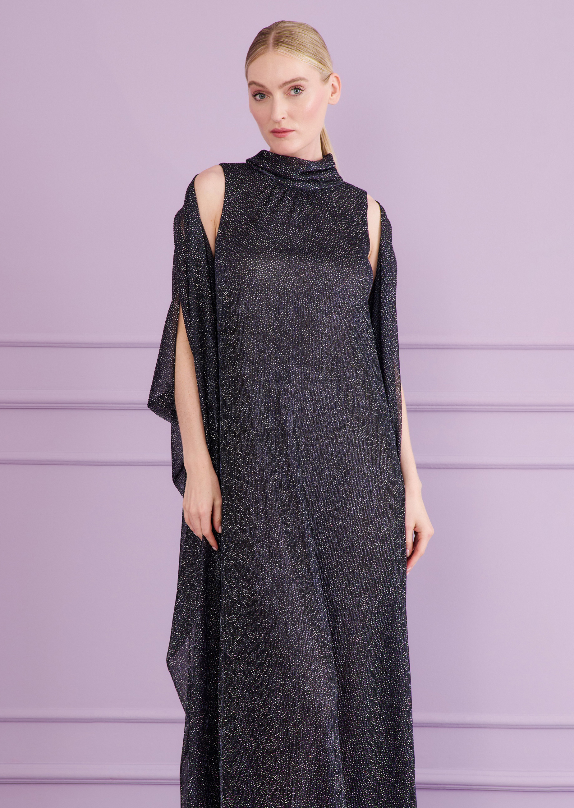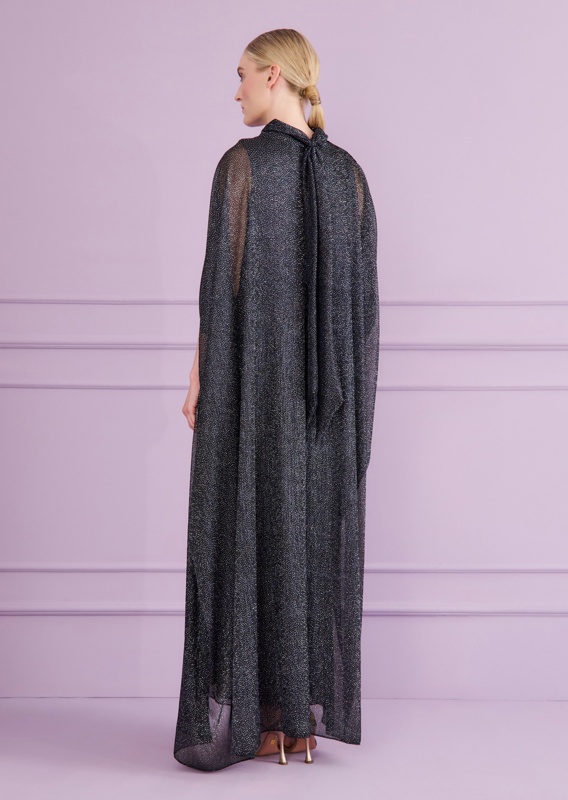 We’re giving our beloved stole a break and opting for more drama with a floor-length cape in glittering metallic voile. This gem will elevate any evening gown to sophisticated Hollywood glam for an extravagant, dramatic look!