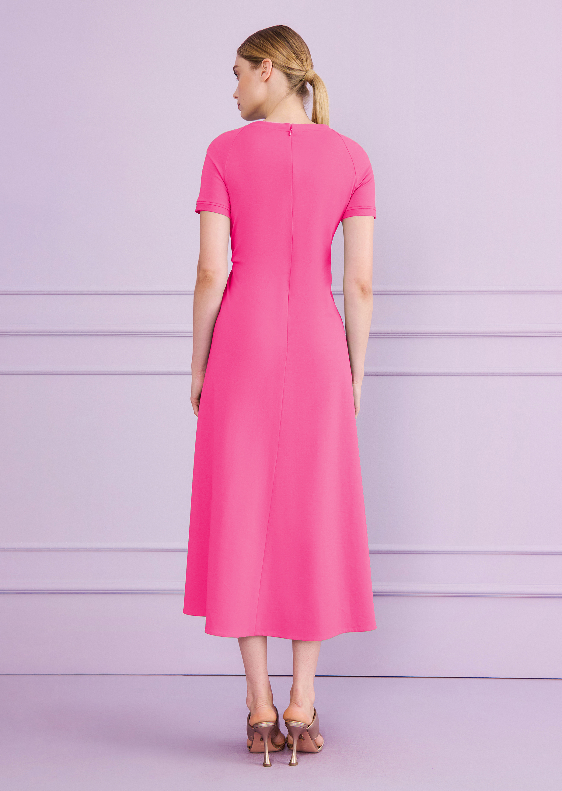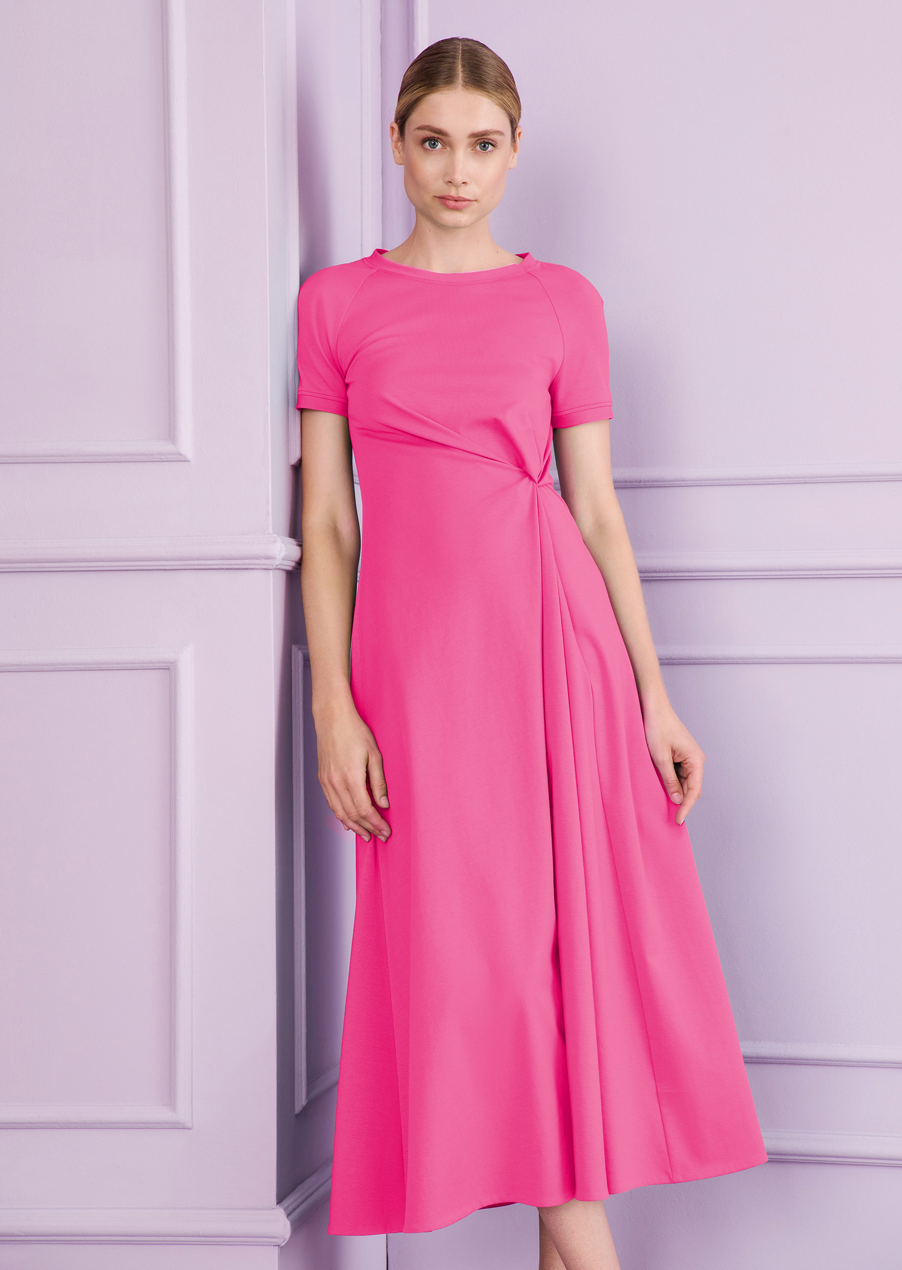 Simple yet striking, minimal yet full of character – sounds like a contradiction? Not at all. That’s exactly how we’d describe our new midi dress. Its beauty lies in the simplicity, with a subtle front drape that gives it a unique, signature touch. The rest of the design stays refreshingly understated: a relaxed crew neckline, short cap sleeves, a defined waist, and a generously flowing skirt. Crafted from our Punto Milano cotton, it has a soft sheen that elevates it just enough – perfect for a busy workday, and just as elegant styled with glamorous accessories for the evening.