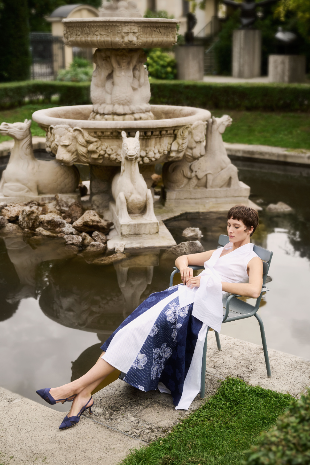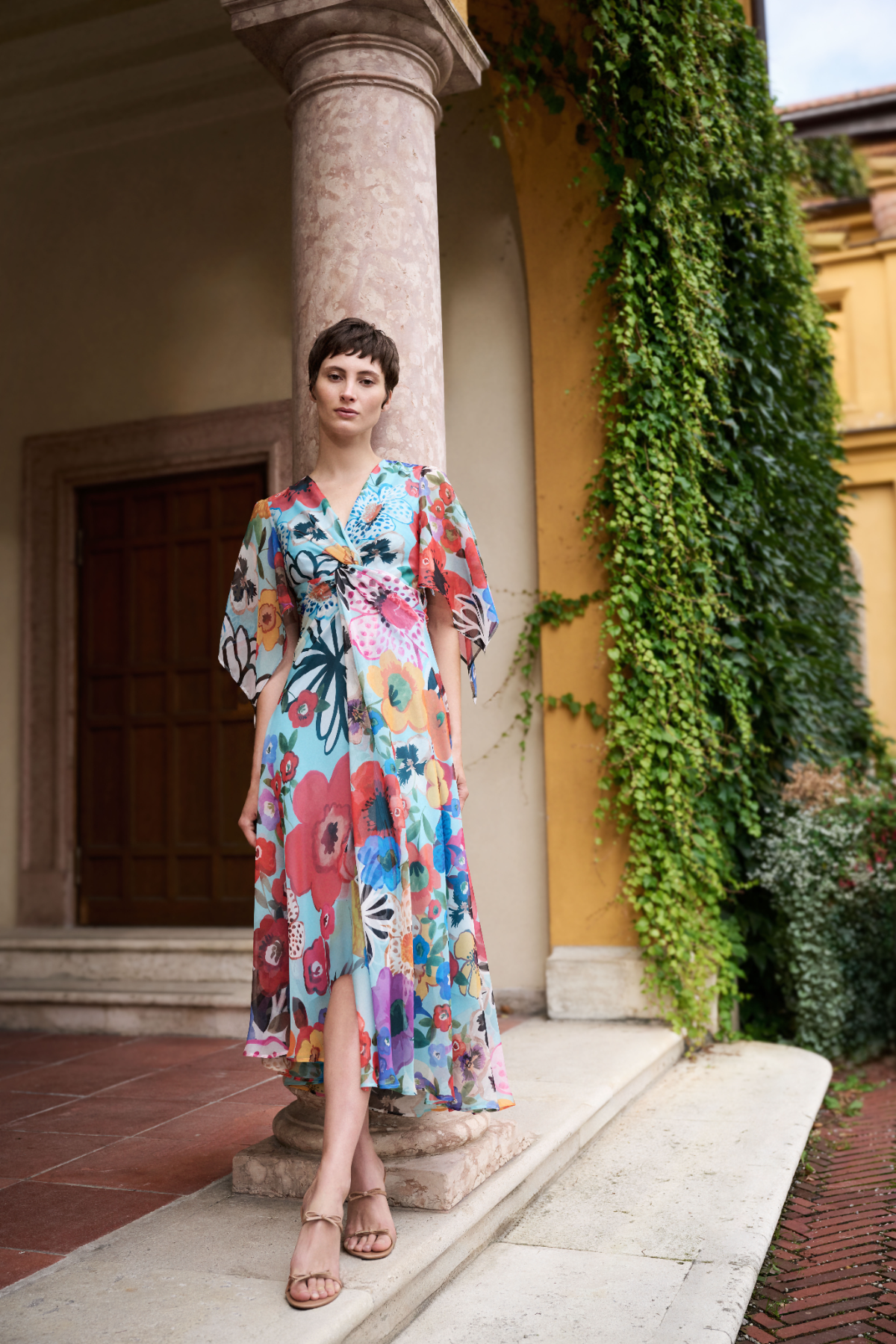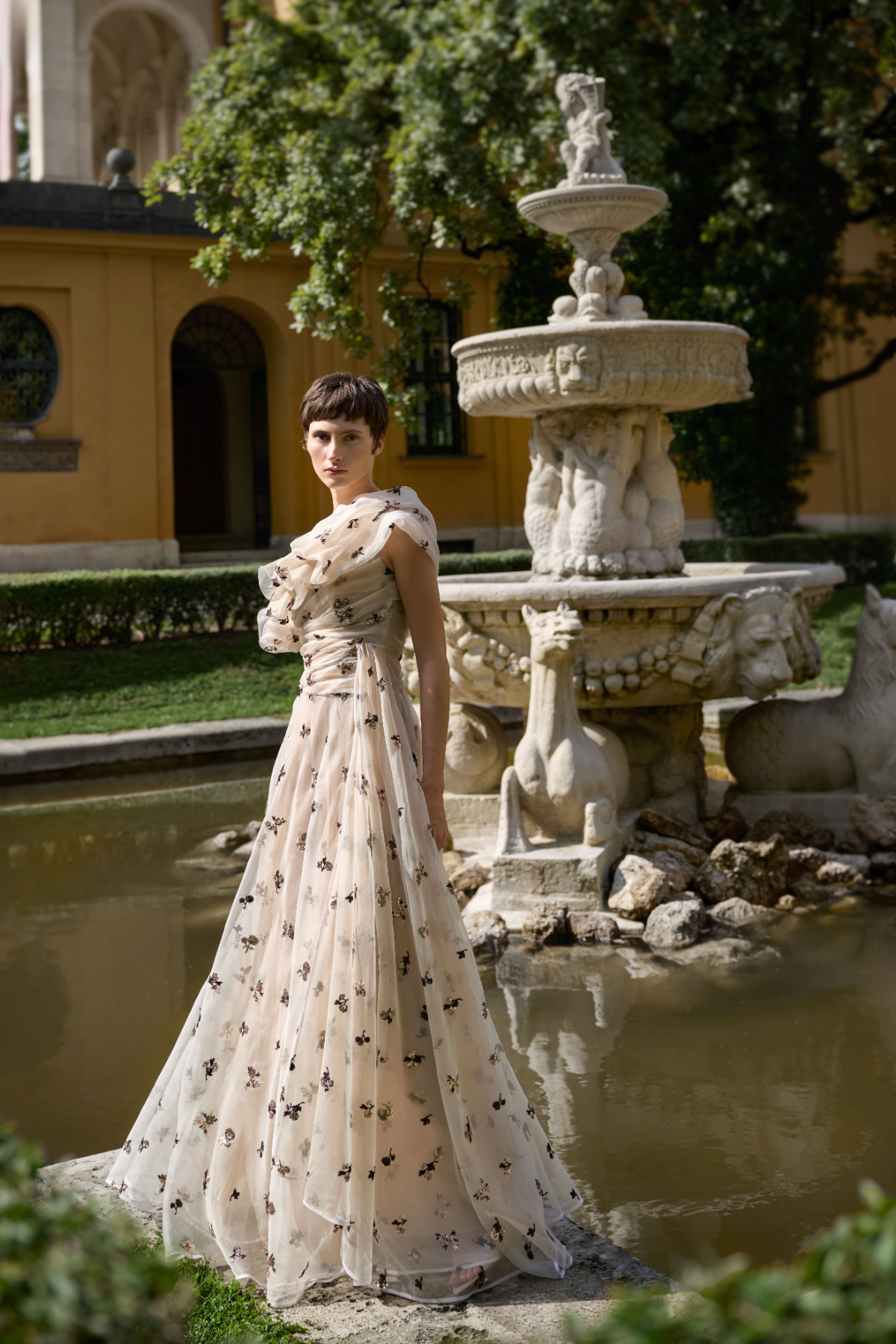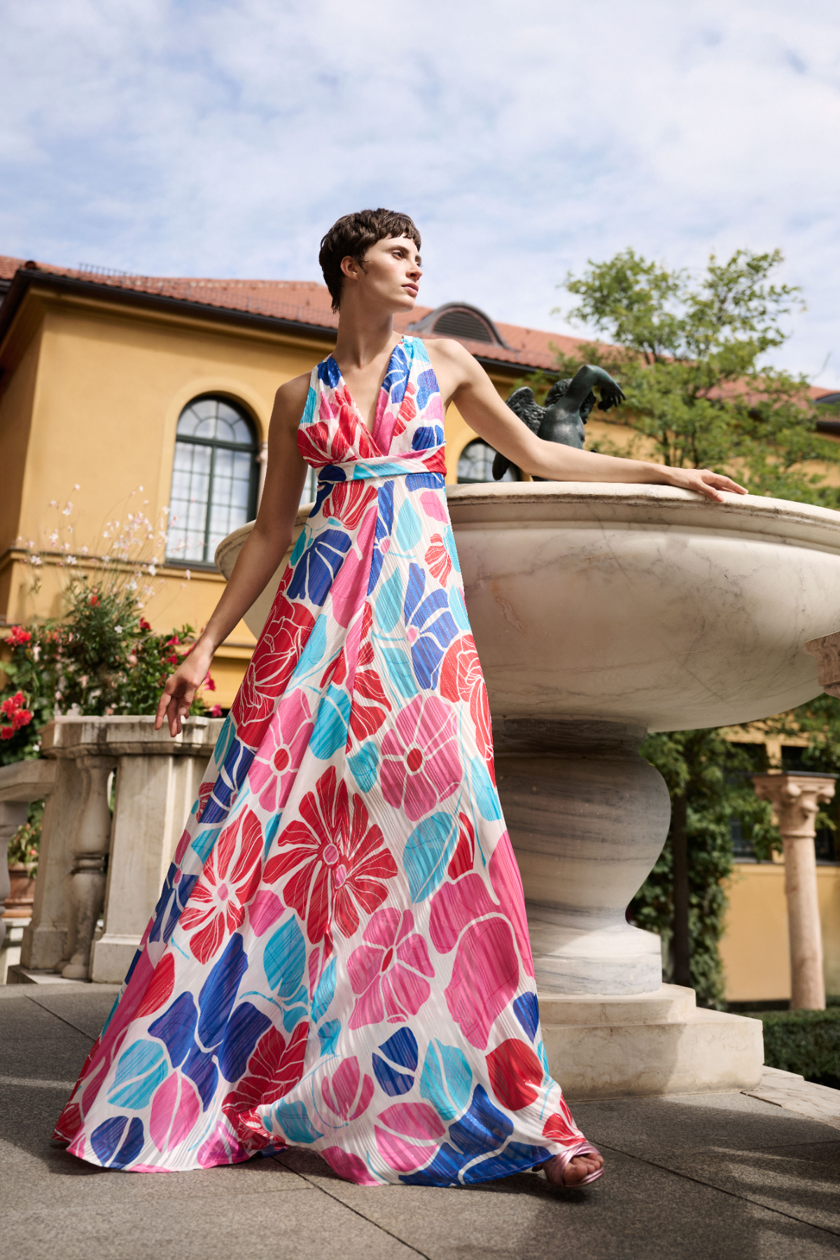 As early evening approaches, elegance takes the stage. Loosely cut styles in crepon — sometimes as an extravagant loose-fit midi cocktail look, sometimes as a jumpsuit — capture the lightness of the moment and make a modern statement. Delicate chiffon and subtly shimmering pekin, adorned with beautiful floral prints, transport you straight to the illustrious Amalfi Coast. Later in the evening, sparkling embroidered organza, presented as an opulent gown with ruffle details or a delicate midi skirt, ensures a grand entrance – a stylish rendezvous with Rome filled with glamour and retro vibes, blending modern sophistication with nostalgic charm.