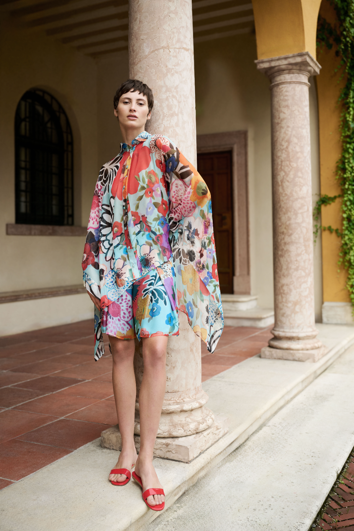 The sweet life reveals itself throughout every moment of the day. In the morning, feminine silhouettes take center stage, gaining an effortless ease through sporty elements and accompanying you seamlessly from everyday life to work. The shirt dress appears in countless variations: sometimes with a casually dropped shoulder, sometimes with refined waist ties that accentuate the figure. Whether in seersucker, softly shimmering cotton piqué, or canvas embroidered with sequins, these dresses are equally suited to a stroll through the city or a journey to the seaside. Shorts take on a more feminine look, with high waists, defined waistbands, and fluid volume – ideal for an afternoon walk through town or an evening aperitivo on the piazza.