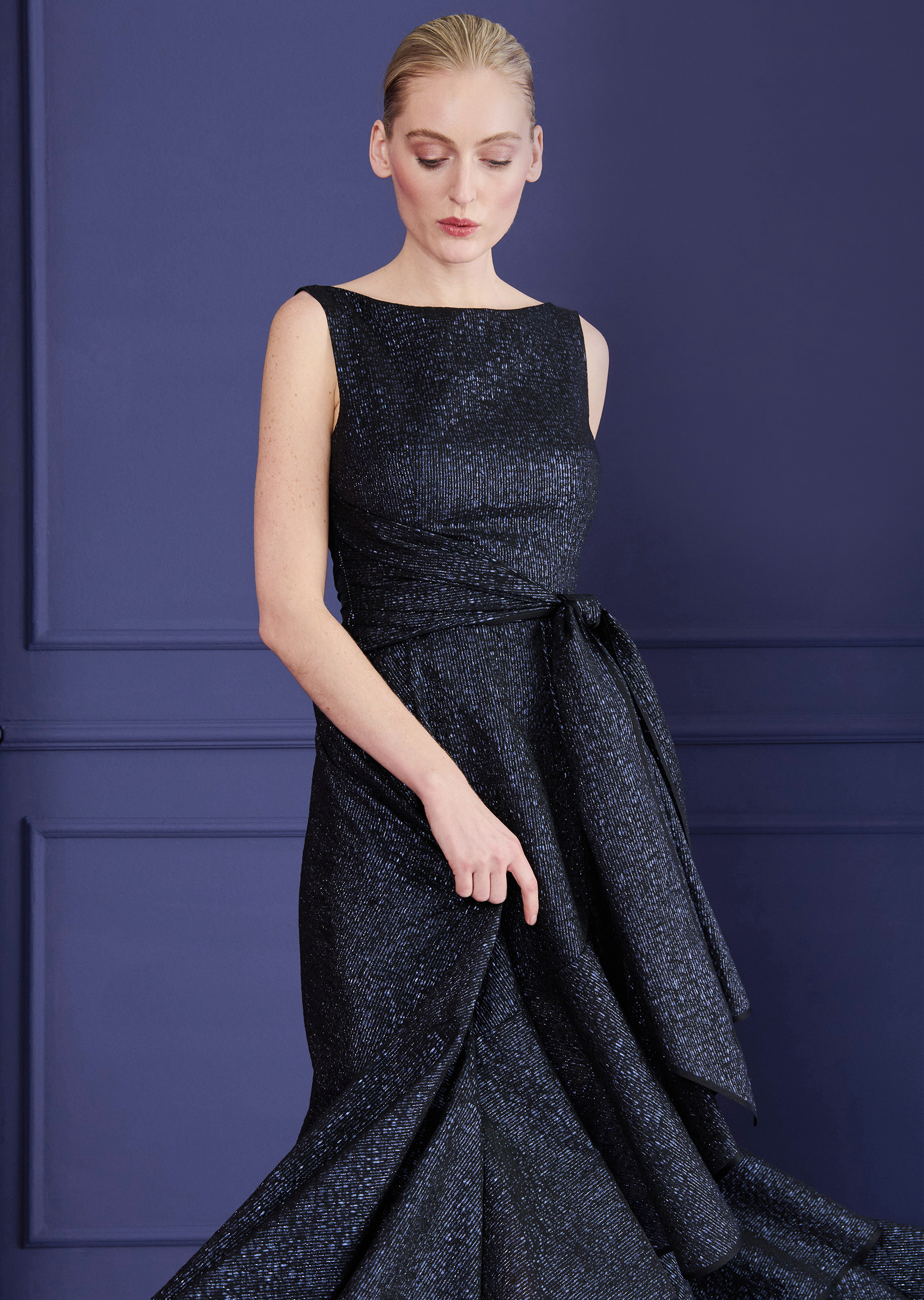 Who doesn’t like a light breeze to cool off on these exciting evenings? This evening dress is here to help. We made it out of a light flowing Organza Seersucker. Of course, it doesn’t disappoint in terms of style either, because this floor-length evening dress is bursting with that too. The bateau neckline is elegant. Draping around the waist with a softly draped bow detail conceals small problem areas. The skirt features an asymmetric design. This makes this dress even lighter and airier and lets it flow when in motion – especially on the dance floor. In the evening, give it a glamor upgrade with heeled sandals and a statement clutch!