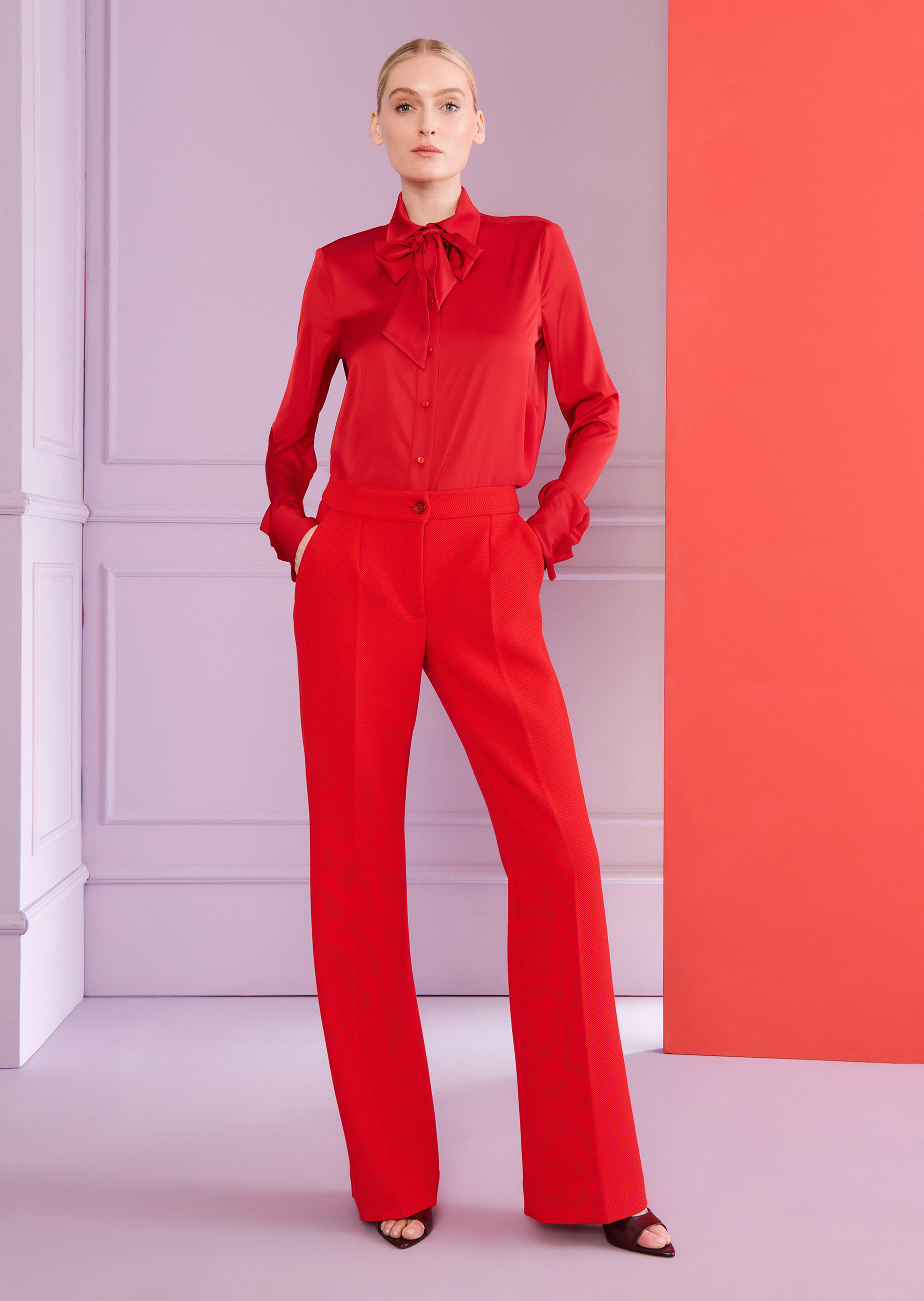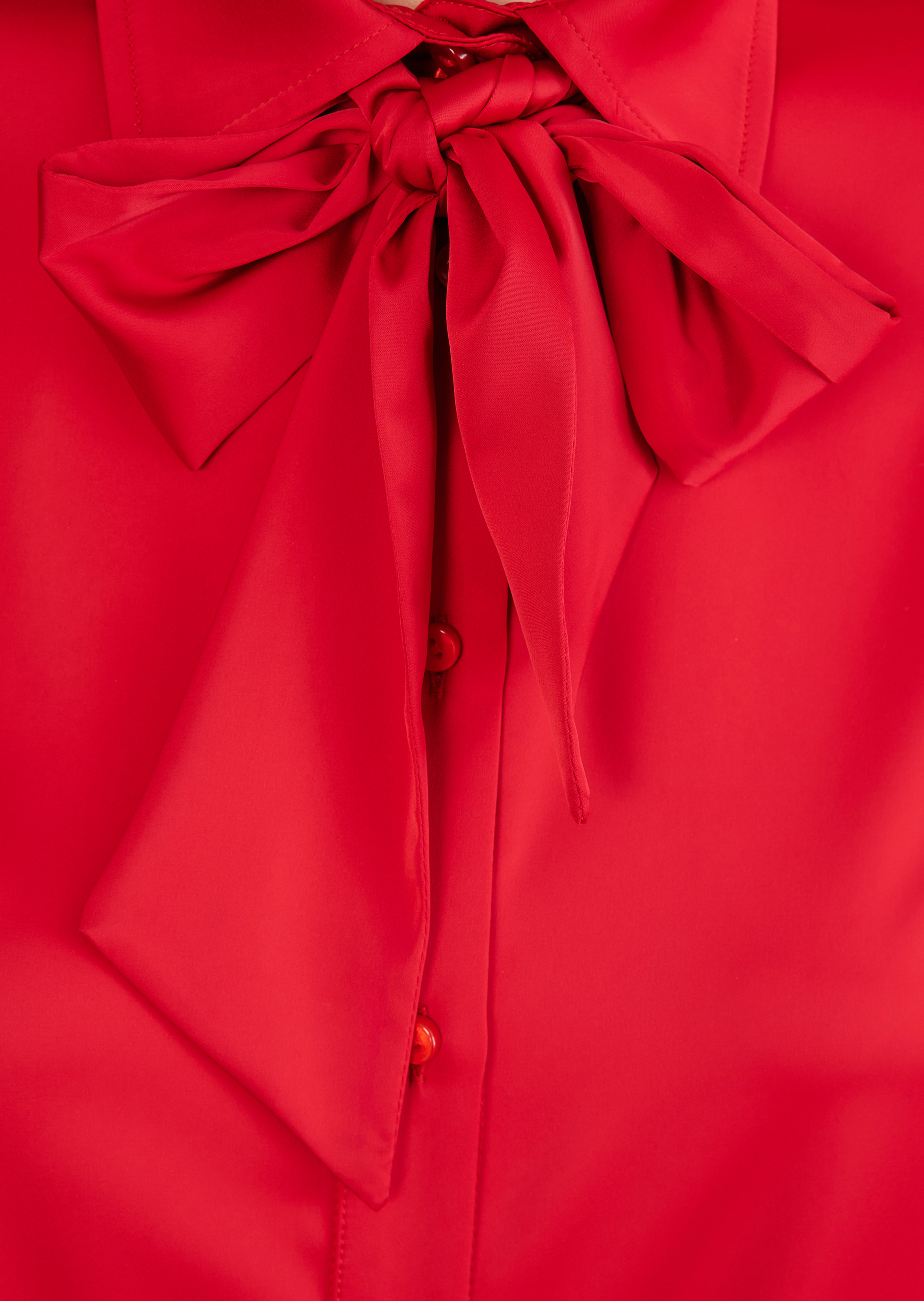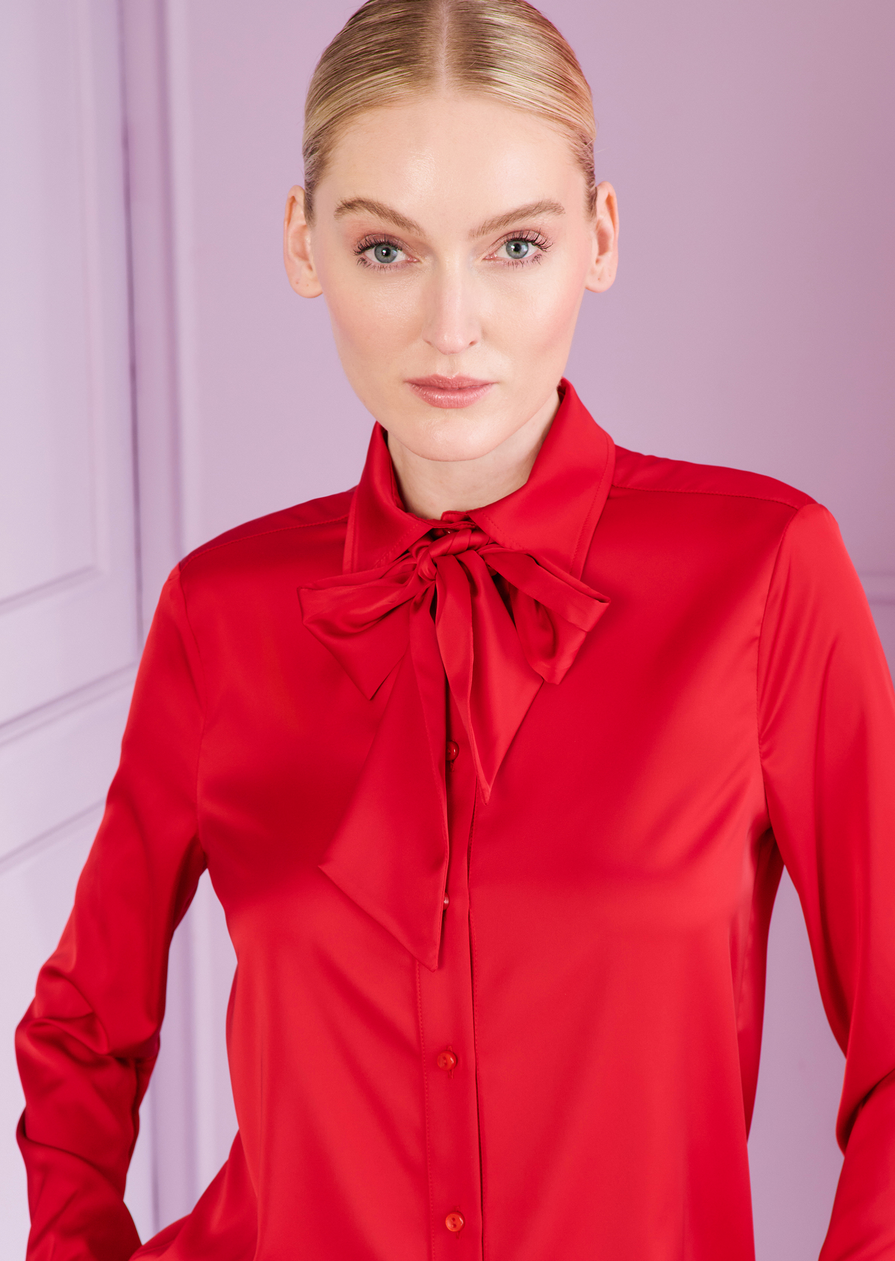 This blouse is a versatile classic: the cut is straight and it features a subtle button placket, a collar and slim-fitting sleeves with cuffs. The material adds a certain freshness. We made this top out of a lightweight voile satin, which is beautifully flowing and simply goes with everything. With the detachable pussycat bow, you can give it a prettier, more playful look as and when you please. Wear this blouse under a blazer with business pants, or with wide-leg culottes or a midi skirt for an exciting glamour look.