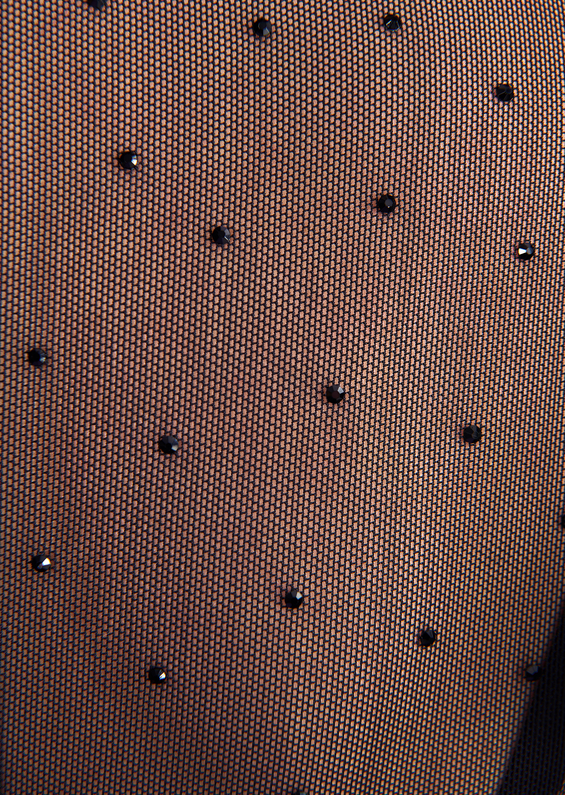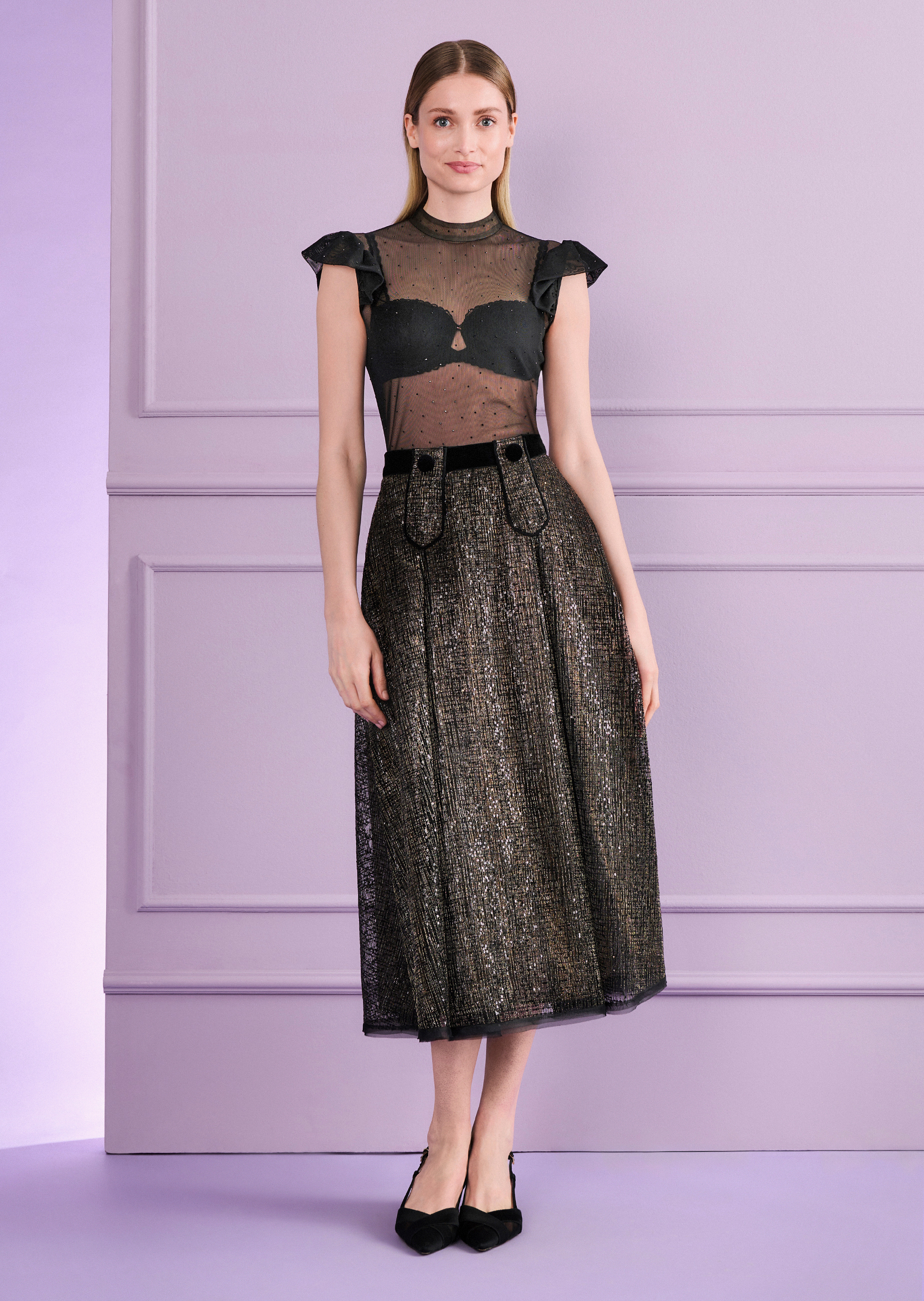This bodysuit with short ruffled sleeves, crafted from sparkling crystal tulle, is the perfect balance of glamour and allure – especially when styled as boldly as we’ve done here, worn sheer over lingerie. It’s a daring statement piece made for unforgettable party nights. Yet, its versatility makes it just as compelling in more refined pairings: replace a traditional dirndl blouse with it, layer it under sleeveless silhouettes, or style it beneath a sharply tailored tuxedo jacket, allowing just a subtle glimpse of lingerie to peek through.