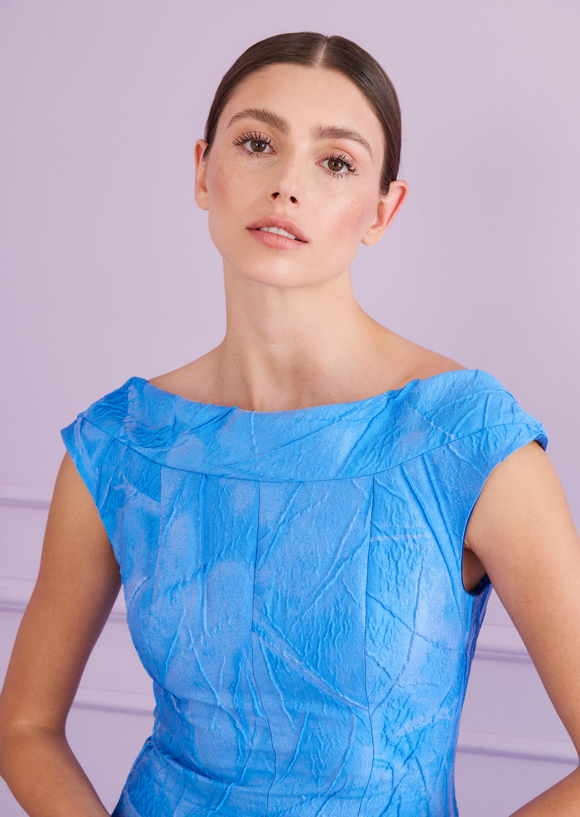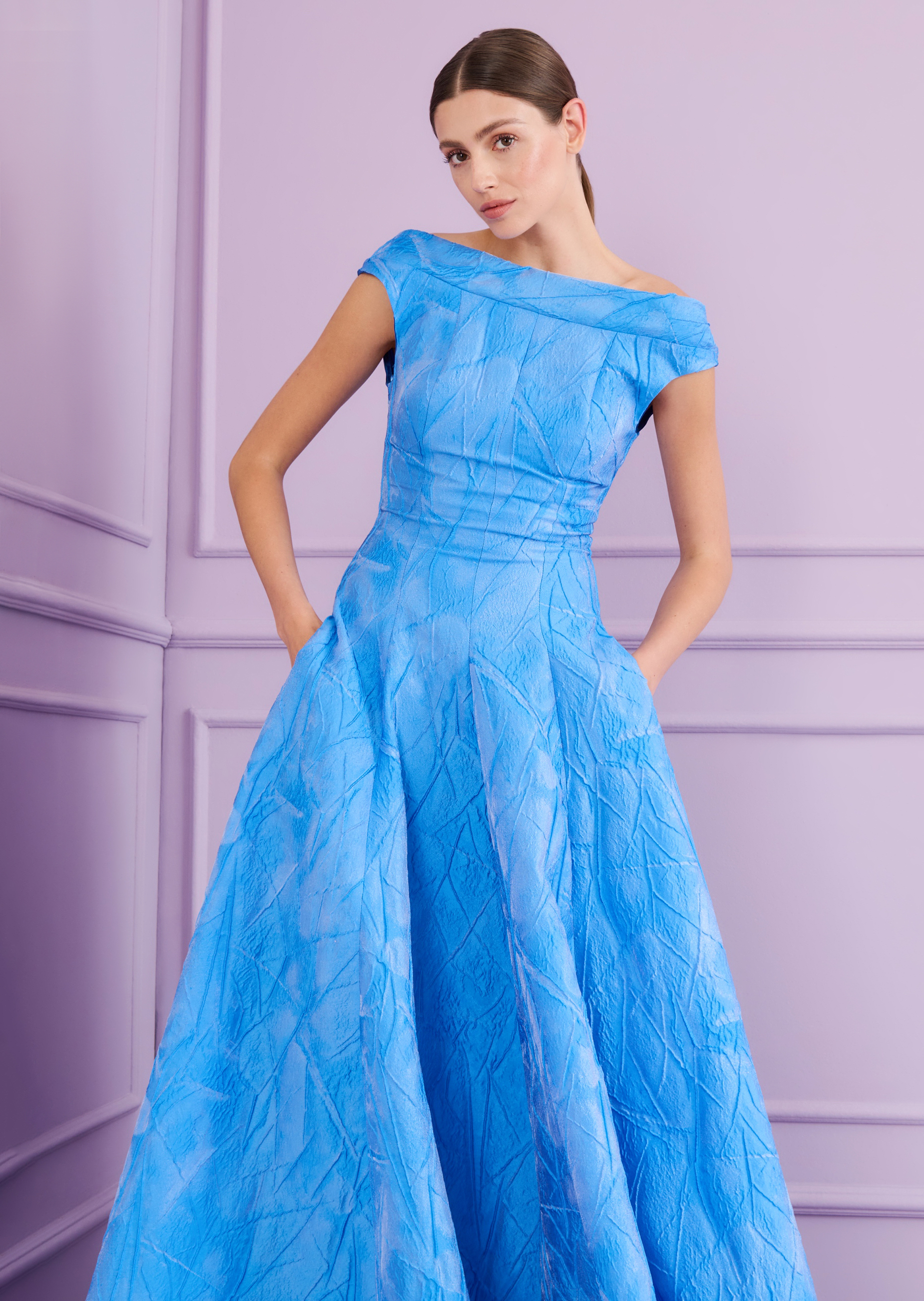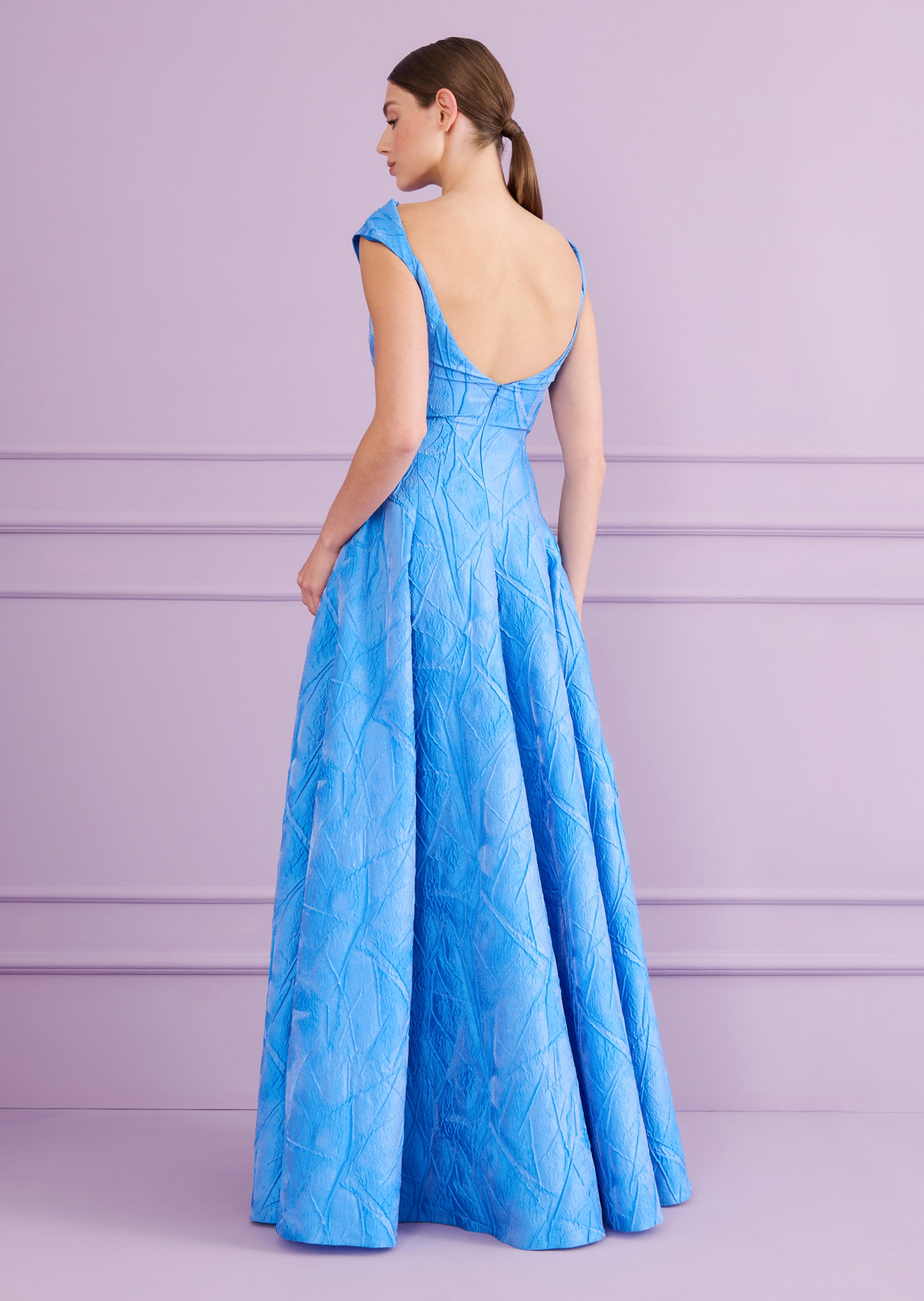 this is a truly spectacular gown with its beautiful back décolleté. the cut of the a-line skirt pays homage to your hips and makes your waist appear smaller than it might be, making this dress perfect for all sizes. on top of that the focus of the dress really is in the brilliant material, a light jacquard, bringing with it a beautiful shimmer; putting you in just the right light. toward the front of the dress this dress is elegantly reserved and takes direct influence from the fifties, but with a modern twist. in terms of jewelry its best to keep it simple with armbands; letting the dress do all the work for you.