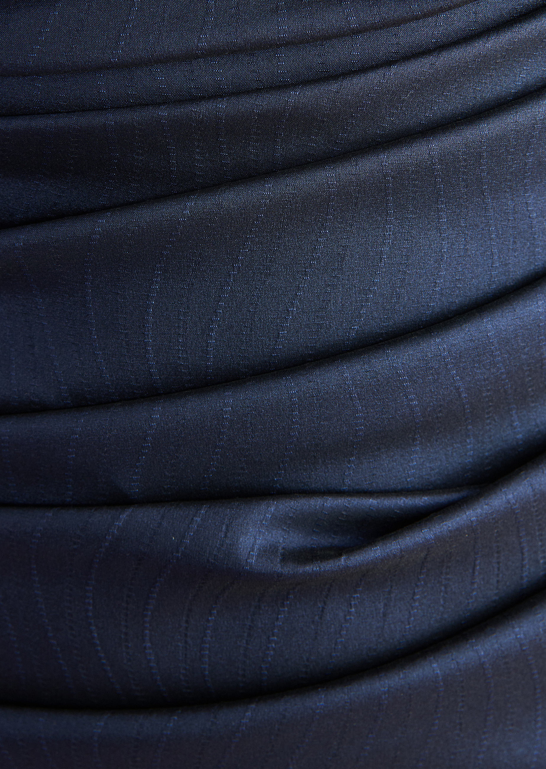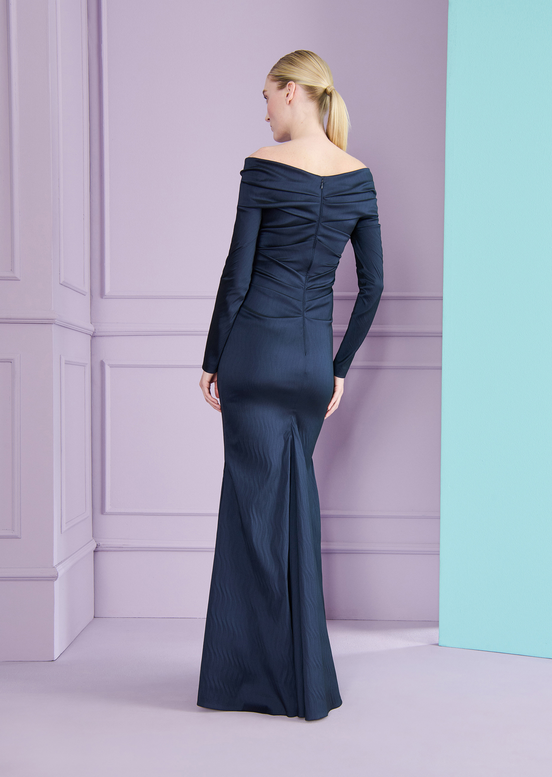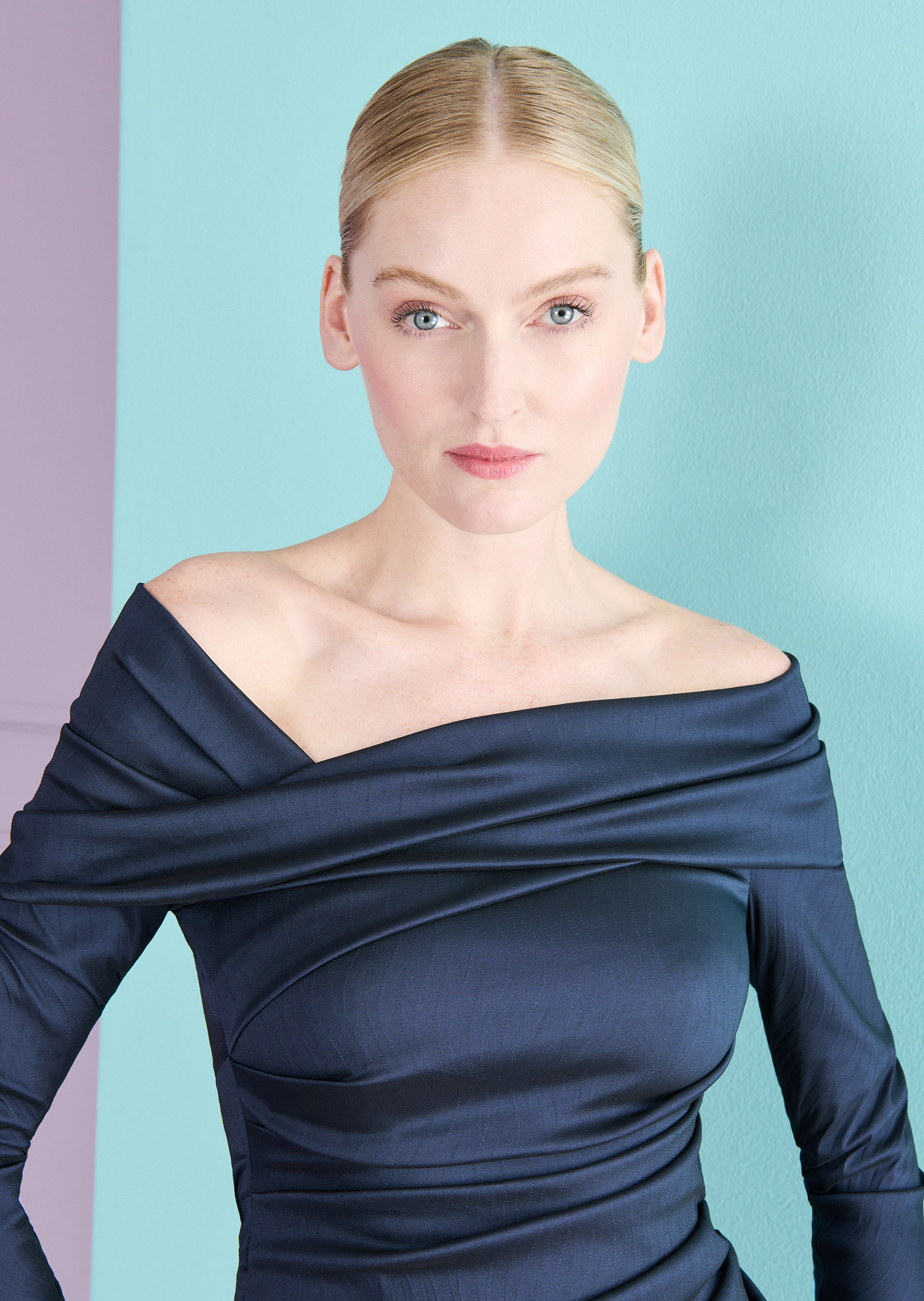 Behaving like a diva? That’s not your style! You prefer to express your inner diva through fashion with an exciting, glamorous look. This floor length evening gown helps you do just that. We made it out of an unbelievably comfortable stretch taffeta fabric. This fabric has a beautiful subtle shine and is also very comfortable to wear. The cut is quite something, too. The asymmetric drape on the upper body accentuates the shoulders, while additional draping makes the waist appear slimmer. Long sleeves boost your self-confidence. Plus, the fishtail skirt accentuates the feminine silhouette. All this makes this evening gown a perfect piece for the red carpet, an opera premiere or a formal dinner.