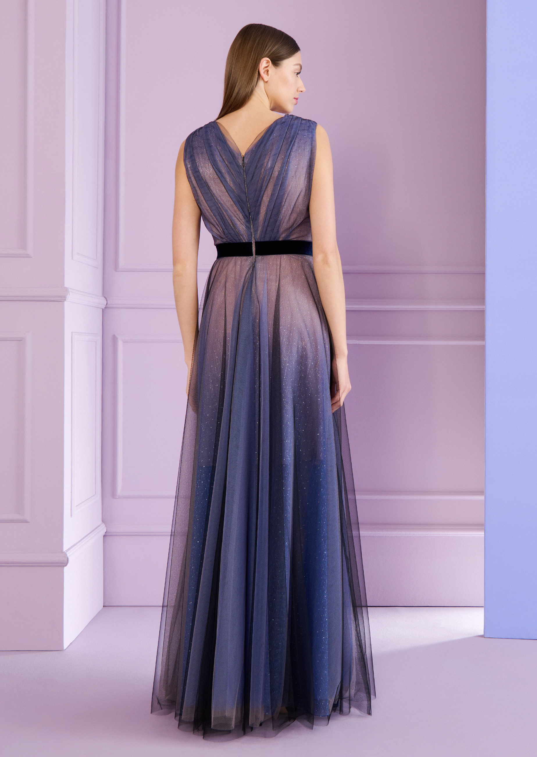 Time tulle dance! Because that’s exactly what this tulle gown invites you to do. Several layers of tulle in different colors have been worked into the dress, creating a fascinating color effect. The V-neckline skillfully showcases your décolletage, while the wide, swirling skirt ensures a graceful silhouette. The layer of shimmering metallic voile adds that special something extra, shining through the tulle and giving off a subtle glow. In this delicate dream of a dress, you are guaranteed a fairytale evening – and you will dance until well after midnight without this magic fading.