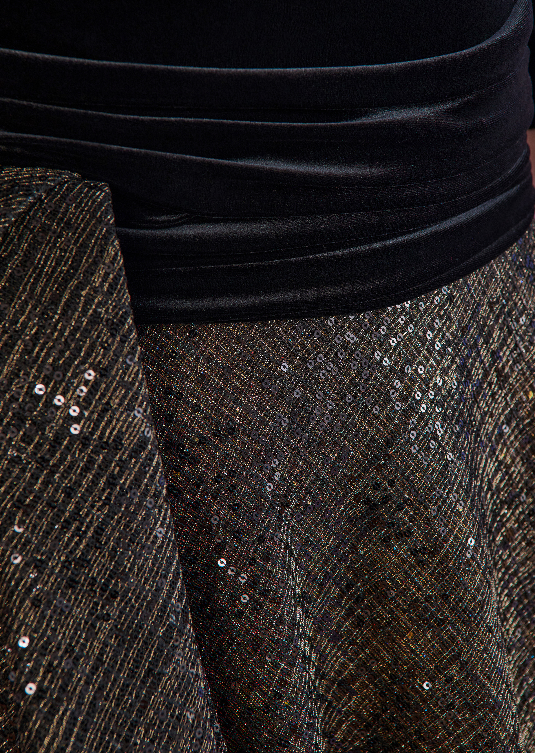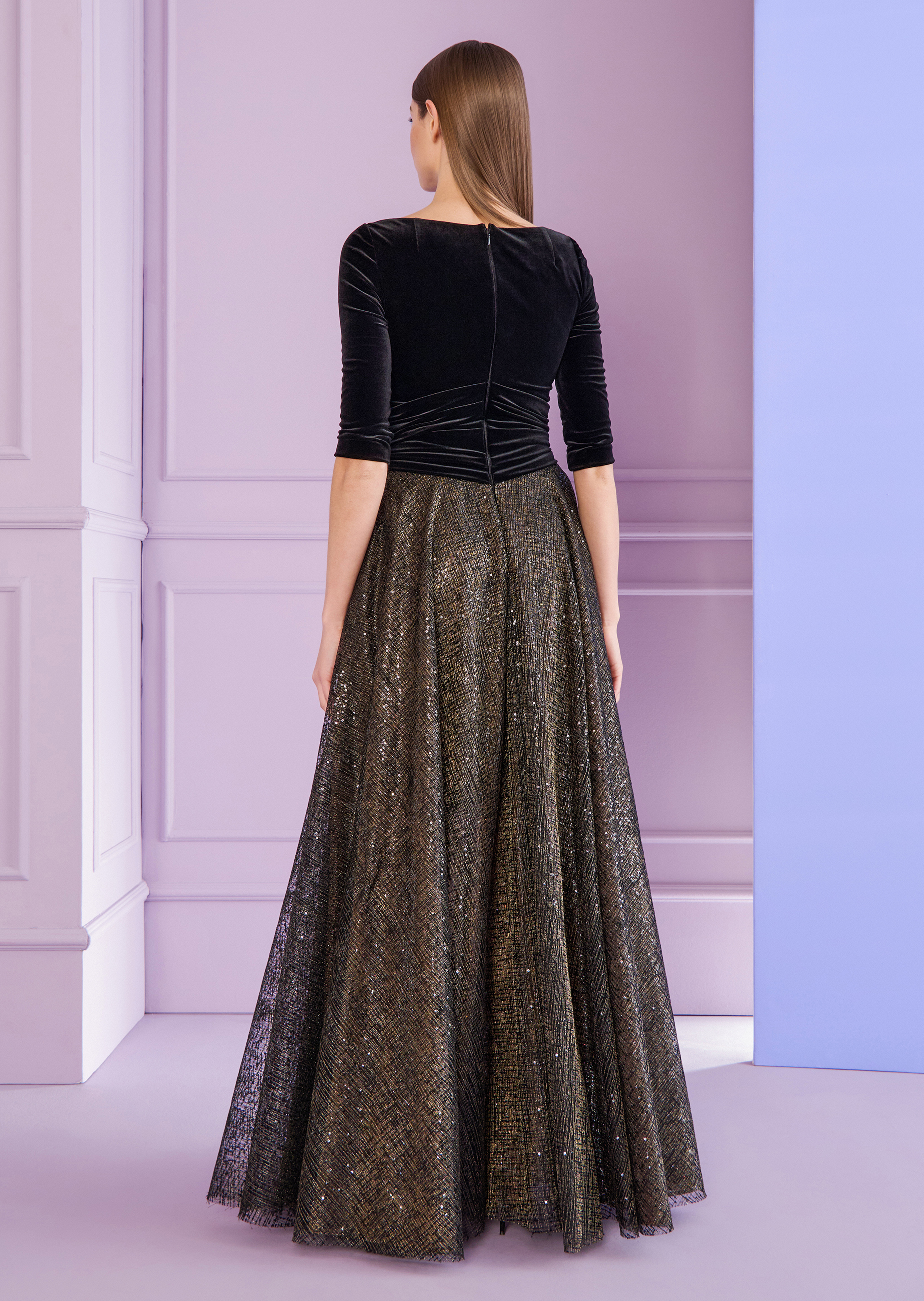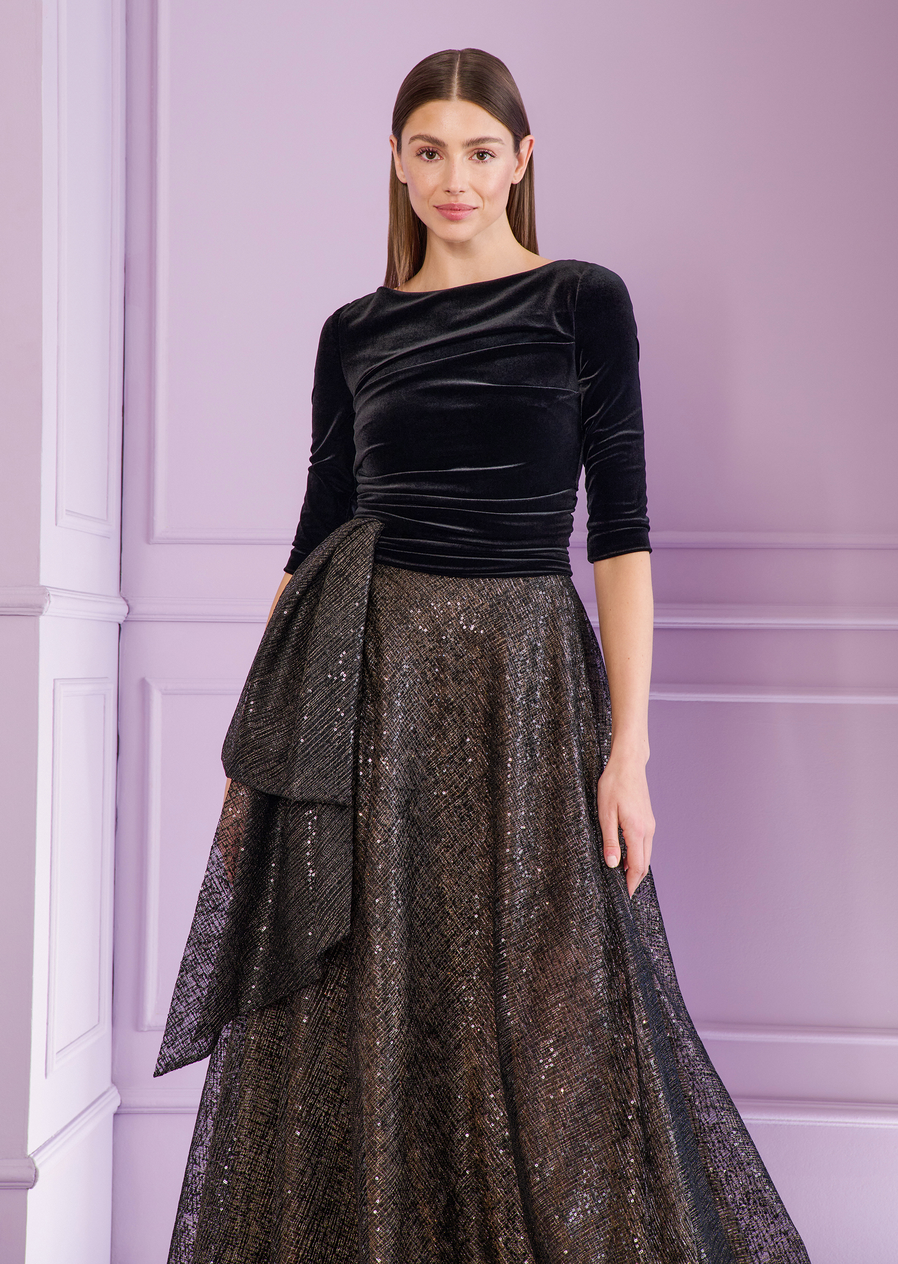 You’ll be the queen of the night in this evening dress! It combines classic elegance with a touch of sparkle. The high bateau neckline and mid-length sleeves ensure a stylish look, while sophisticated draping and a charming bow detail accentuate the waist. The shimmering velvet upper section feels wonderfully luxurious, while the floor-length tulle skirt with sequins guarantees the wow factor. It shimmers like a starry sky with every step. Perfect for lighting up the night and ensuring all eyes are on you!
