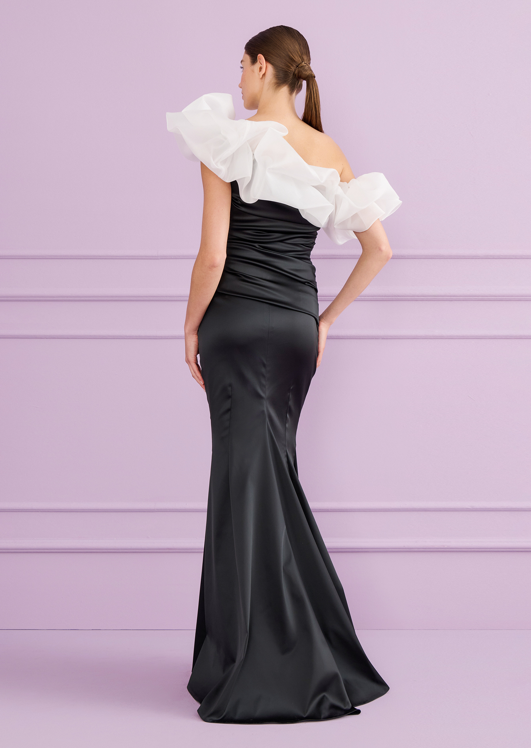 Time to ruffle things up! But not where you'd expect—this statement ruffle doesn't grace the hemline, it steals the spotlight up top. Flowing dramatically and asymmetrically across the bodice, the delicate organza detail turns this satin duchesse gown into a true showstopper. With its cinched waist and sculpting mermaid silhouette, you’re not just dressed for the red carpet—you own it. Soak up the spotlight and strike a pose. Tonight, you're the moment.