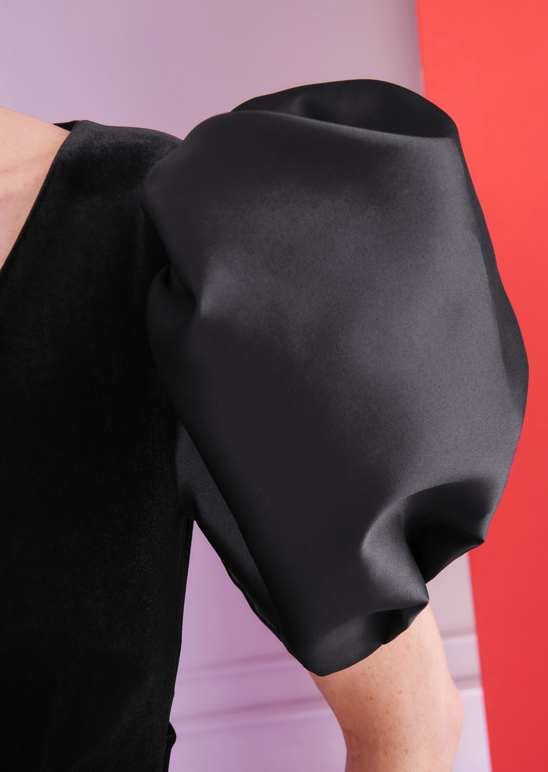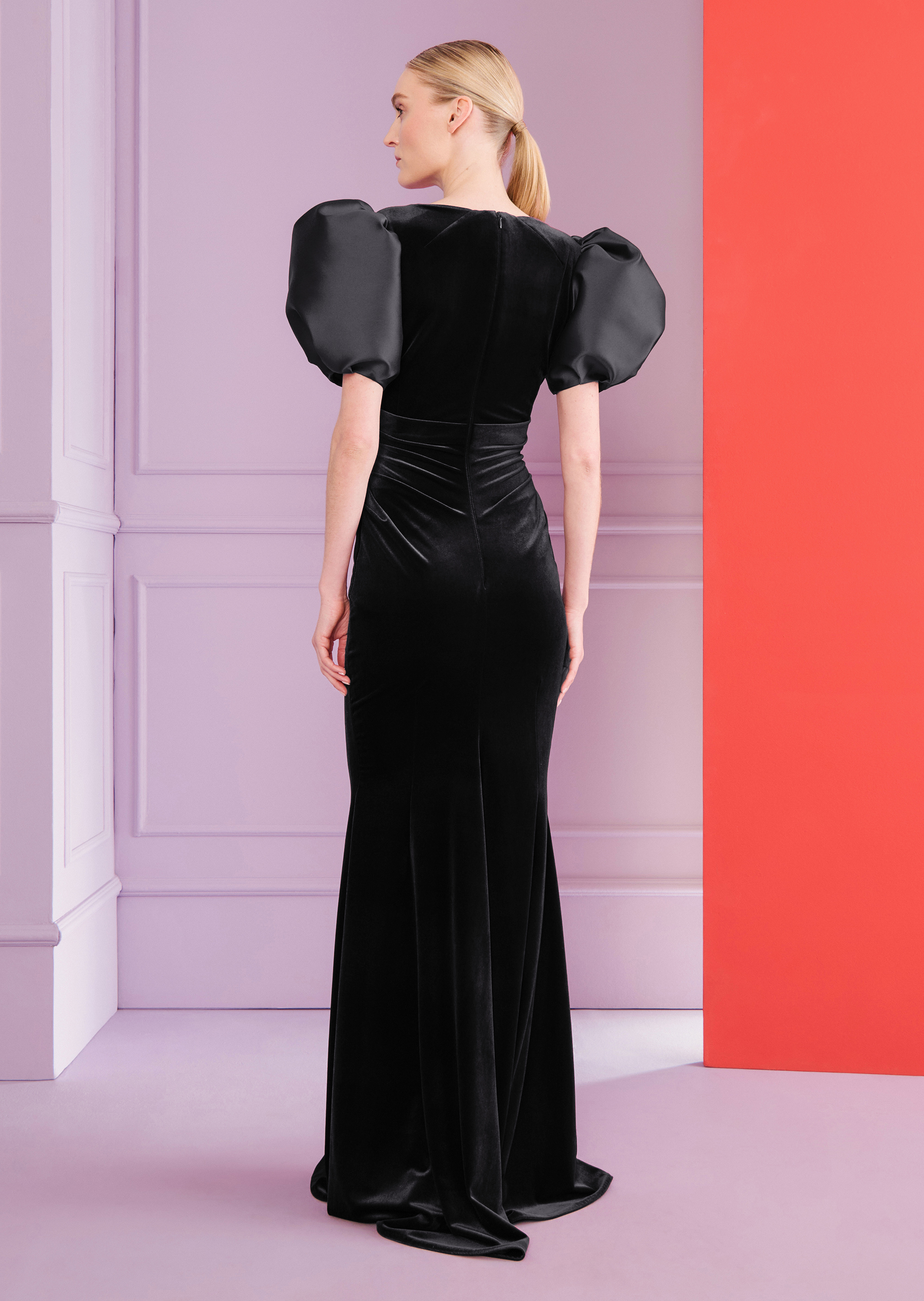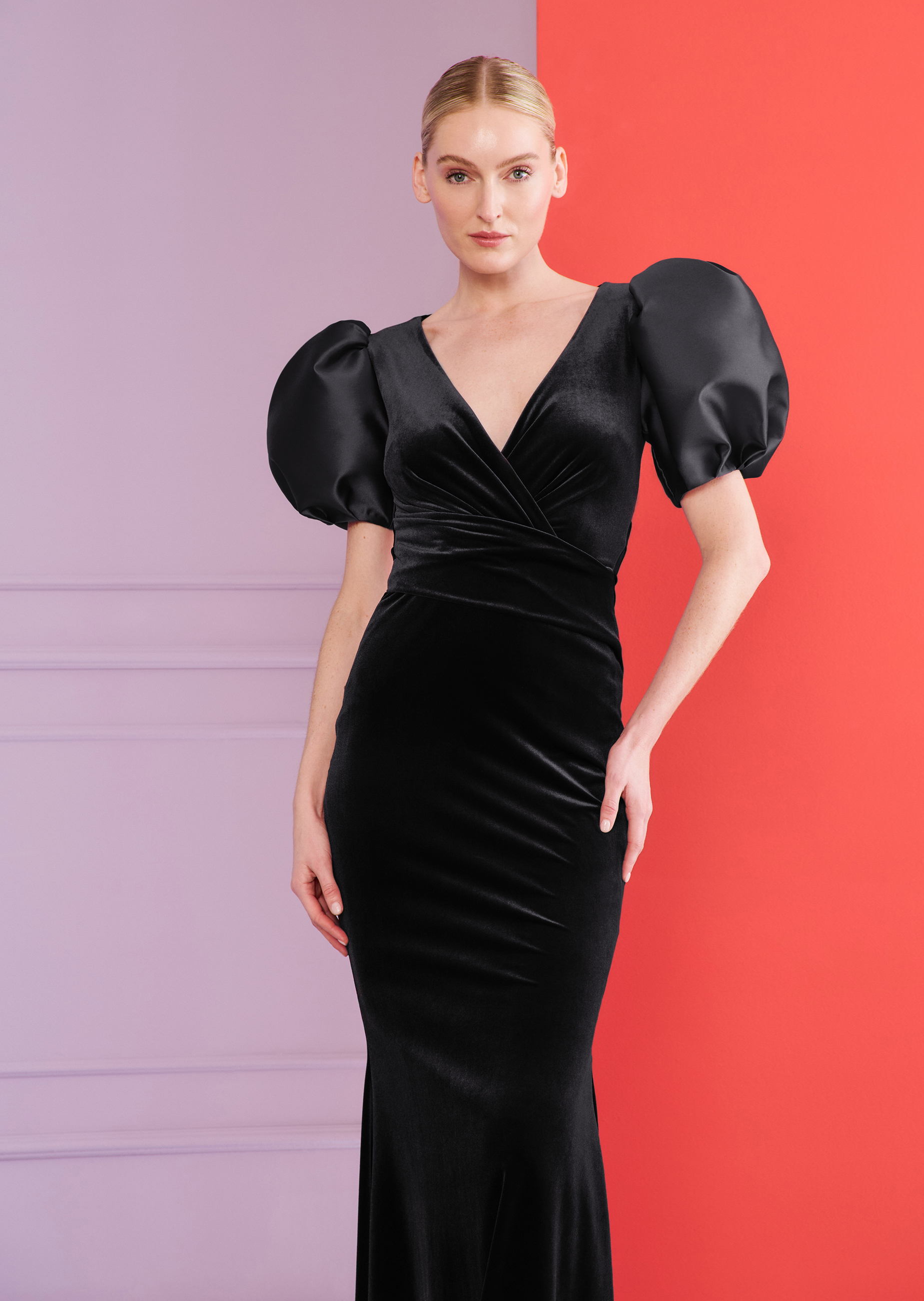 A game of contrasts – that sums up our new evening gown. Elegant, yet figure-defining and sexy. Glamorous and shimmering, yet incredibly comfortable. Modern, yet a timeless classic. Made of flowing stretch velvet, this dress combines a luxurious shine with the highest level of comfort. Thanks to the added stretch, the material hugs your silhouette beautifully and accentuates your feminine curves without constricting. The décolletage is skillfully accentuated without being too low-cut. Short sleeves with a delicate volume made of a contrasting radzimir fabric add a stylish touch to an otherwise classic look. The slim, draped waist merges into a subtly flared mermaid skirt, creating a dreamy hourglass silhouette. This dress is a versatile companion – ideal for traveling or special occasions – and stands out thanks to its durability. Whether you wear it elegantly with simple sandals and gold jewelry or trendy with statement heels, this evening gown can be reinterpreted over and over again and will serve you well for years to come.