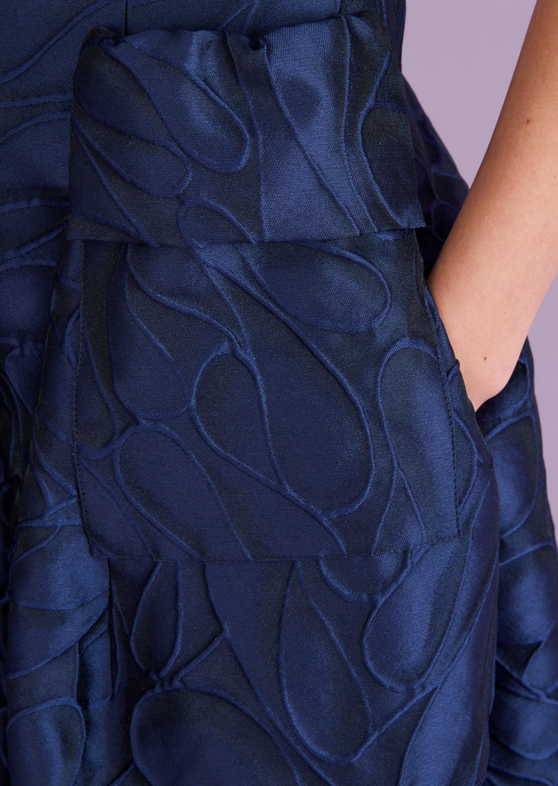 A touch of drama, defined by clean lines – this modern ballgown has plenty going for it. The refined, off-the-shoulder neckline of the expertly tailored bodice highlights your shoulders and adds an instant touch of glamour. A fitted waist flows into a full skirt that offers beautiful volume without overwhelming – keeping the silhouette fresh and contemporary. Deep patch pockets bring a relaxed twist to the look – and provide just the right space for the essentials: from credit card to lipstick. We crafted this floor-length evening gown from a stunning floral jacquard that drapes beautifully and features a subtly three-dimensional texture. The result? A look made for unforgettable nights and effortless elegance on the dance floor.