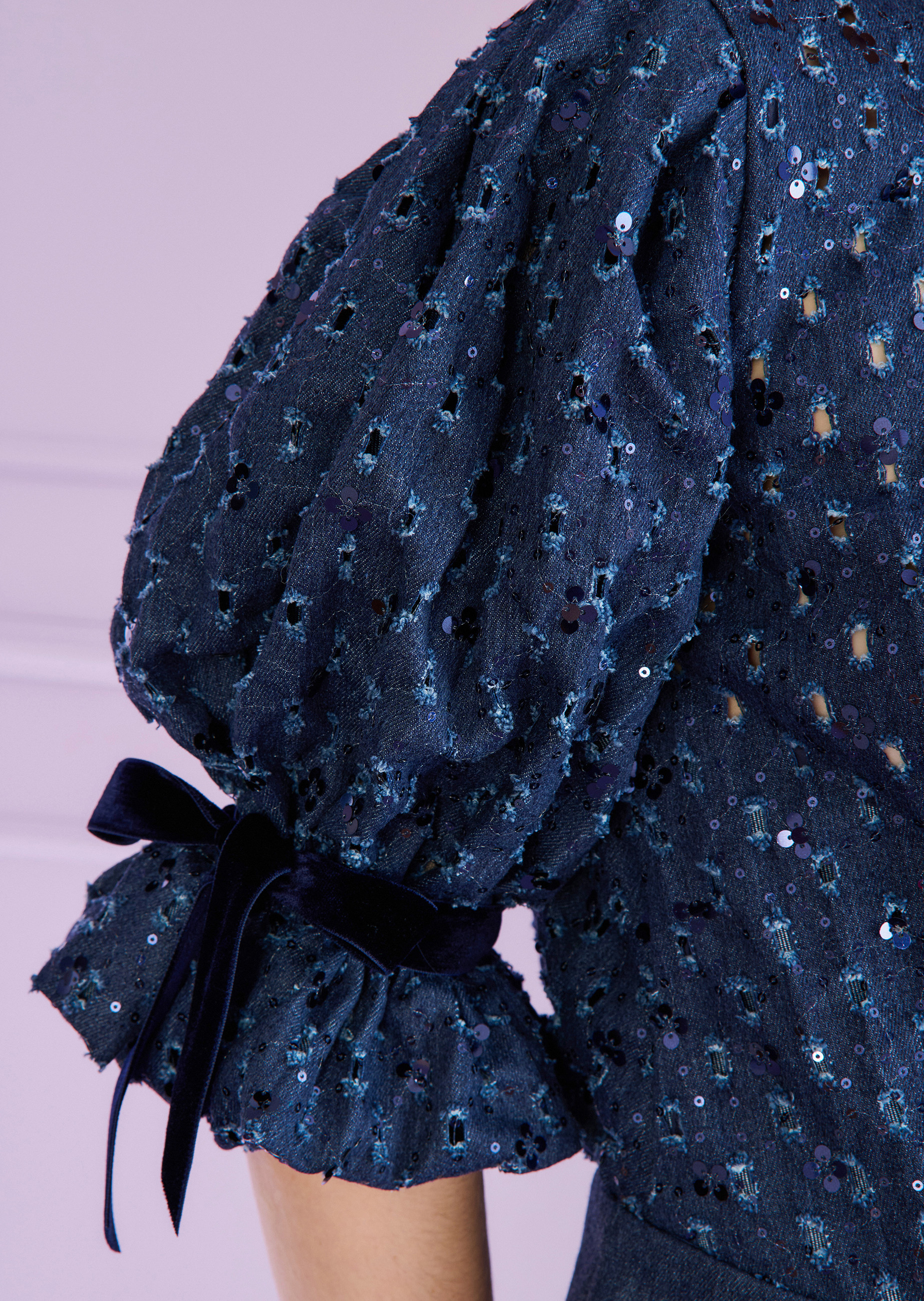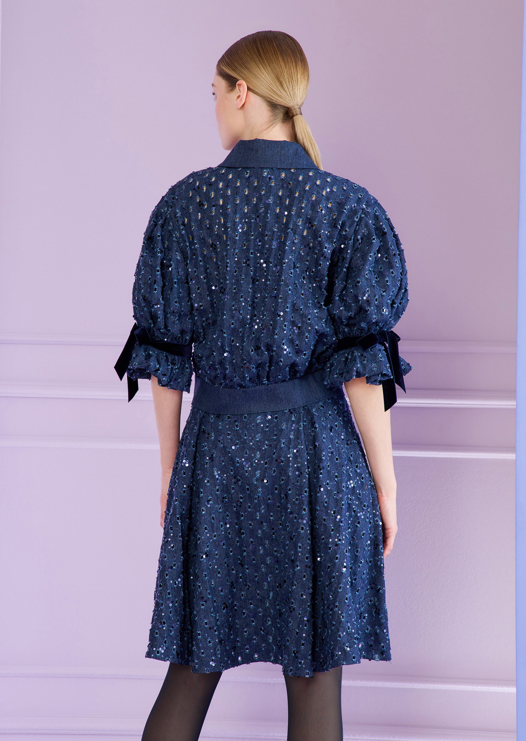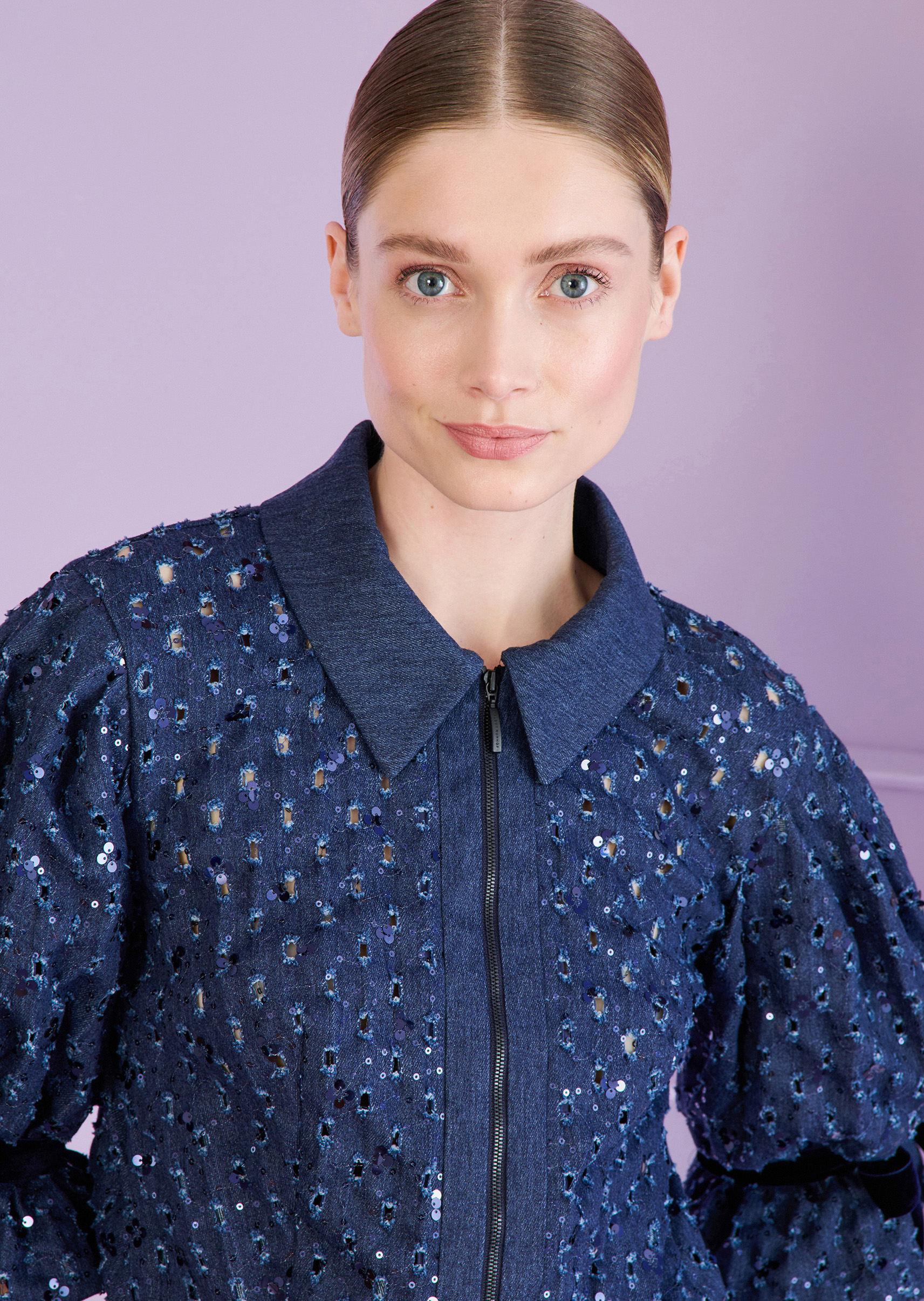 Make your denim jacket the highlight of your outfit: This piece has all the necessary qualities. The only real similarities it has with the fashion classic are the basic material, the collar and the short cut. The typical Talbot Runhof twist is evident in the sophisticated ripped hole pattern, the casual bomber cut and, above all, the striking puff sleeves, which give the jacket its unmistakable, stylish look. Style the jacket either in an all-over look with the matching skirt or as a deliberate highlight with a simple basic outfit!