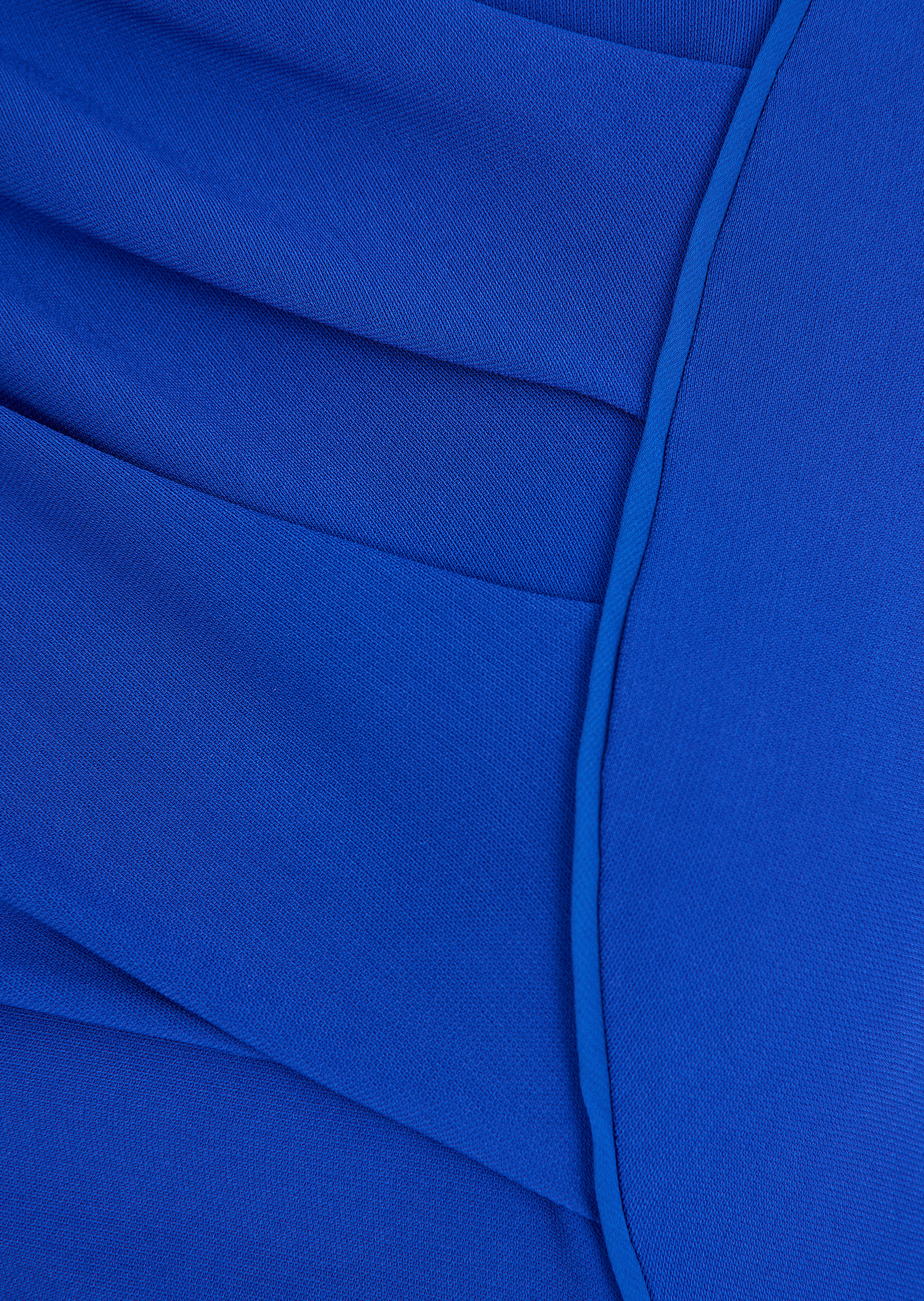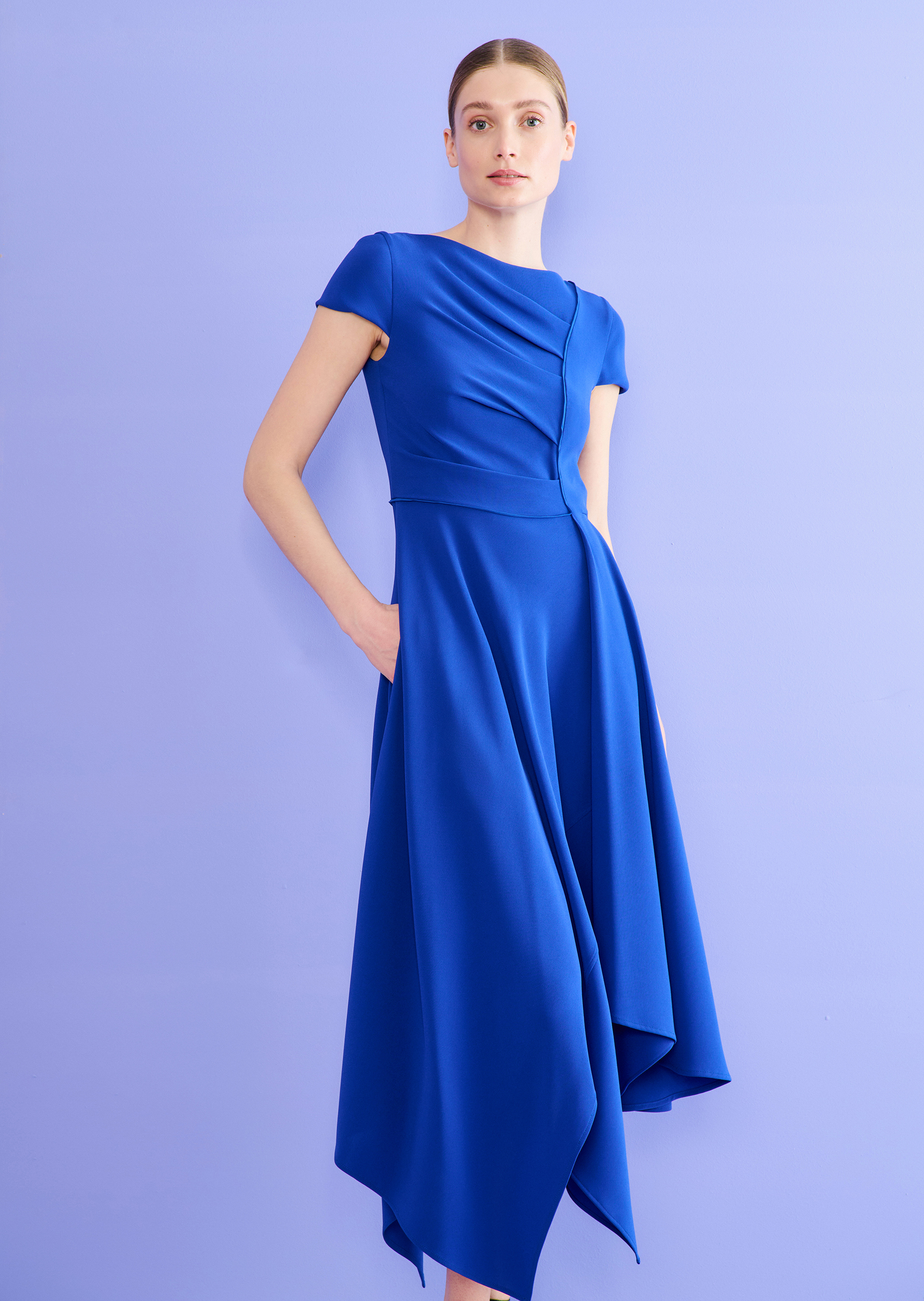 This midi dress combines lots of great features. It is casual yet elegant with a touch of high-end fashion. The upper section of this day dress is simple and elegant with a bateau neckline, short sleeves and soft draping. The skirt section, in particular, makes a strong fashion statement. The asymmetric hem is playful yet high-end and extravagant, and the combination of crêpe and chiffon gives it a wonderfully light feel. What’s more, the chiffon shows a flirtatious glimpse of leg. You can wear this midi dress for work during the daytime as well as for a glamorous evening event!