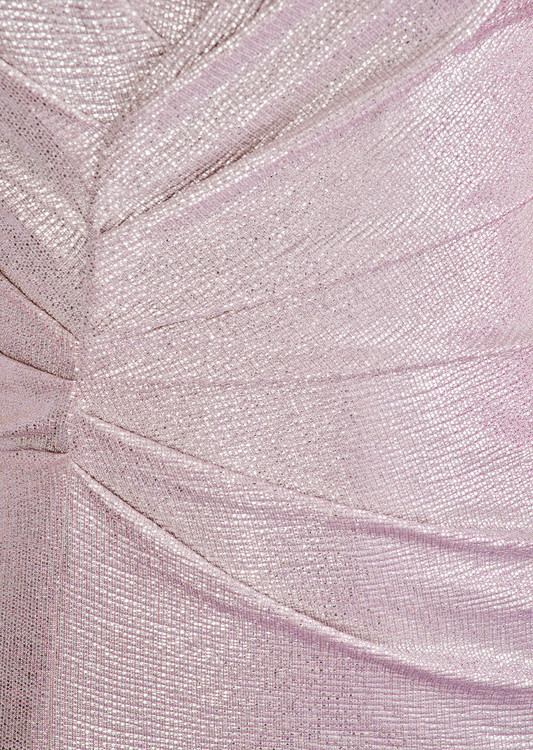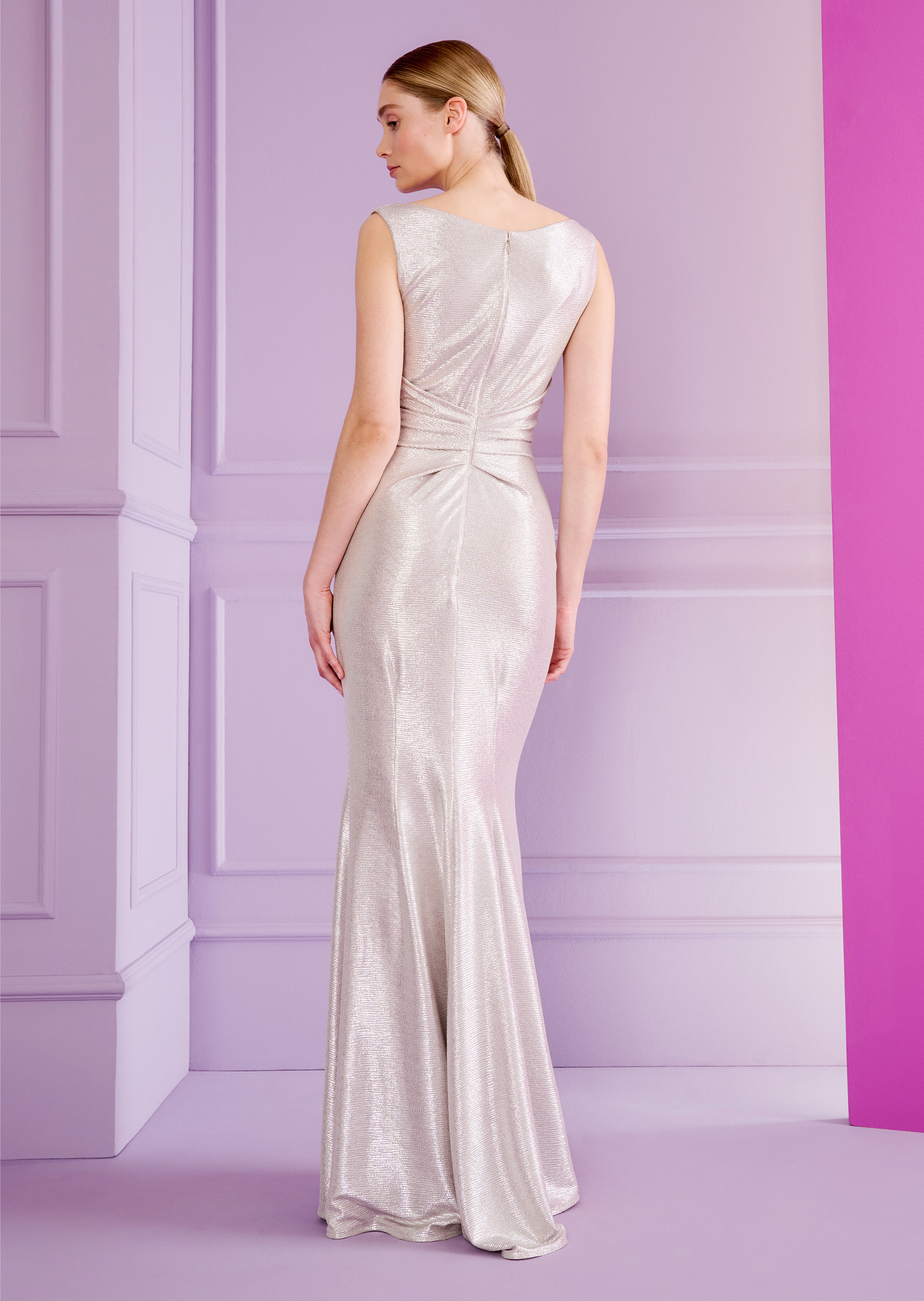 Your entrance will be one to remember in this floor-length evening gown in shimmering mirrorball stretch. Its cut is fluid, creating a beautiful asymmetric silhouette. This sleeveless piece with a subtle neckline and a high, racy slit is perfect for evening events when you want to stand out in the crowd in an elegant, glamorous look. Simply add your matching metallic sandals and you are good to go...