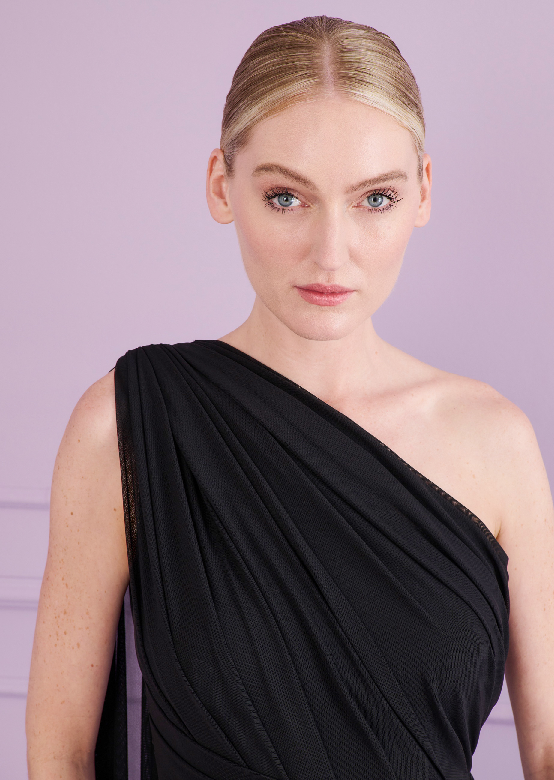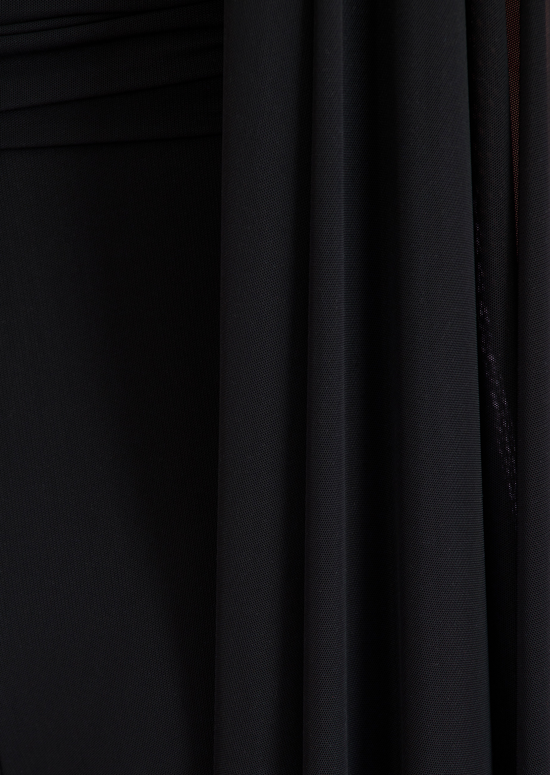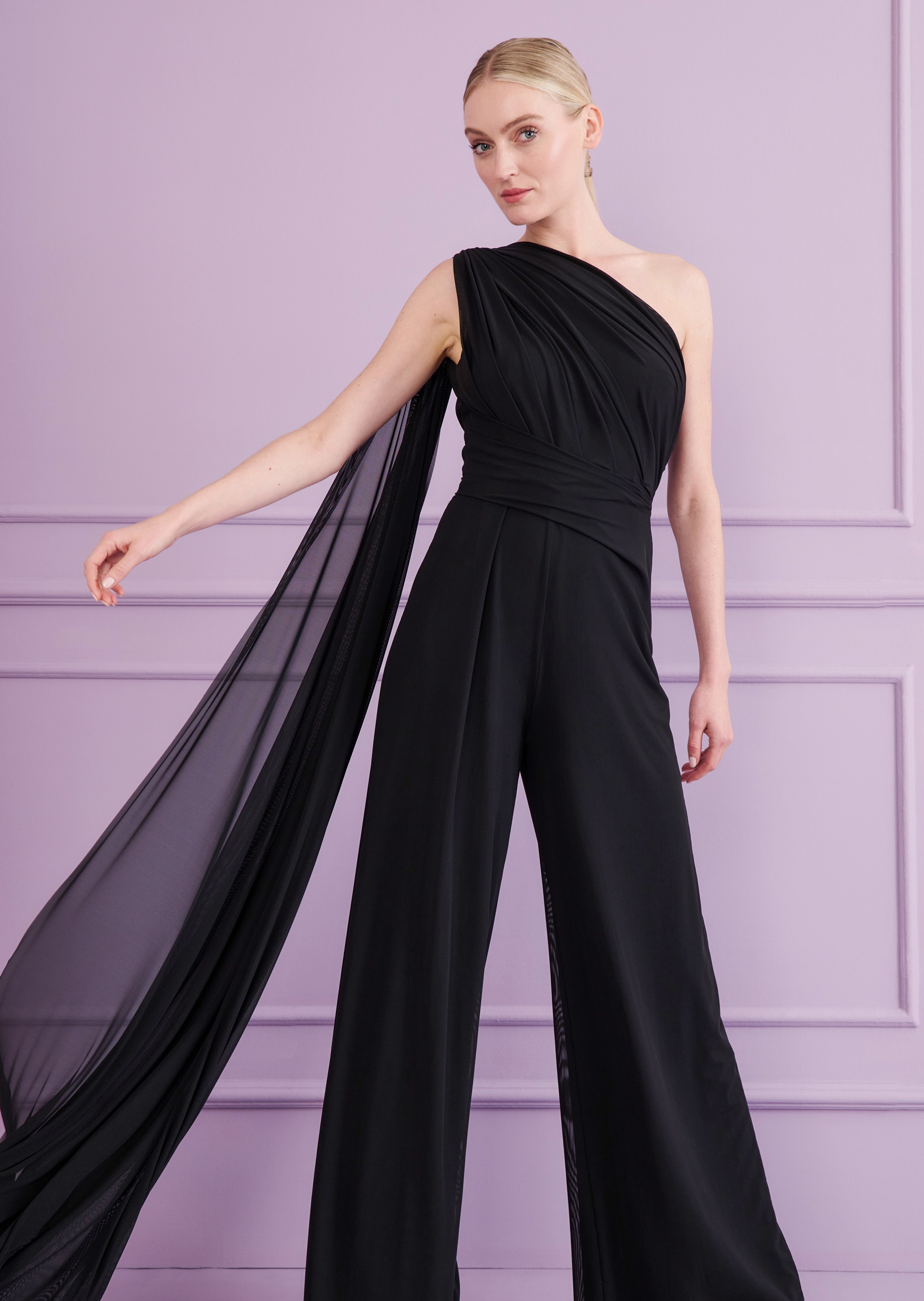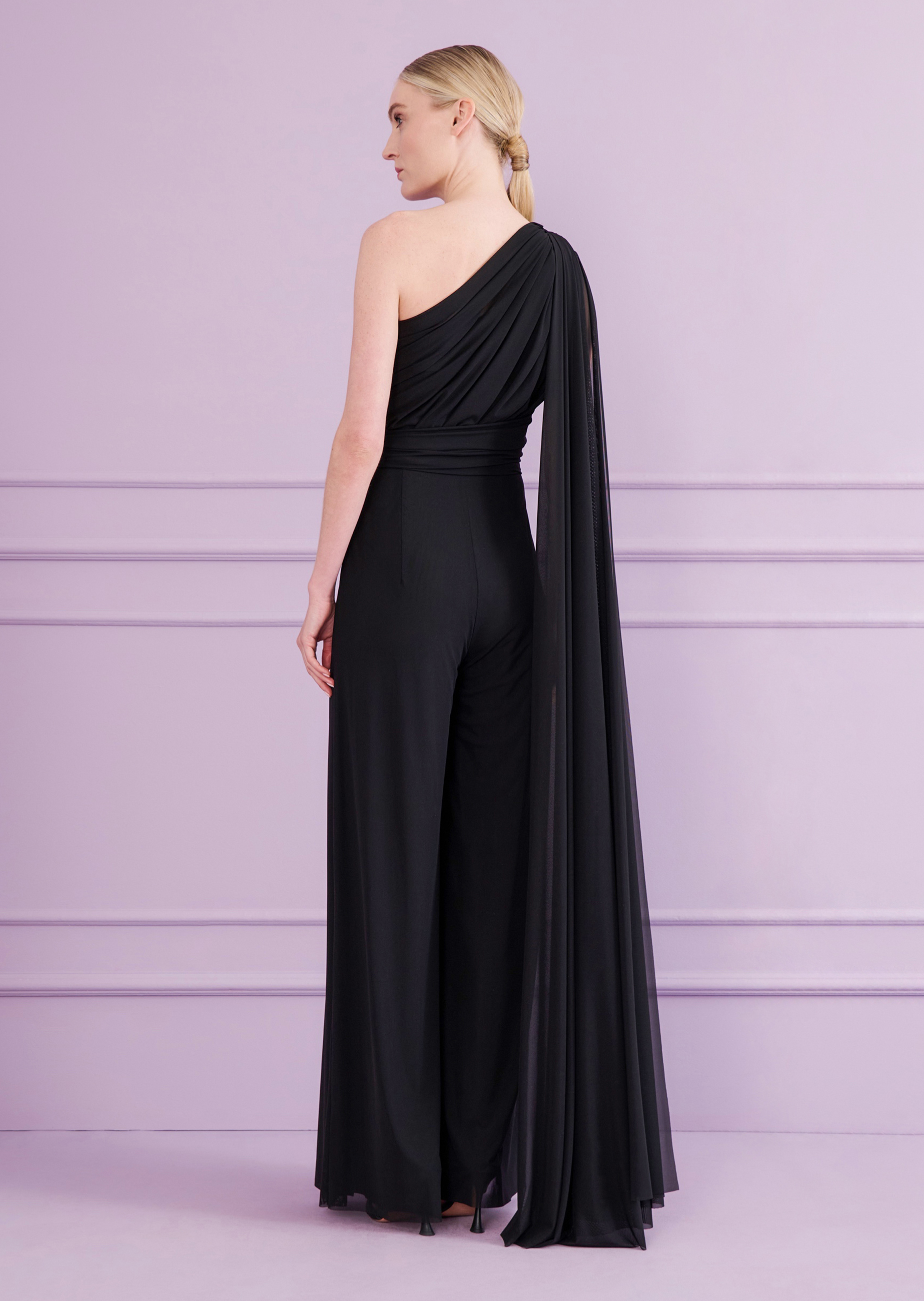 So much glamour, so much lightness ... Our new favorite one-piece feels like a dream on the skin - and looks just like one. Made from fine stretch tulle, it combines the elegance of an evening gown with the light-heartedness of a jumpsuit. The one-shoulder look draws the eye gently to the shoulder, while a flowing cape on the other side wafts behind you like a delicate veil - a touch of magic with every step, every turn. Delicate draping flatters the waist and conjures up a beautifully defined silhouette. The wide leg lends the look feminine sophistication while remaining wonderfully casual - perfect for dancing the night away. Add a pair of sandals and sparkling earrings - and you're ready to win hearts.