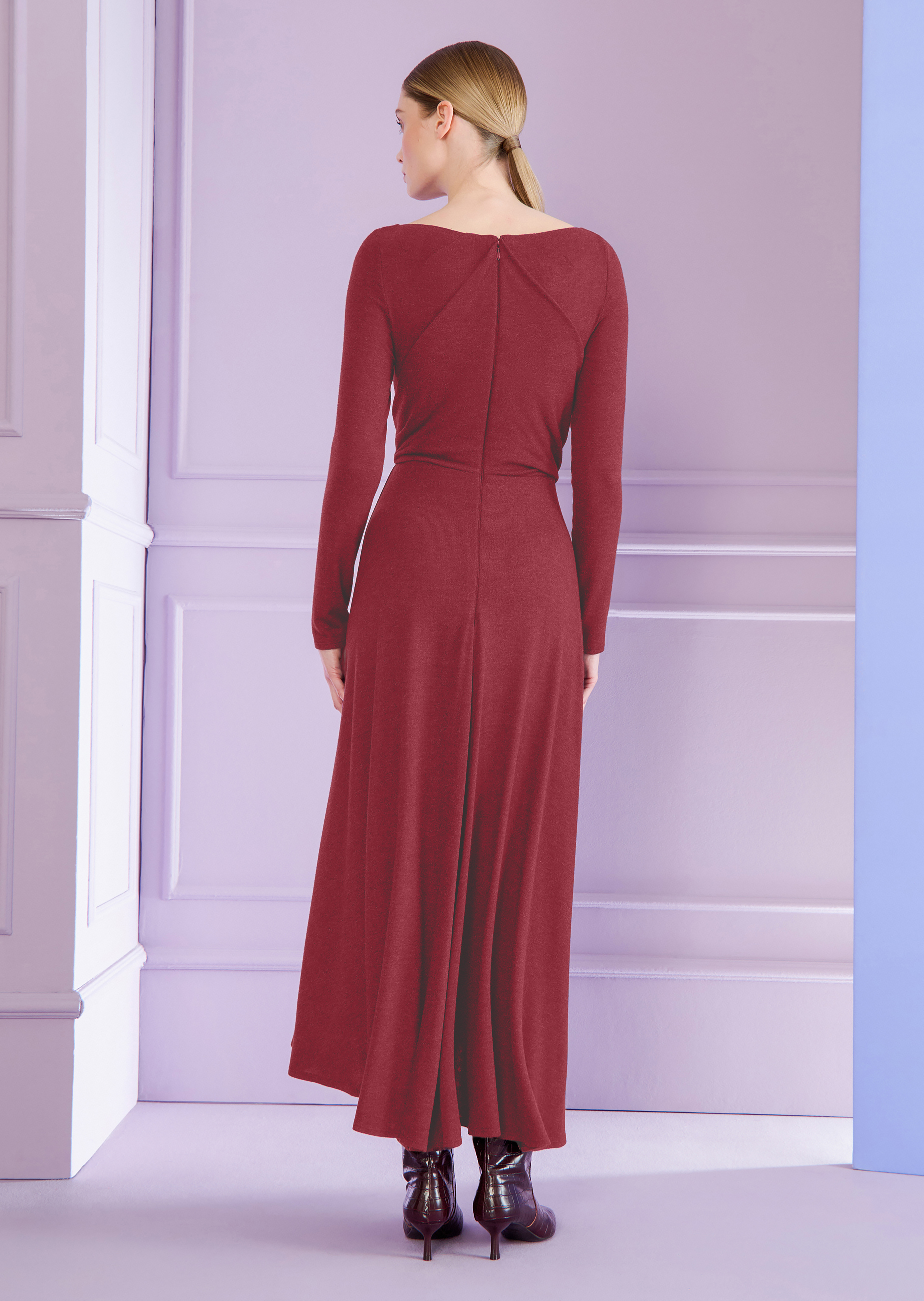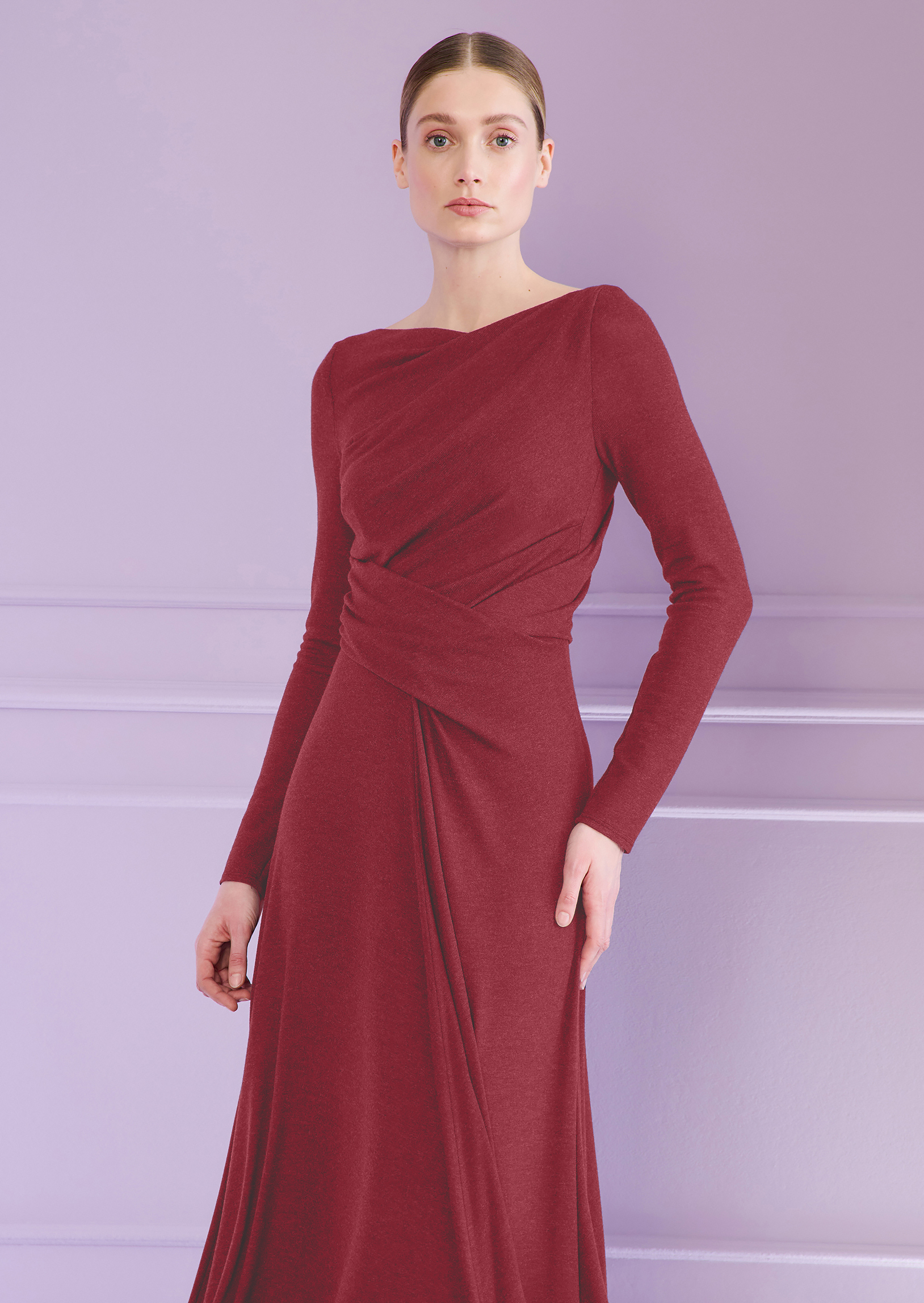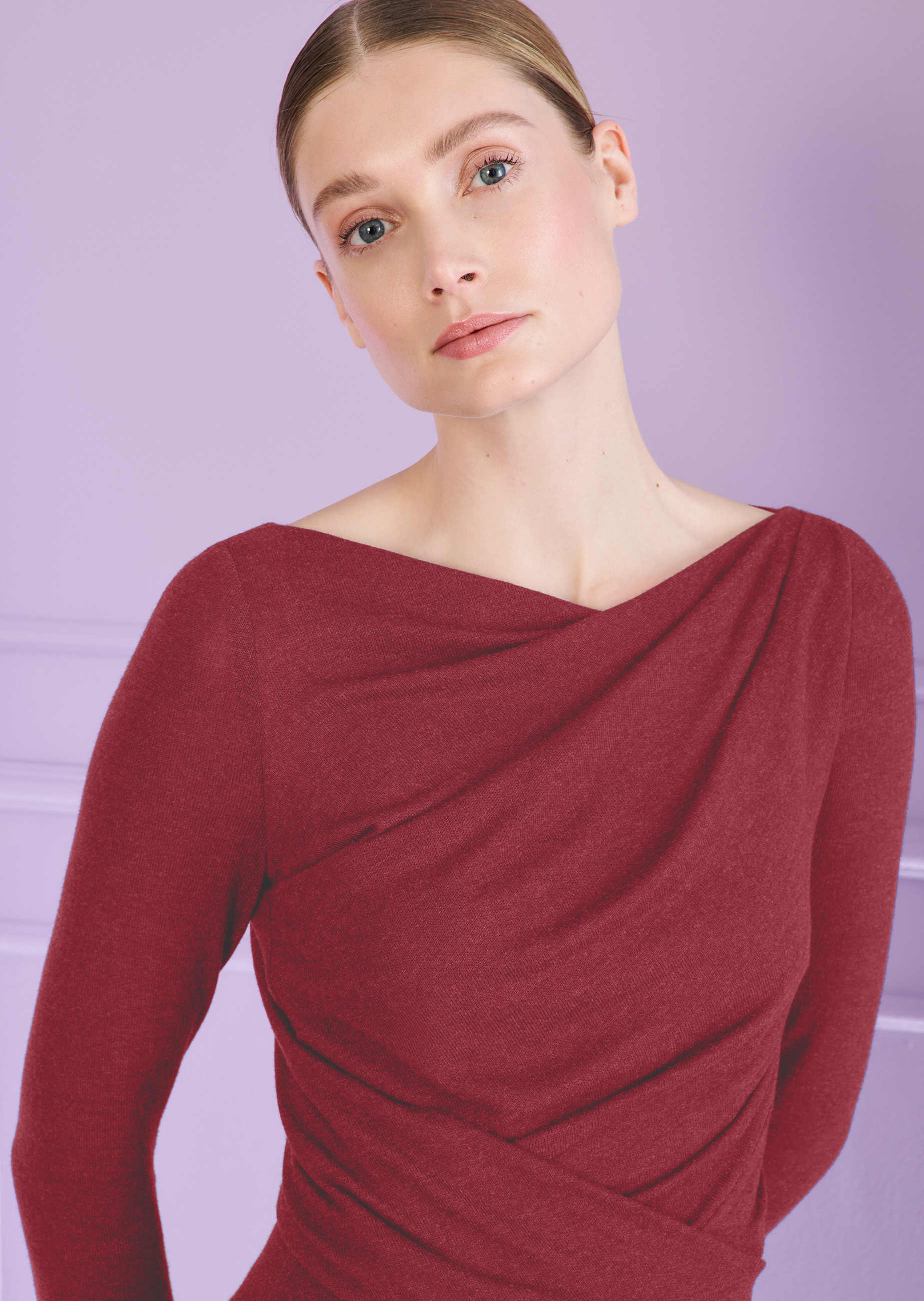 “Every woman should add this dress to their online order,” says Adrian Runhof about this cute daytime number, one of his top favorite dresses. This season it comes in a fashionable midi length. This cute piece is youthful and feminine whatever your age or size. And on top of that, the lightweight jersey and long sleeves make it suitable for cooler weather in the evenings. Whether you wear it for work, dinner, cocktails, or even the theater, team with heels and cheerful jewelry. Even paired with biker boots and a leather jacket, this midi dress will never fail.