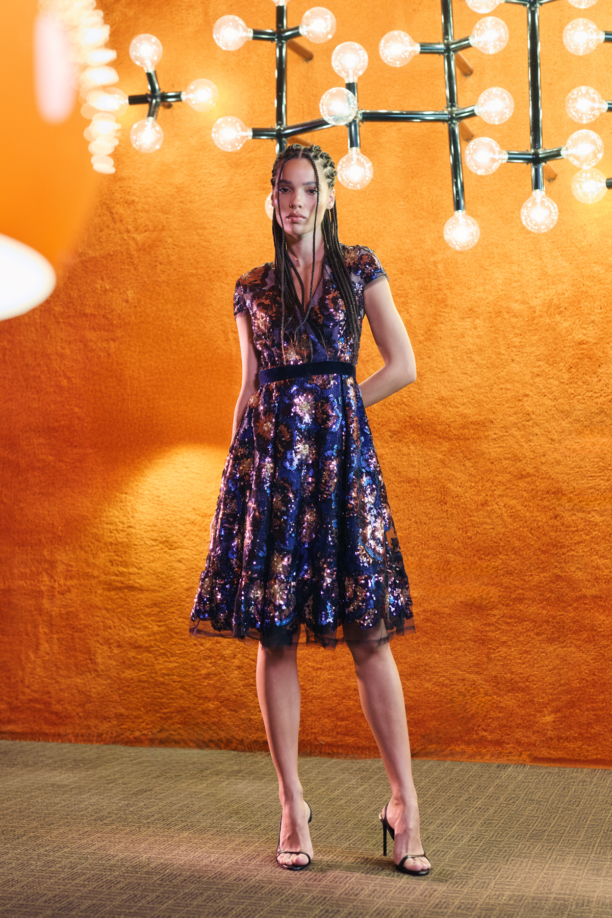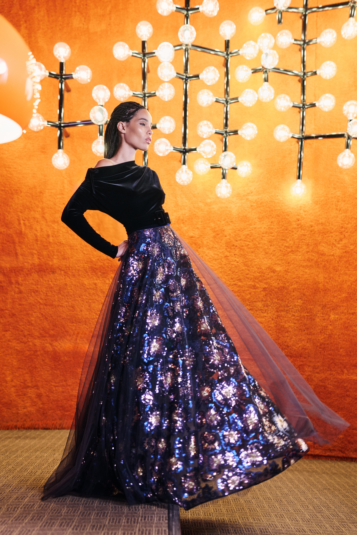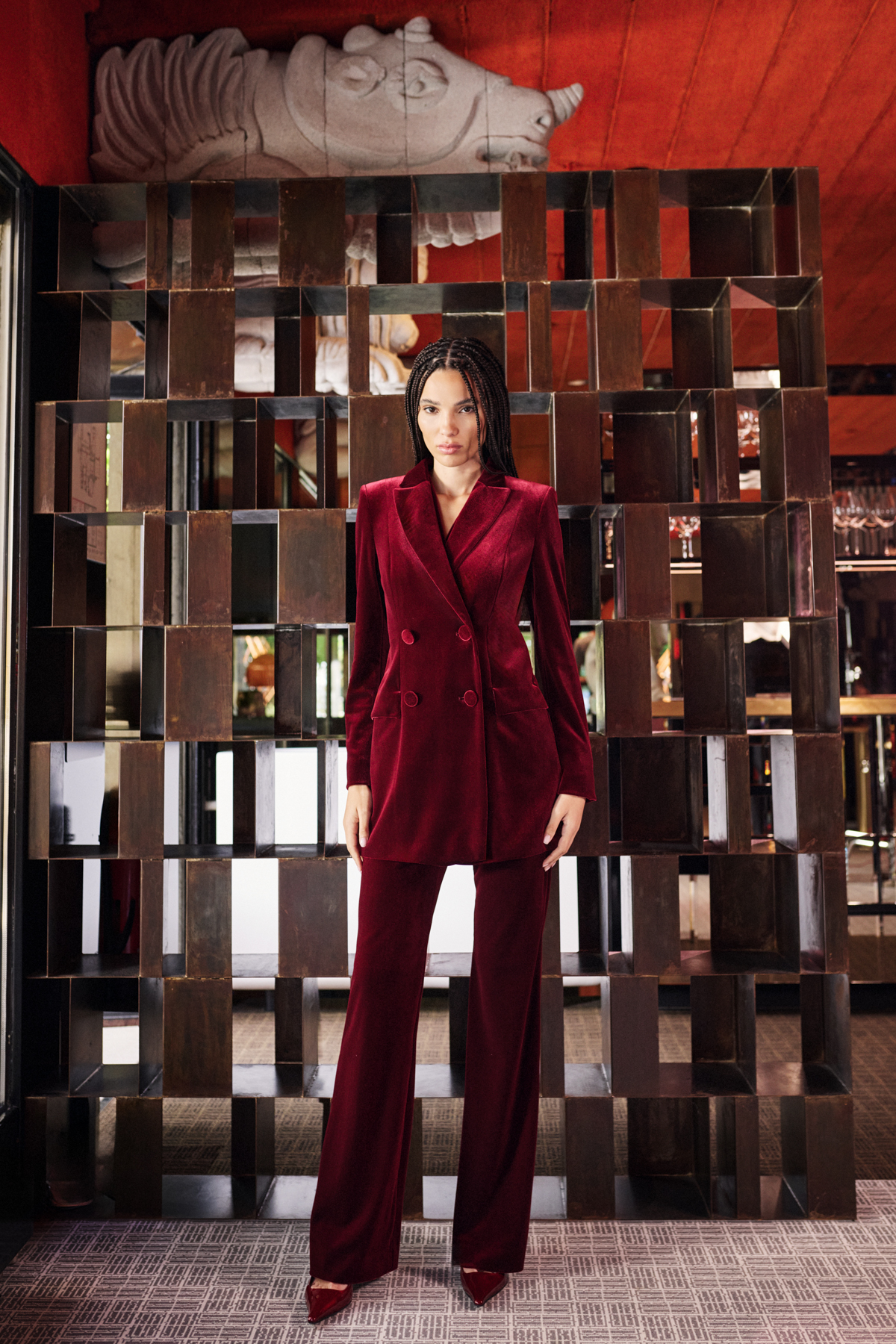 Opulent schimmernder Samt unterstreicht den luxuriösen Anspruch der Kollektion. Neue Silhouetten – etwa ein Anzug mit doppelreihigem Blazer und weiter Hose oder ein schulterfreier Jumpsuit – bieten eine spannende Mischung aus Komfort und Eleganz. Je nach Styling entsteht ein unaufdringlich eleganter Look oder ein expressiver Auftritt mit farbintensiven Akzenten.
