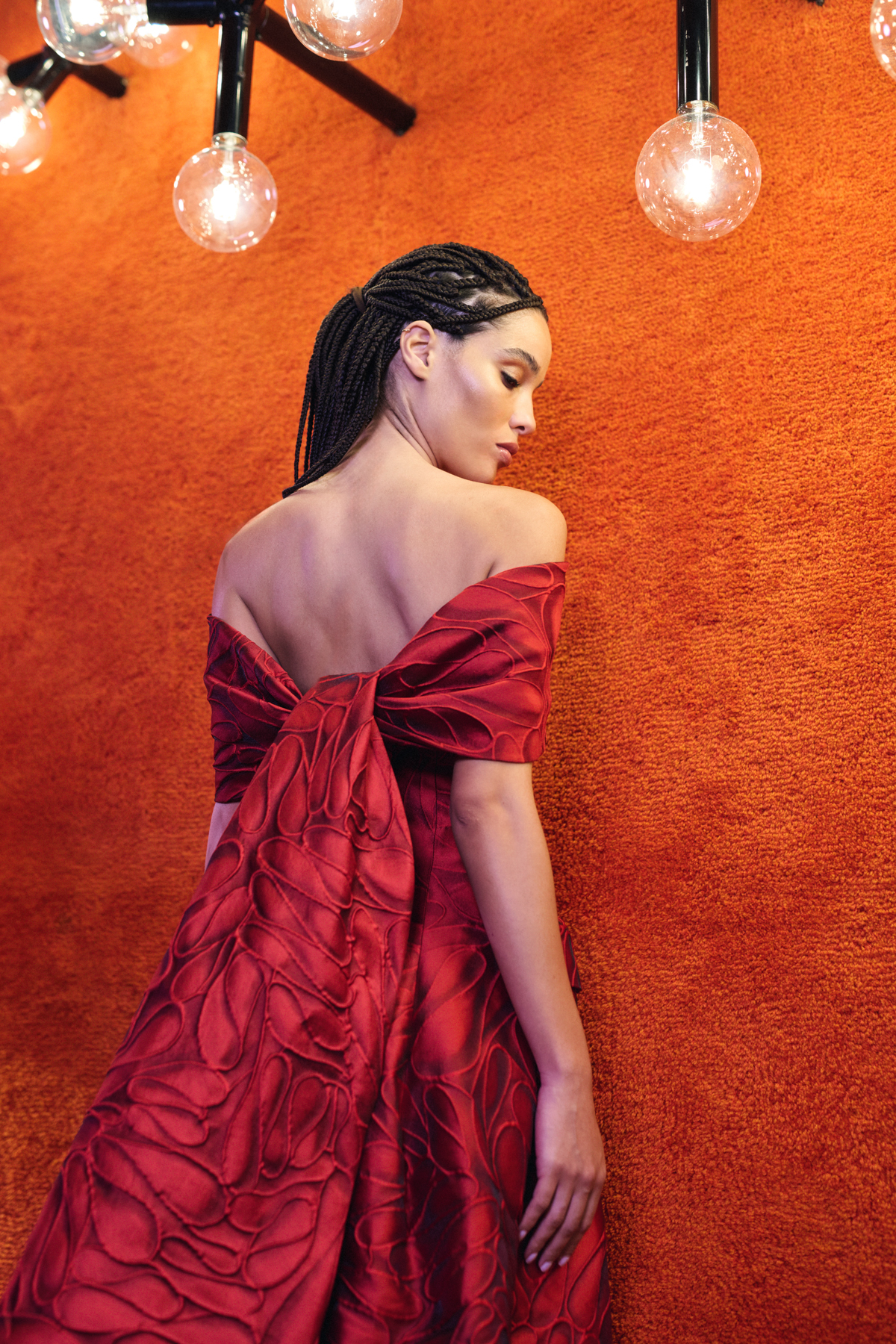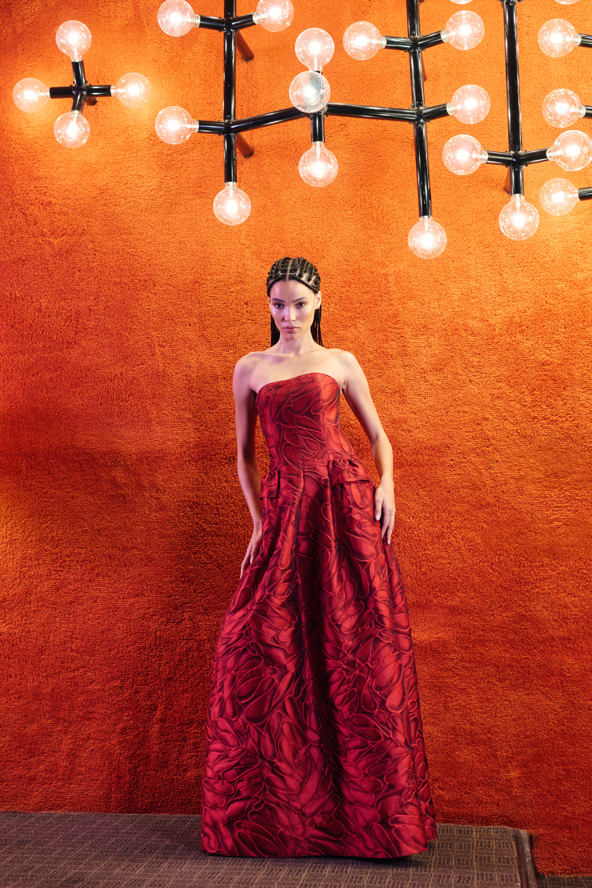 Den Begriff der Robe denkt TALBOT RUNHOF in dieser Saison besonders vielseitig. Luxuriöse Jacquards bleiben ein fester Bestandteil der Kollektion und kommen in modernen Silhouetten zum Einsatz – opulent, strukturiert und raffiniert verarbeitet. Neu hinzu kommen Roben aus mehrlagigem Tüll, die eine besondere Leichtigkeit und Transparenz ausstrahlen. Durch verschiedenfarbige Schichten entstehen subtile Schattierungen und eine außergewöhnliche Tiefe. Dezente Paillettendetails setzen dabei zusätzliche, funkelnde Akzente.